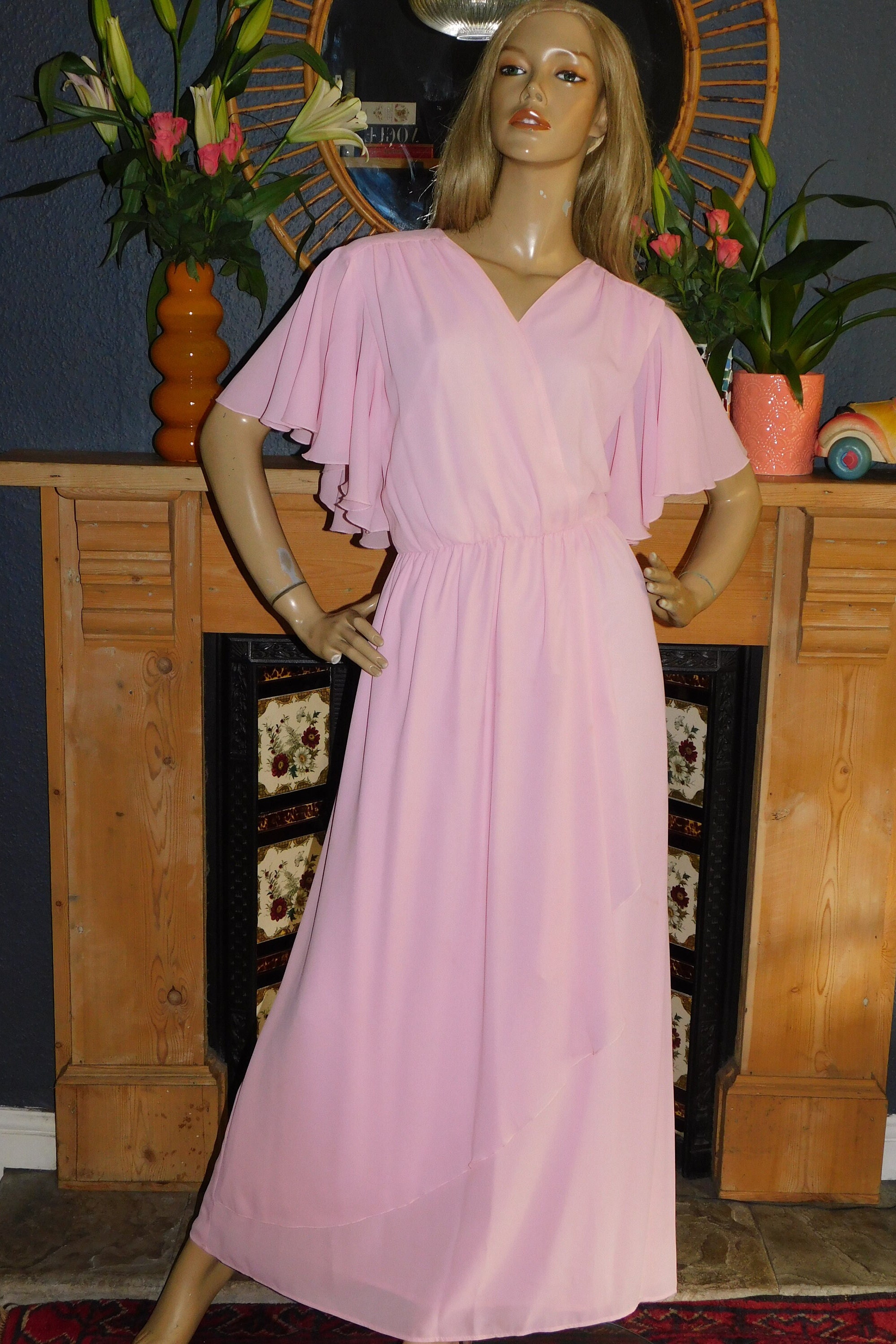 Vintage 70s BLUSH Pink WATERFALL Pleat Maxi Evening Dress 12-14 M 1970s Party Ruffles