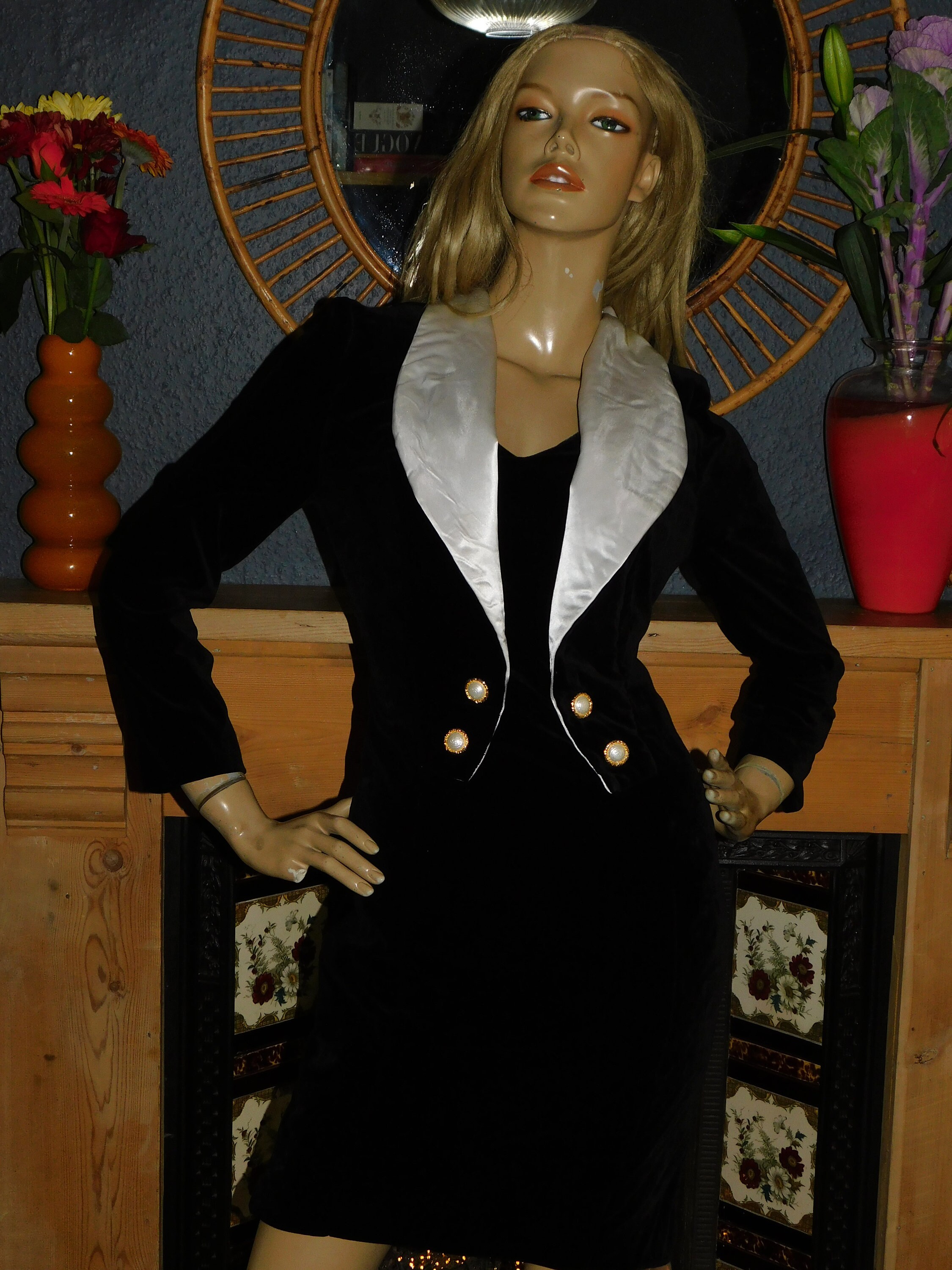 Avant Garde 80s Cocktail dress in black with creamy white oversized lapels and decorative buttons to waist