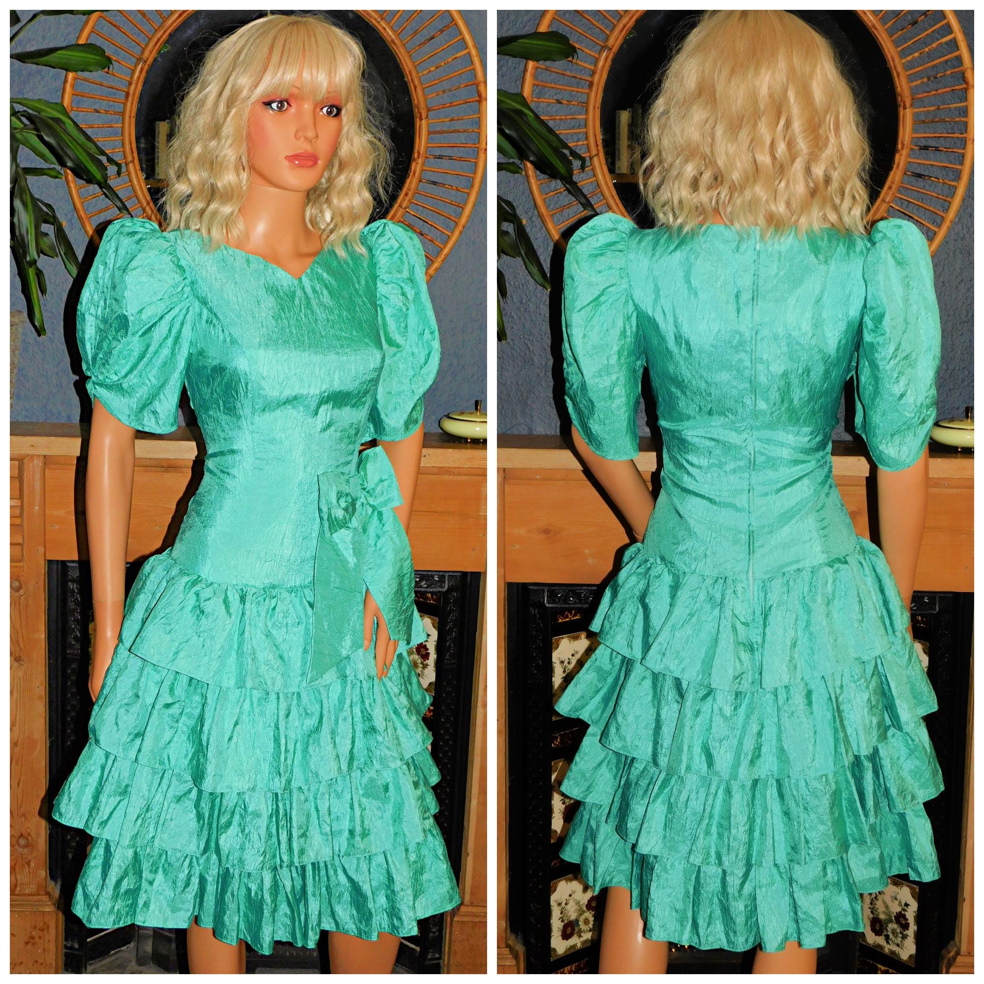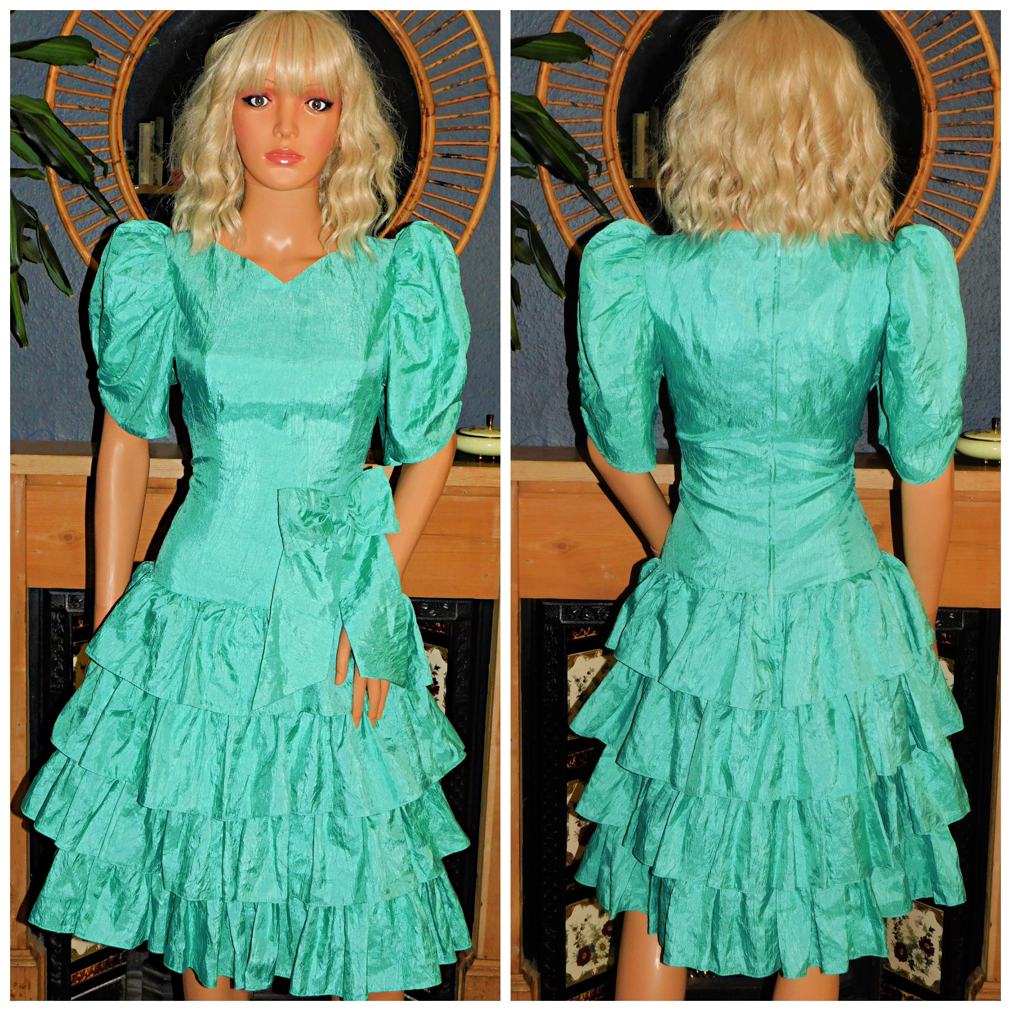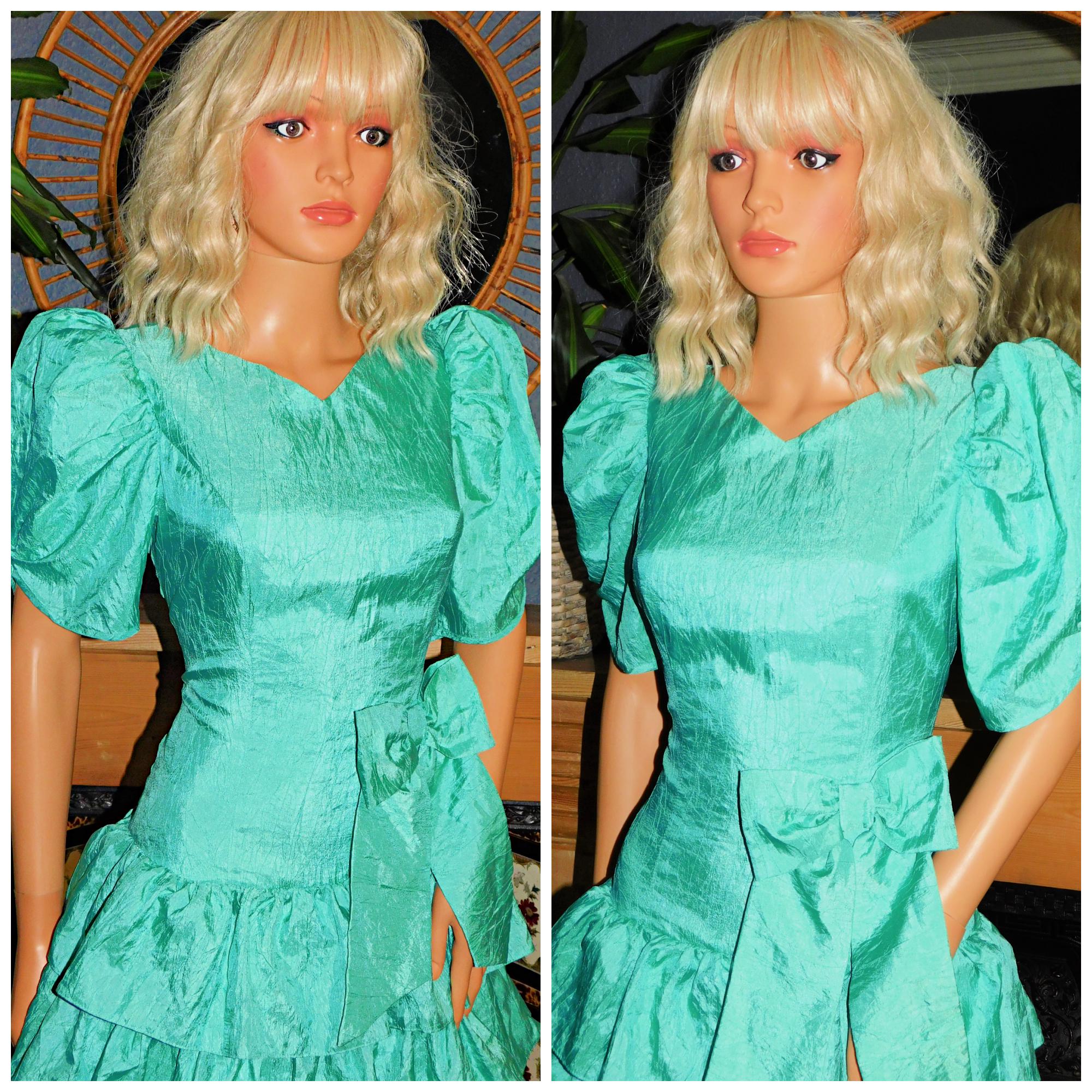 Very dramatic Eighties Princess prom dress in turquoise/peppermint green (fabric has a crinkled texture)
