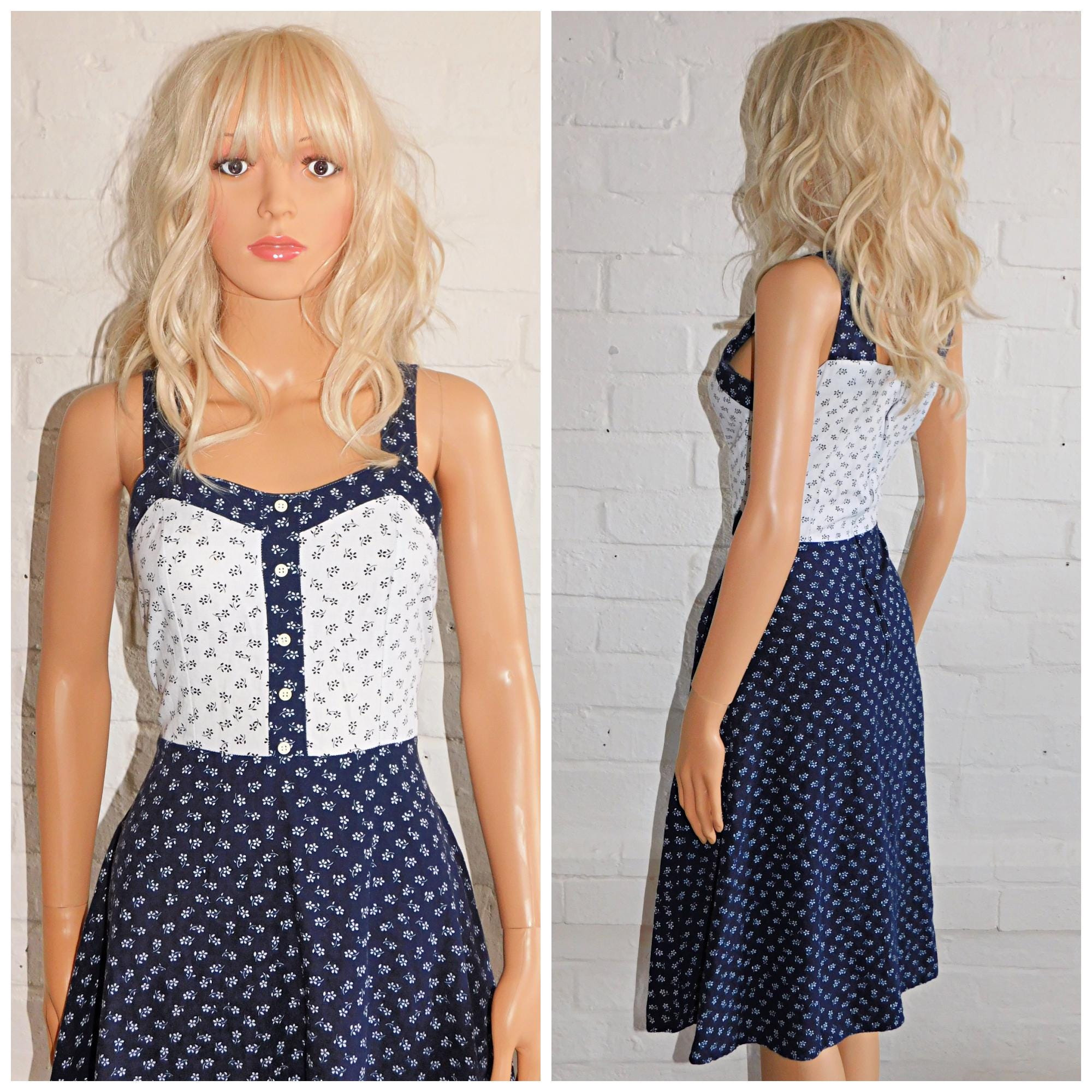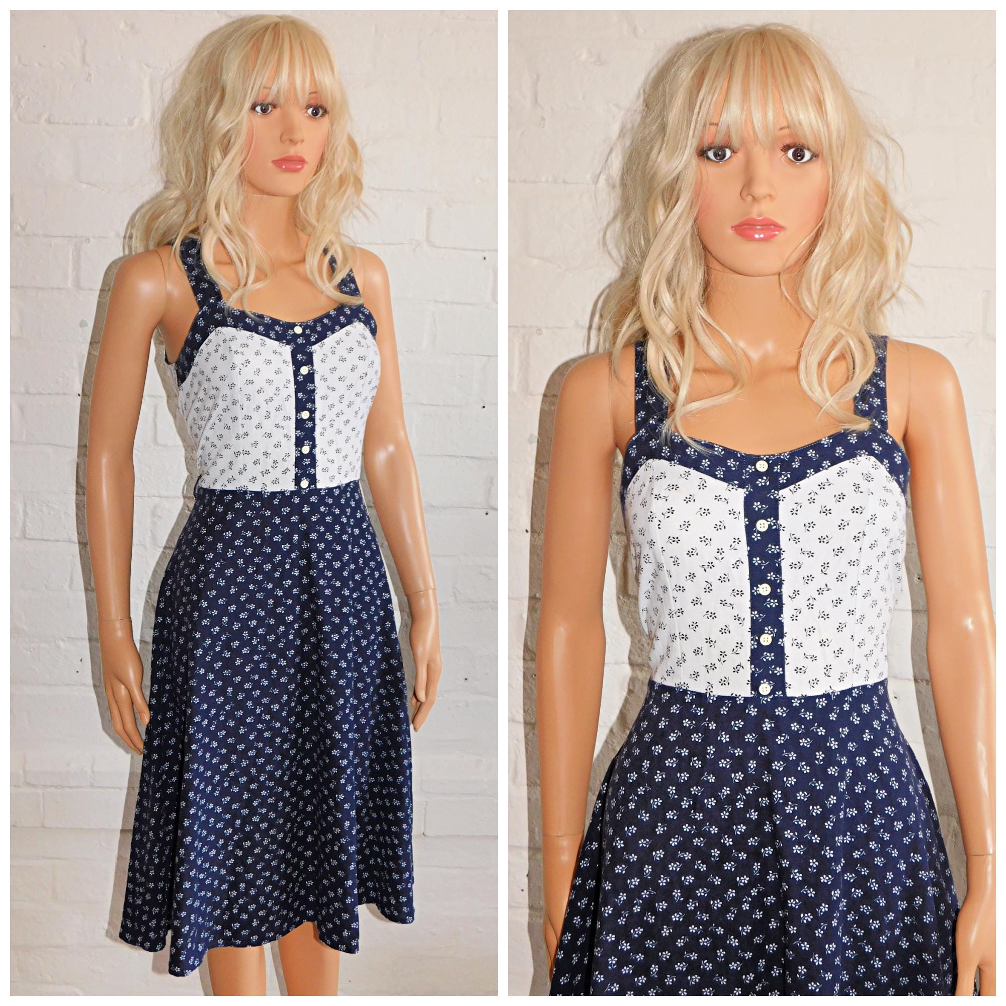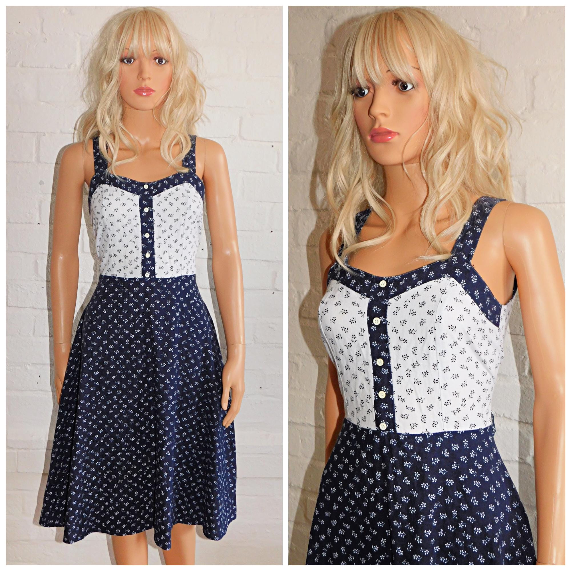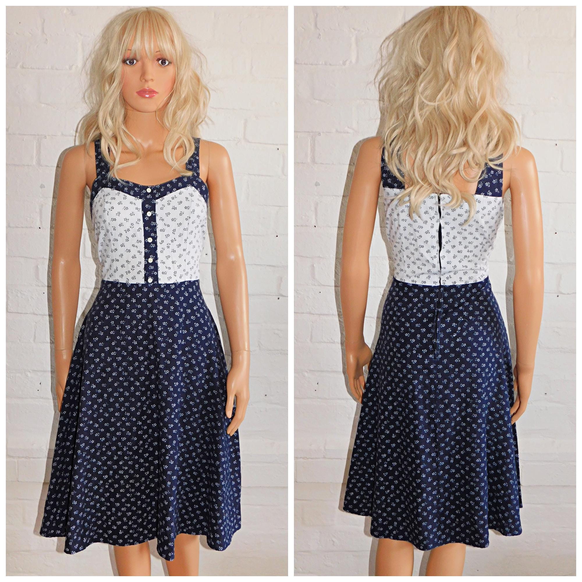 Vintage 60s Navy White DITSY FLORAL Cotton Contrast Pinnafore Dress 10 S 1960s Pin Up Sun Summer