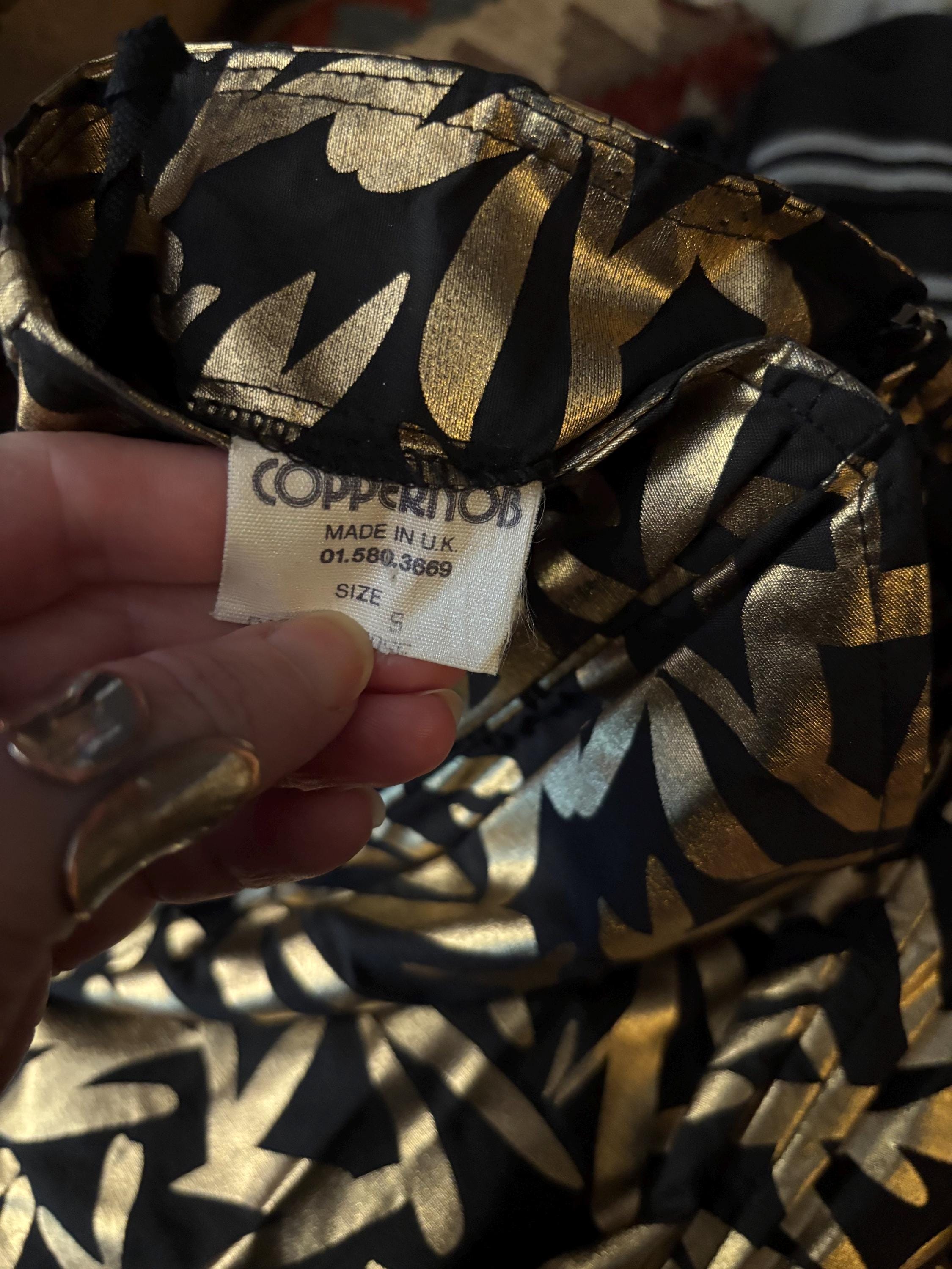 Classic Eighties mini cocktail dress in a metallic gold/black abstract print