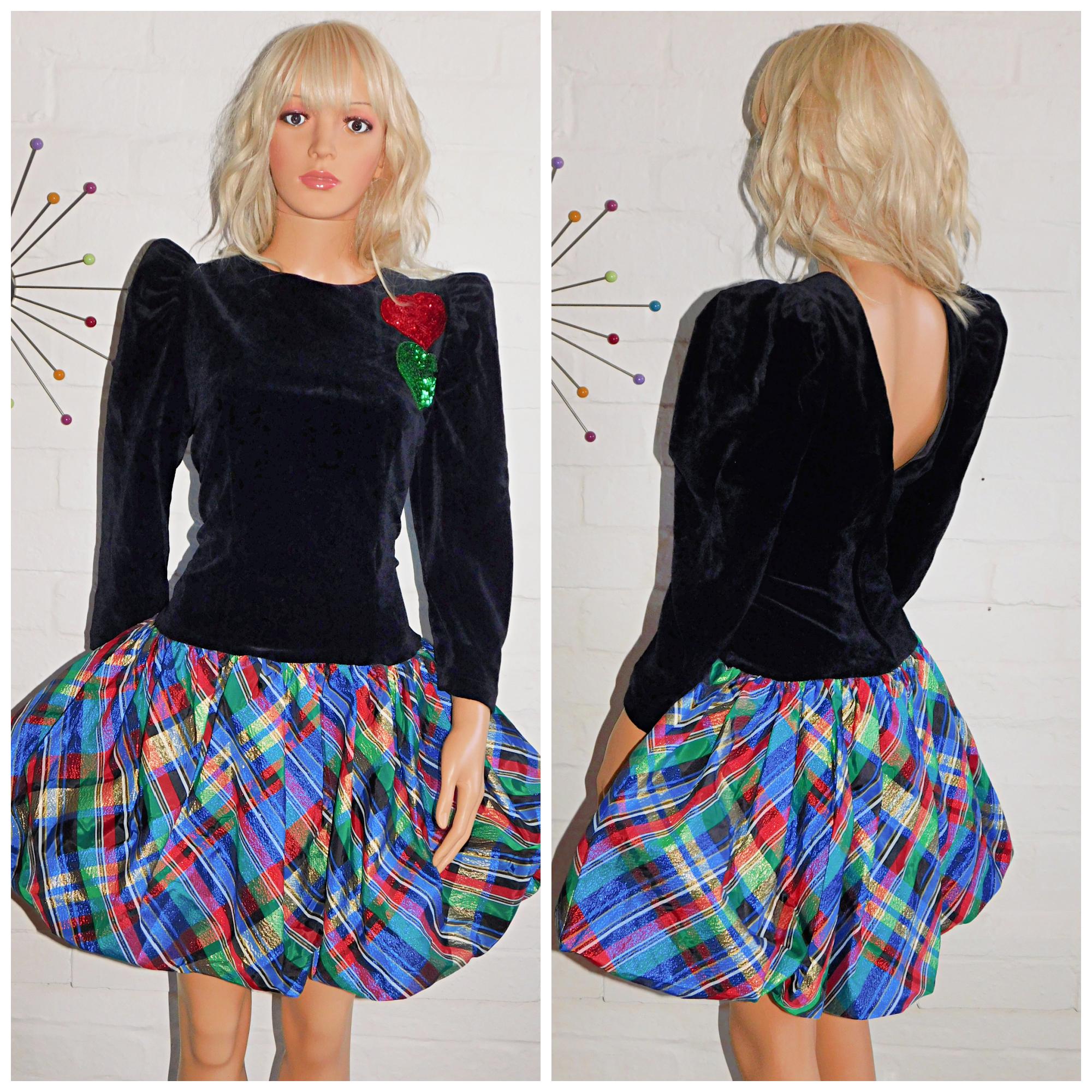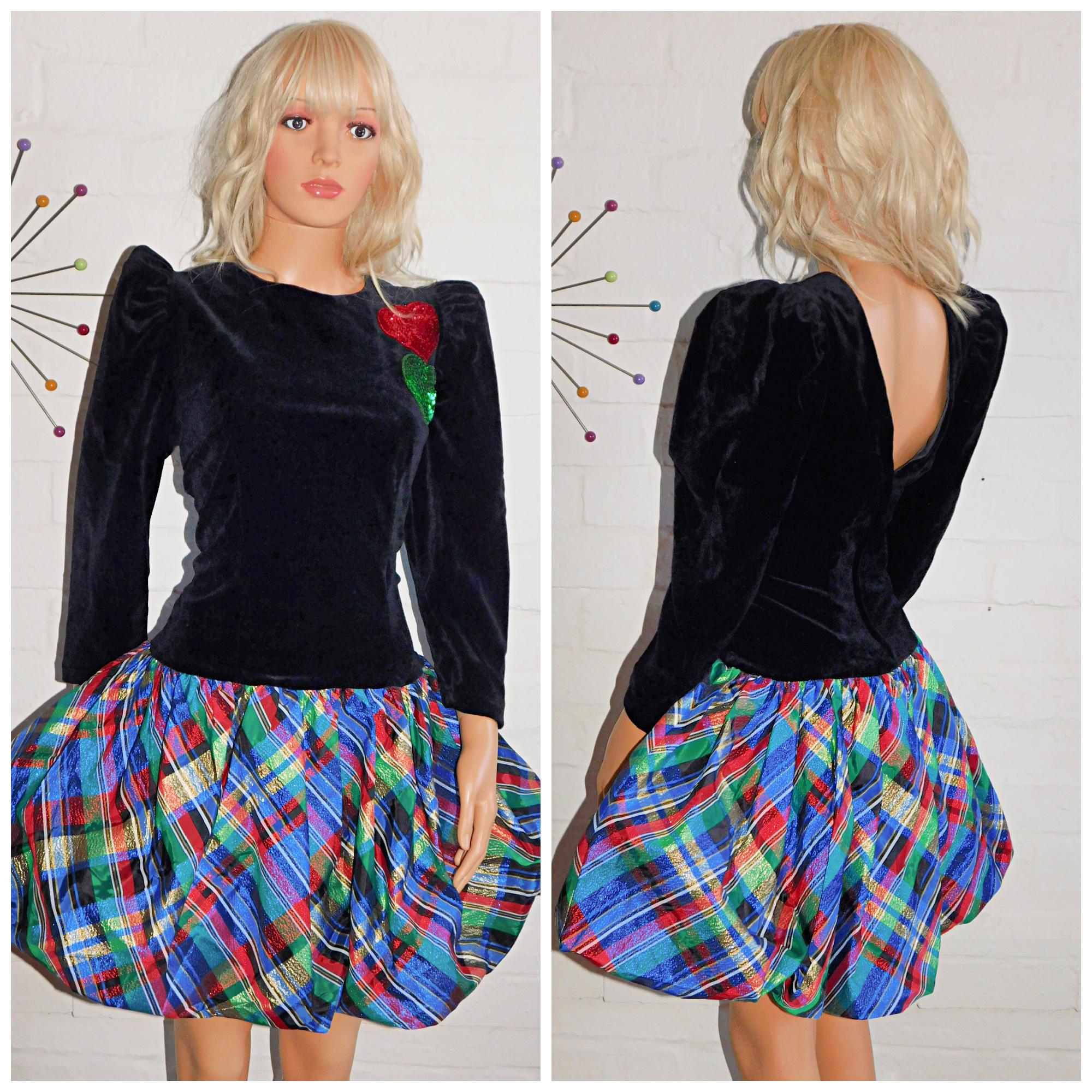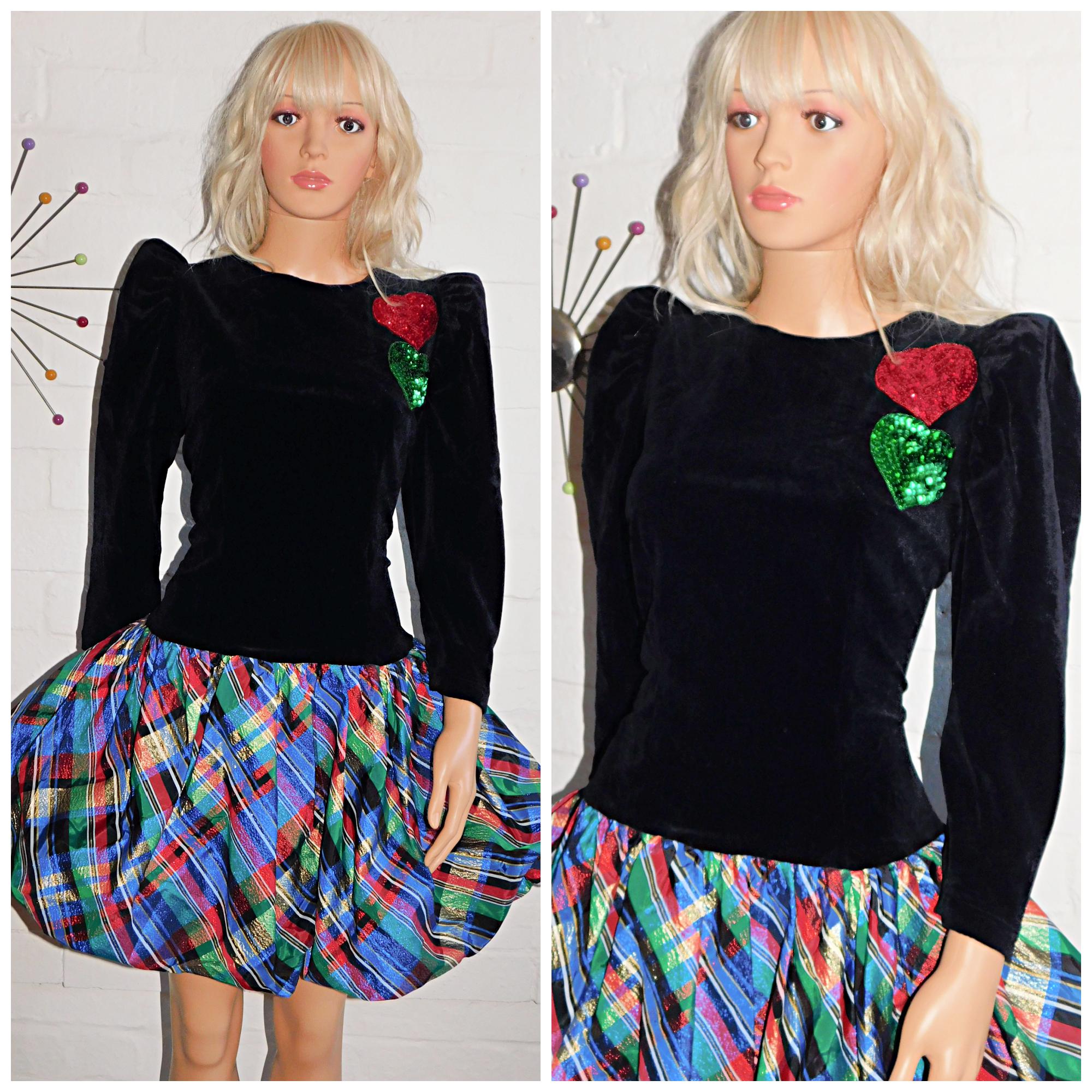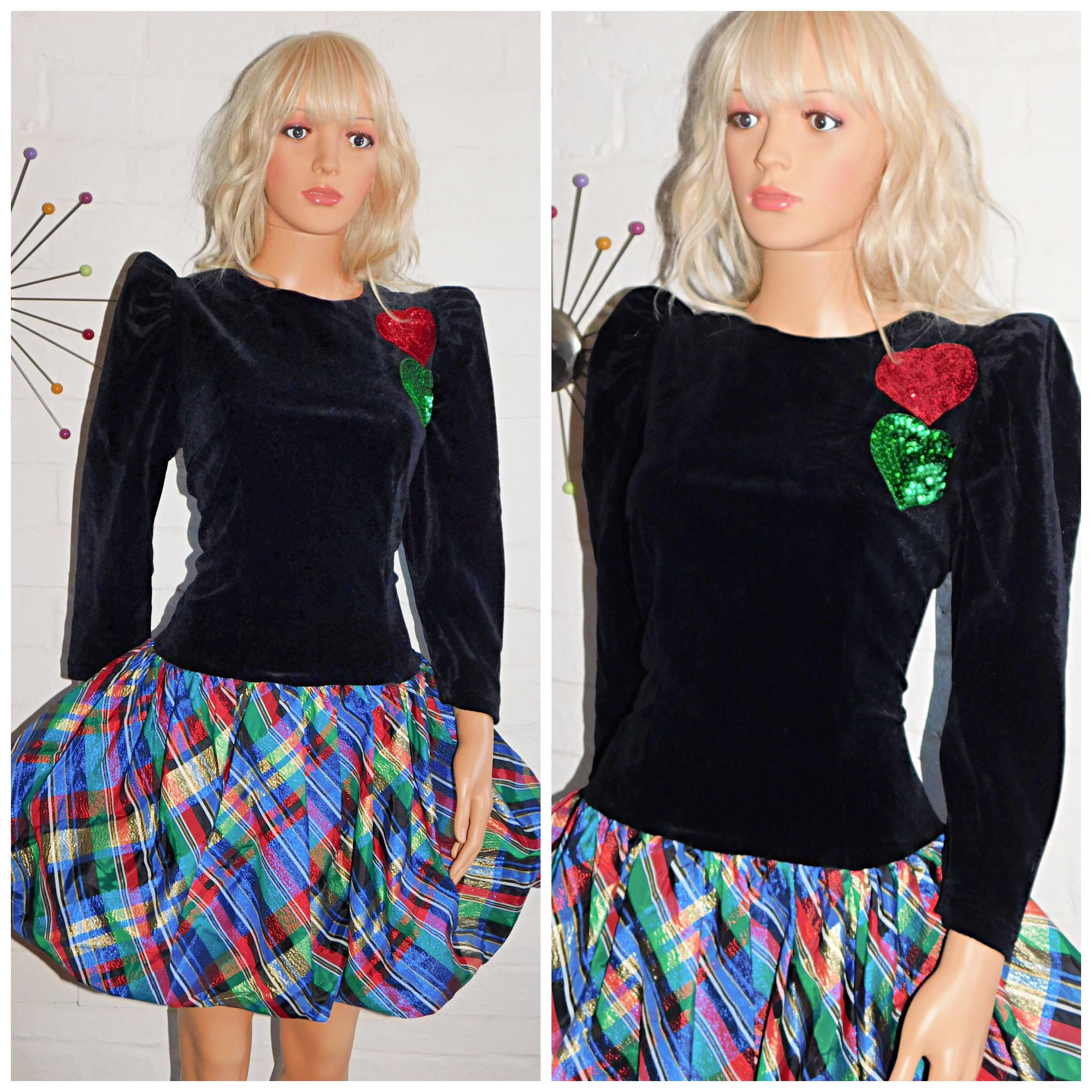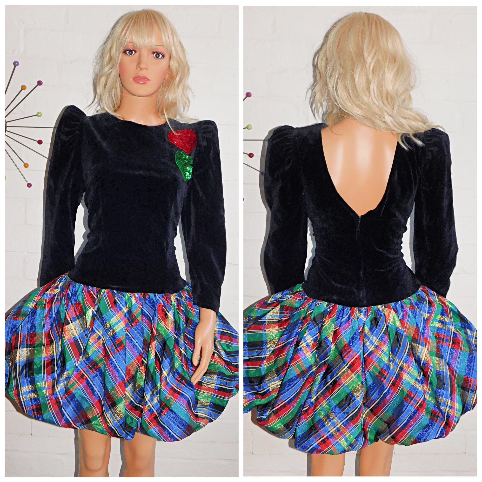 Fabulous Original 80s mini prom dress in black velvet with contrasting tartan skirt