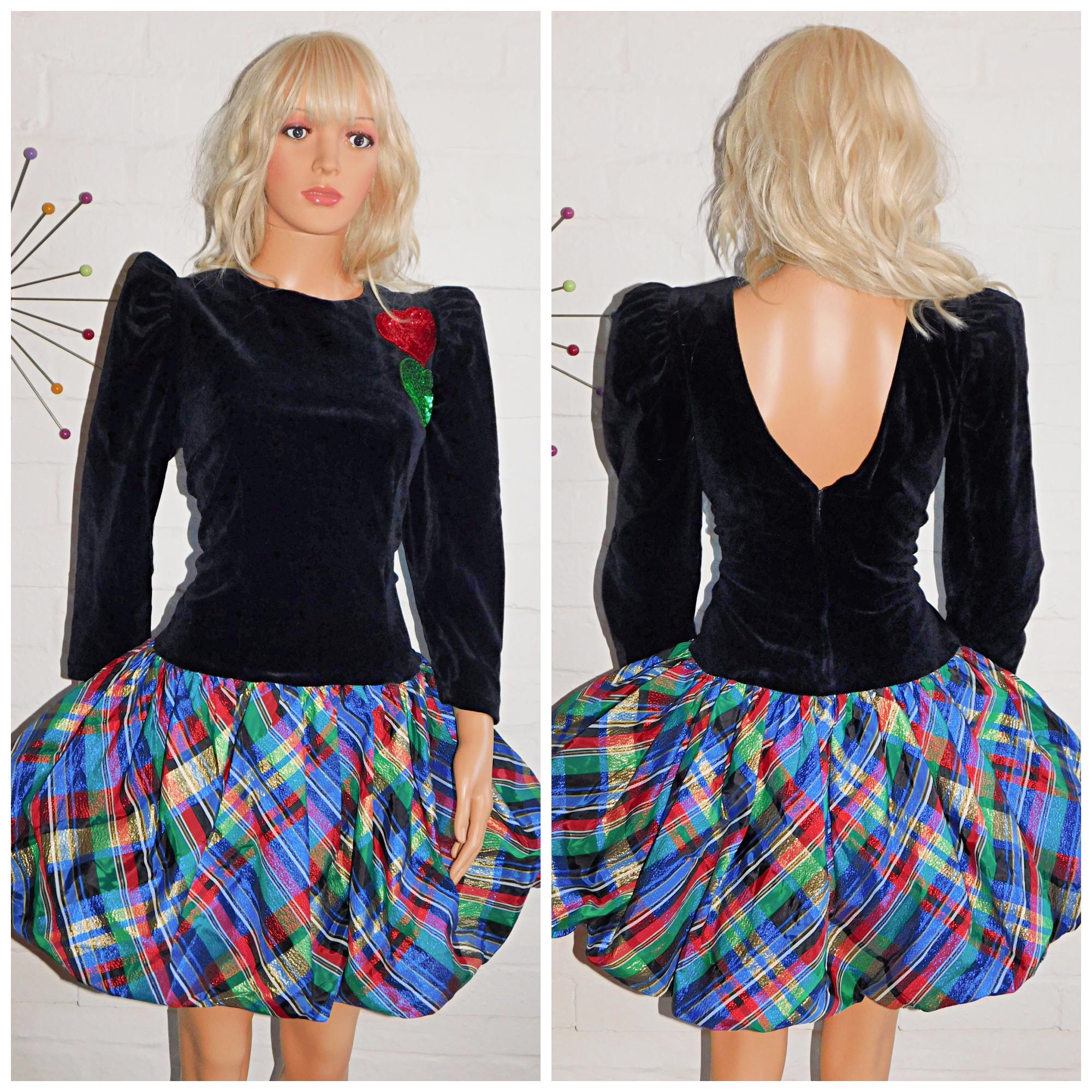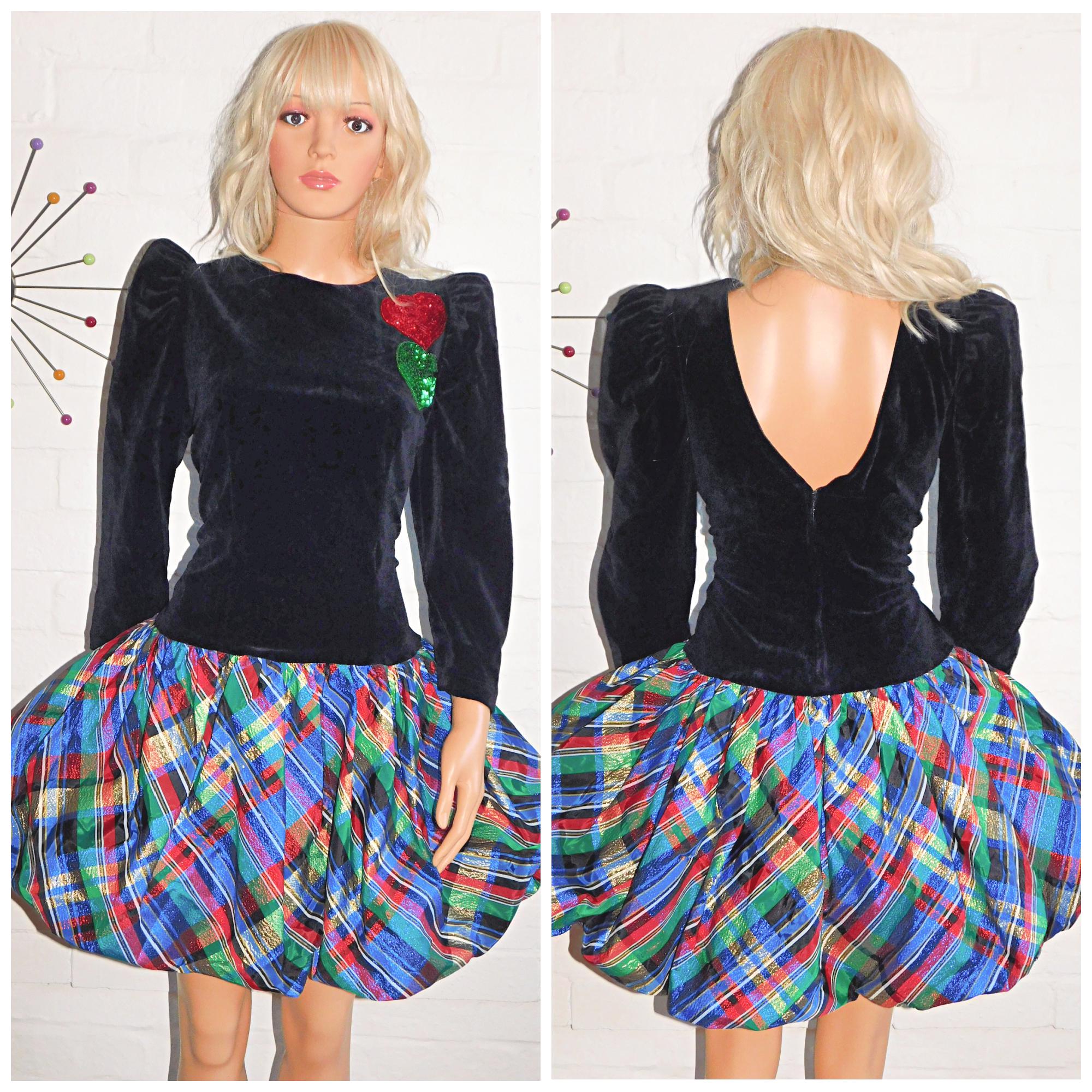 Vintage 80s Black Velvet METALLIC TARTAN BUBBLE Hem Mini Prom Party Dress 12 M 1980s Kitsch Puffball