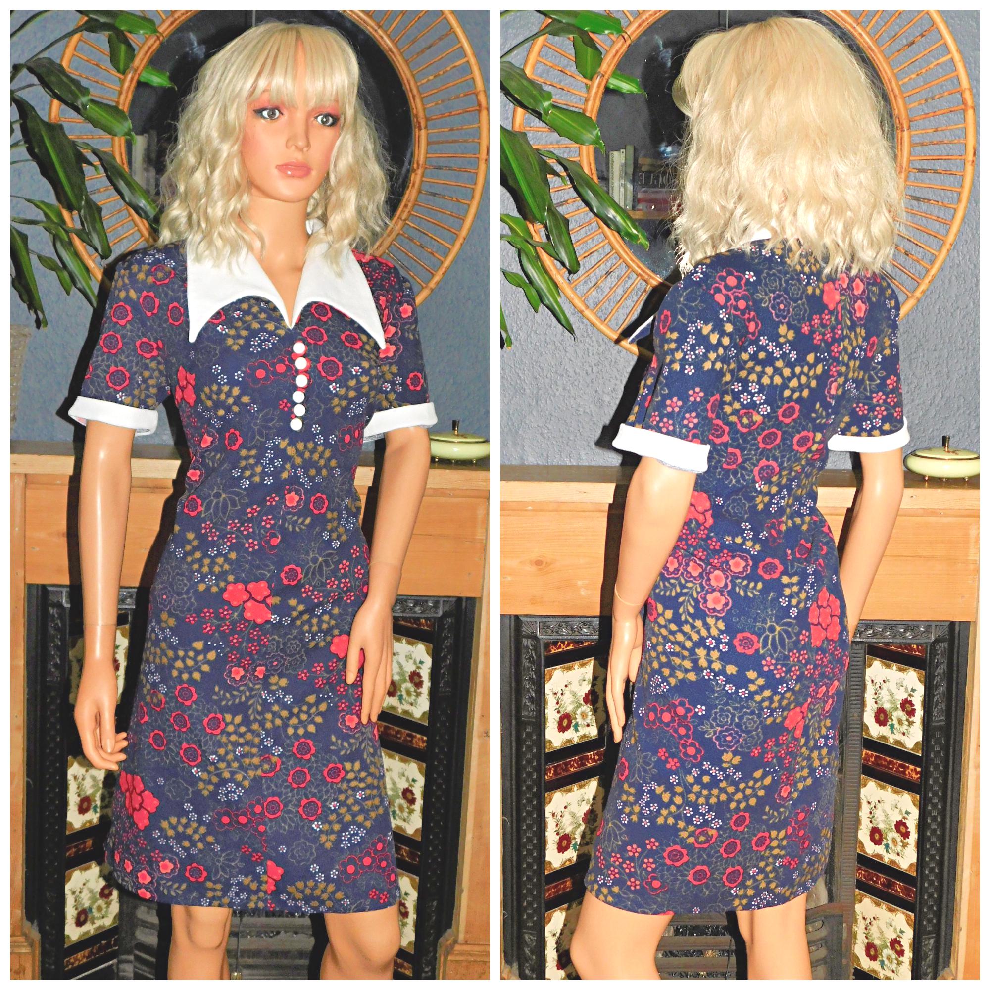 Vintage 60s Navy FLORAL Contrast COLLAR CUFFS Mod Dress 16 18 L 1960s Dolly Modette