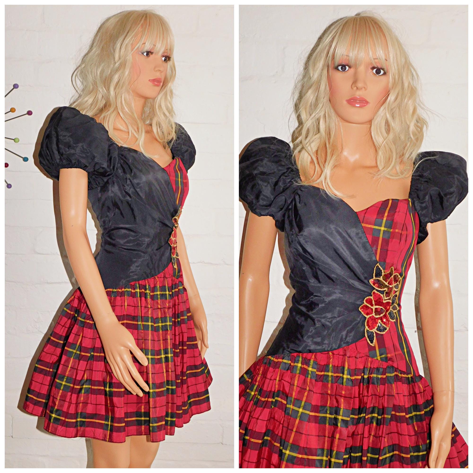 Fabulous 80s mini prom dress in black with contrasting red tartan