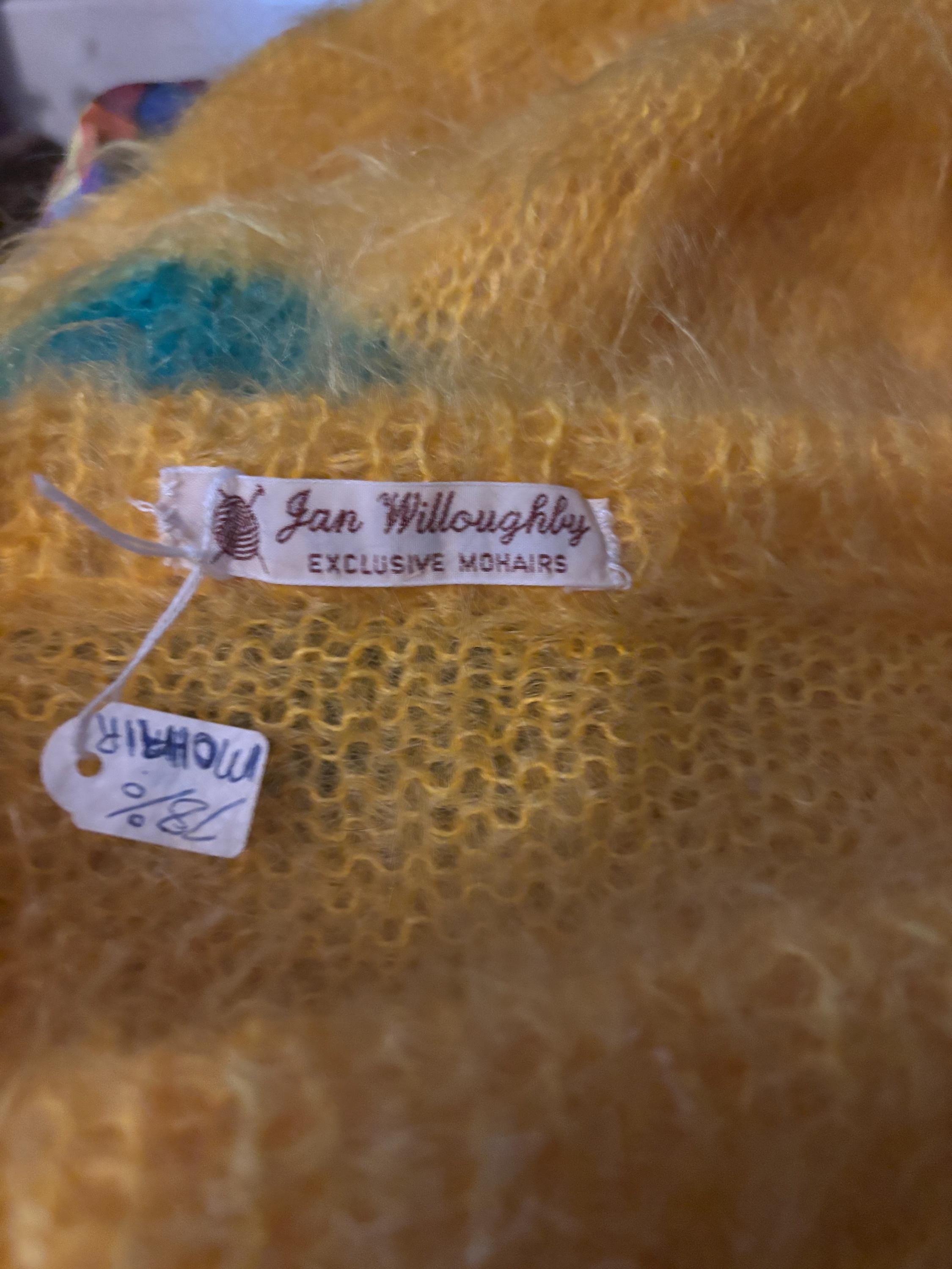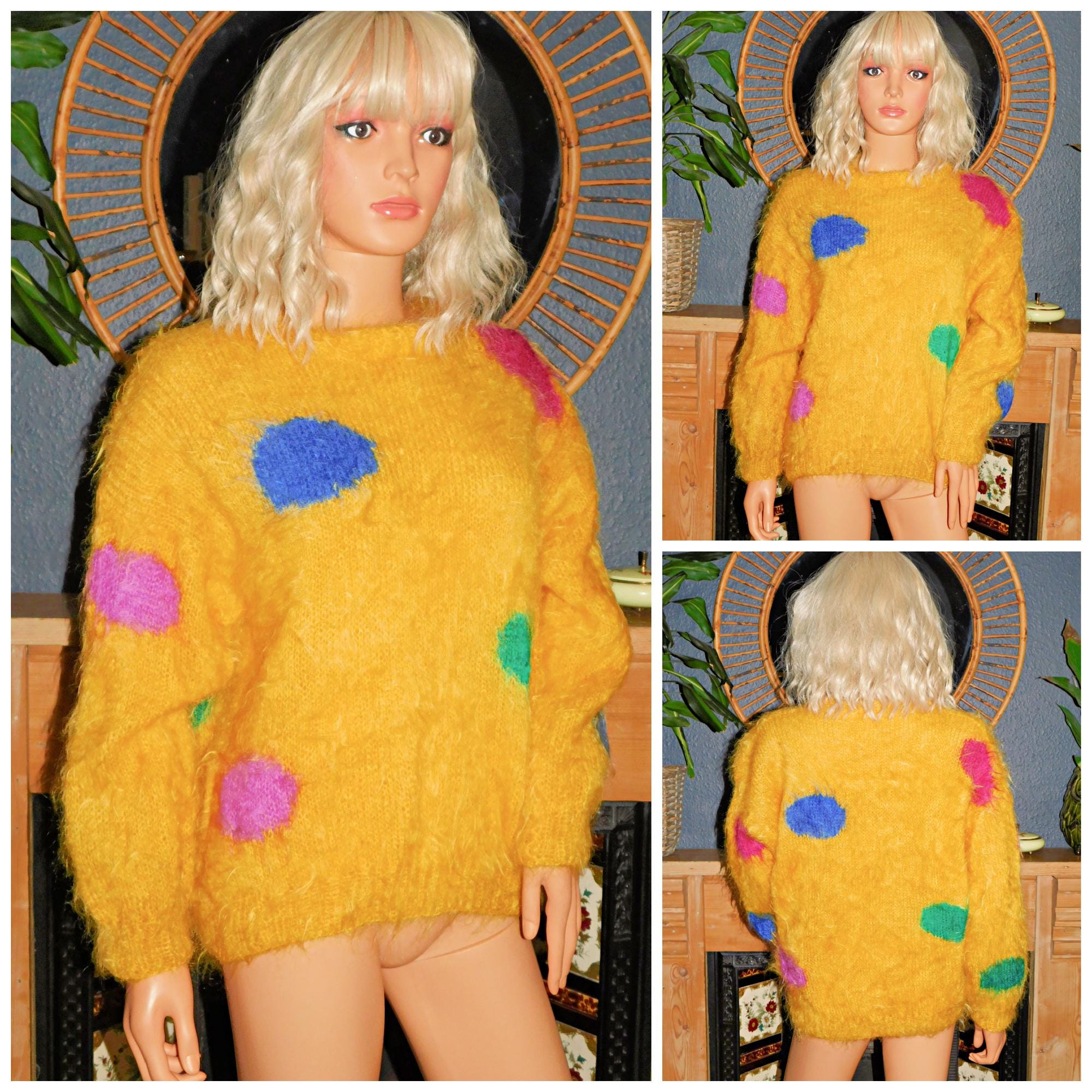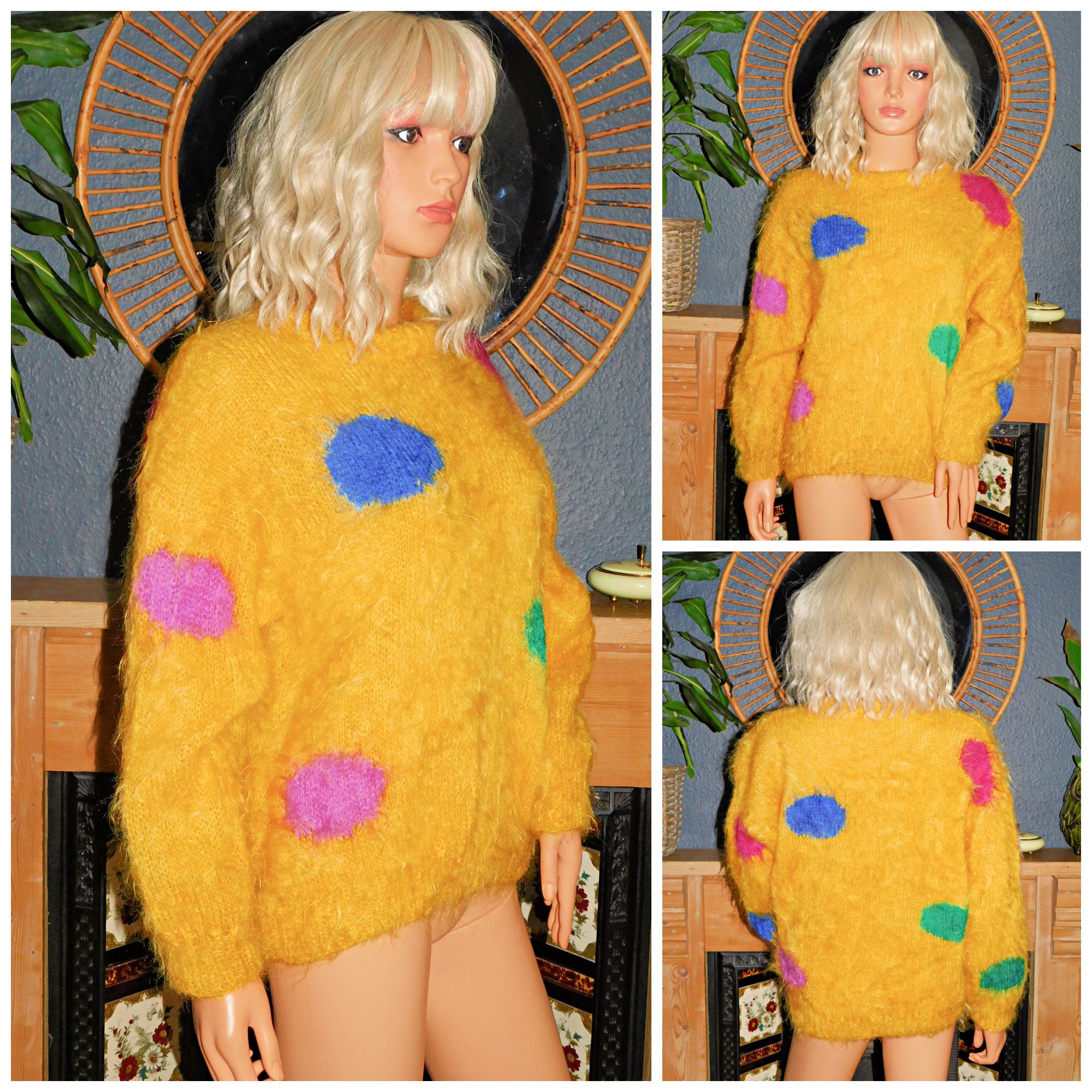 Vintage 80s Yellow SPOTTY SHAGGY MOHAIR Sweater Jumper S M 1980s Slouchy Hand Knit