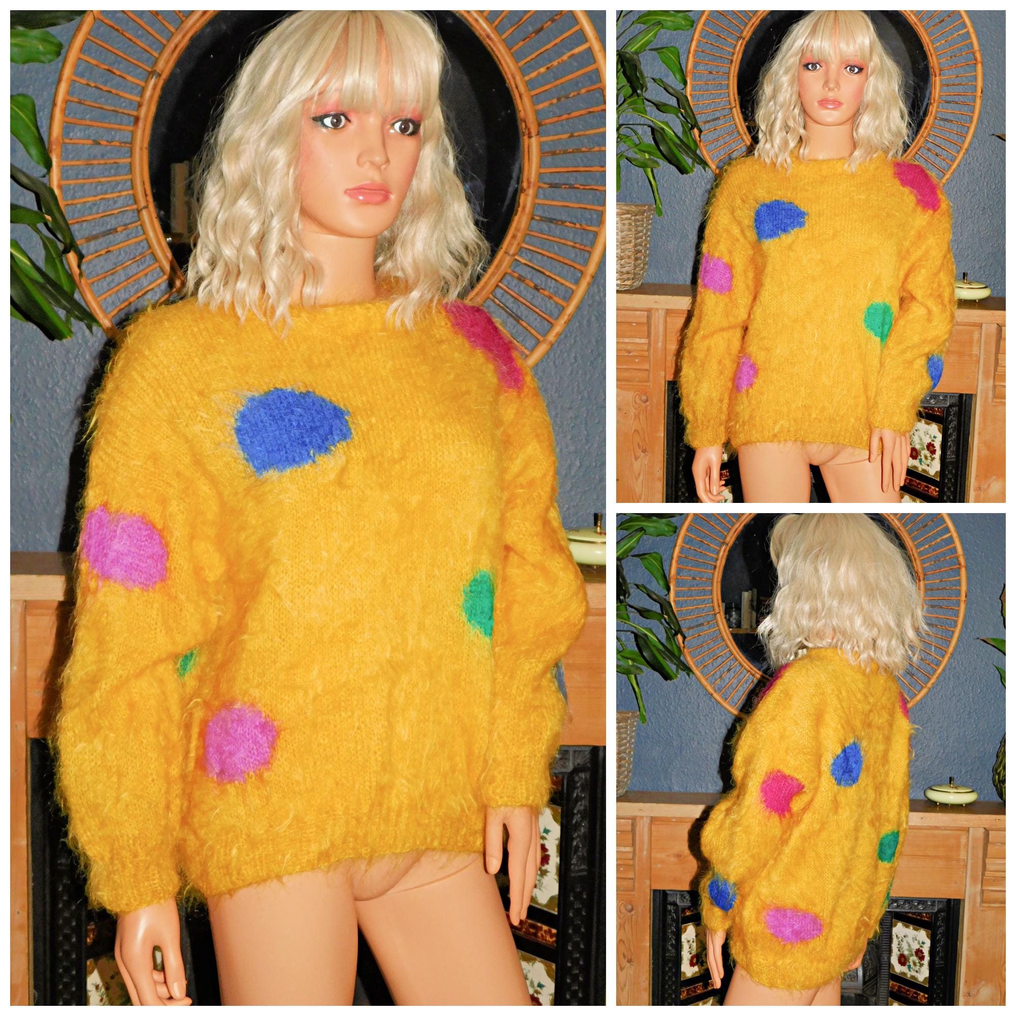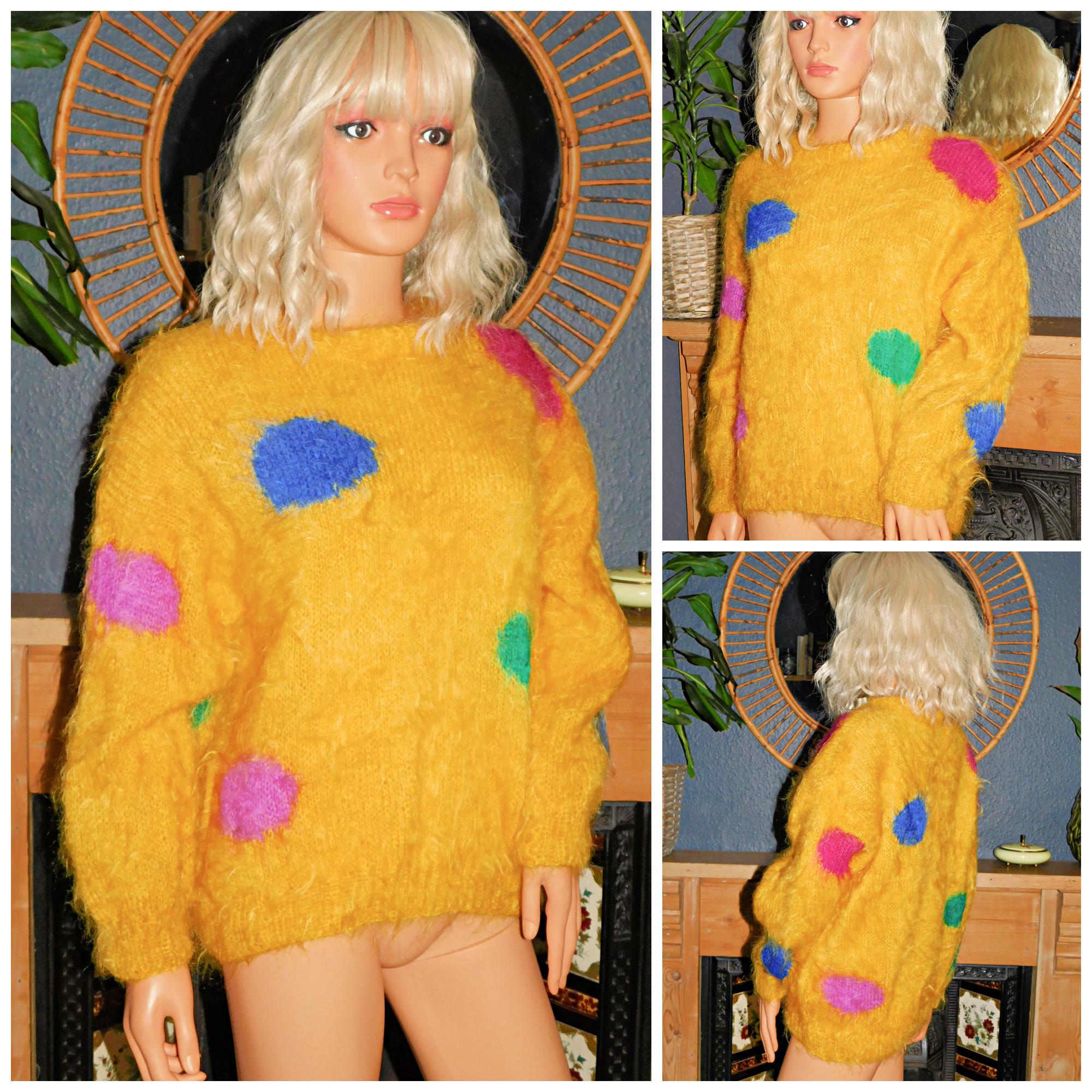 Eighties cosy shaggy mohair jumper in bright yellow with multicoloured spots!