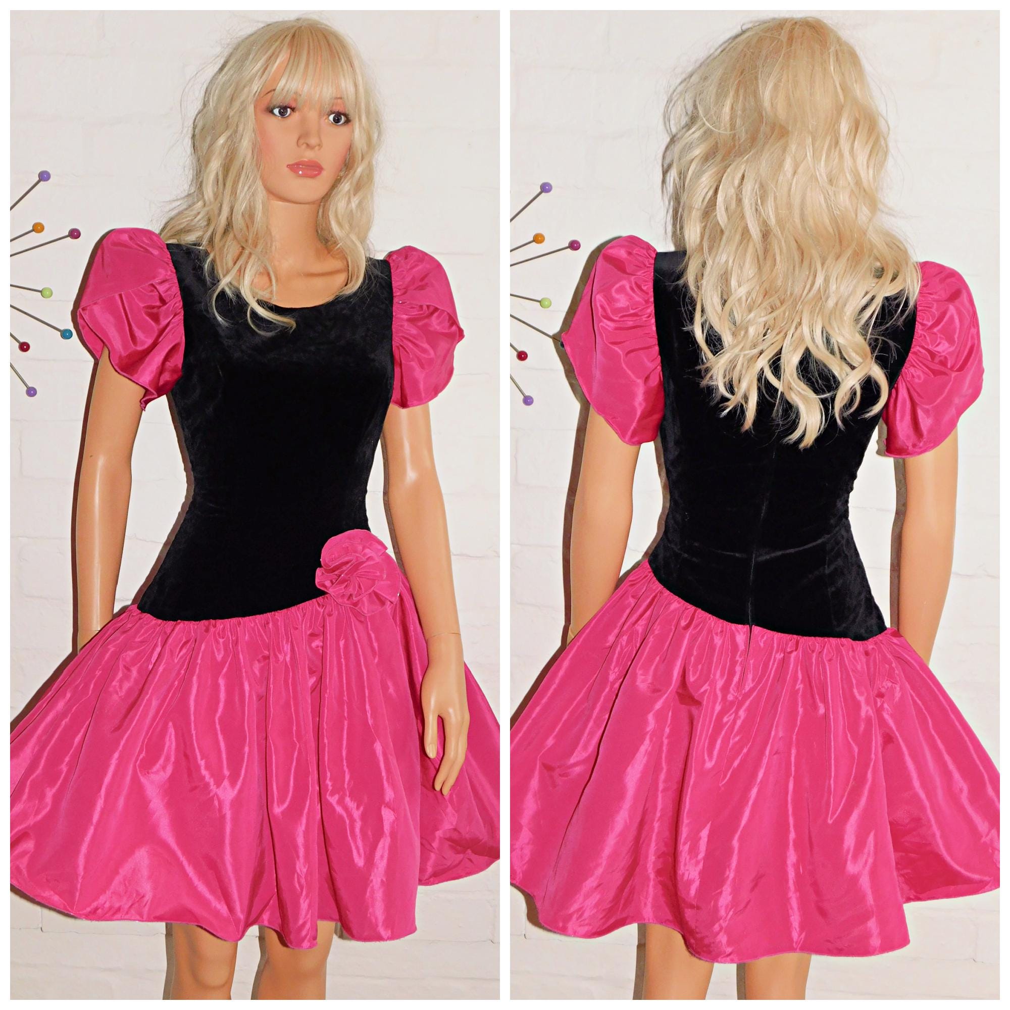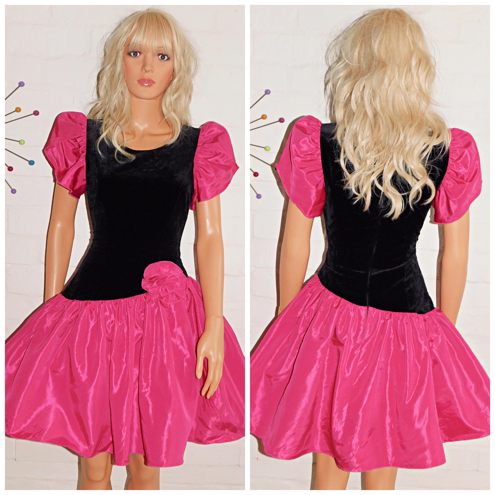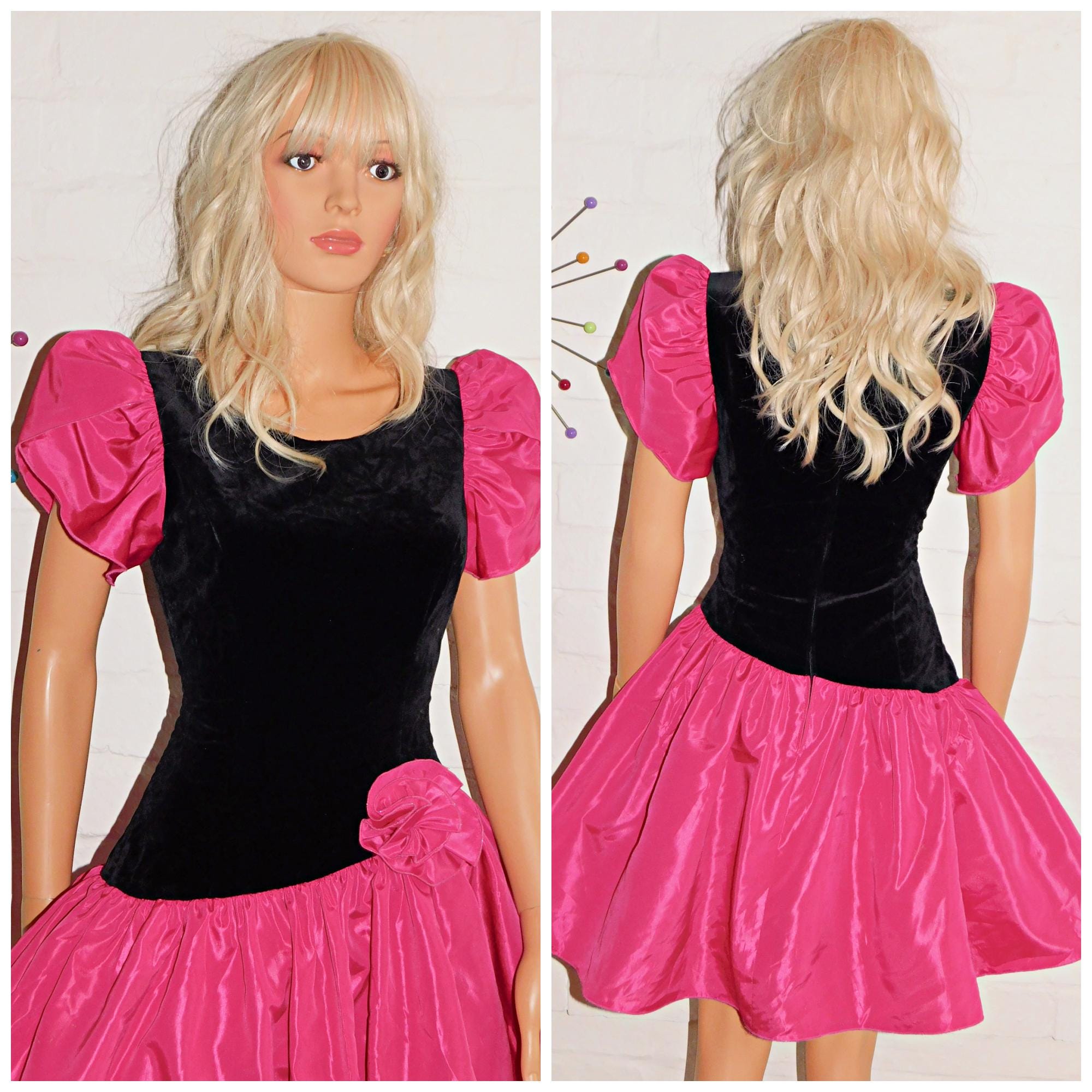 Vintage 80s Black BUBBLEGUM Pink Velvet Drop Waist PROM Party Dress 8 S 1980s Kitsch Cocktail