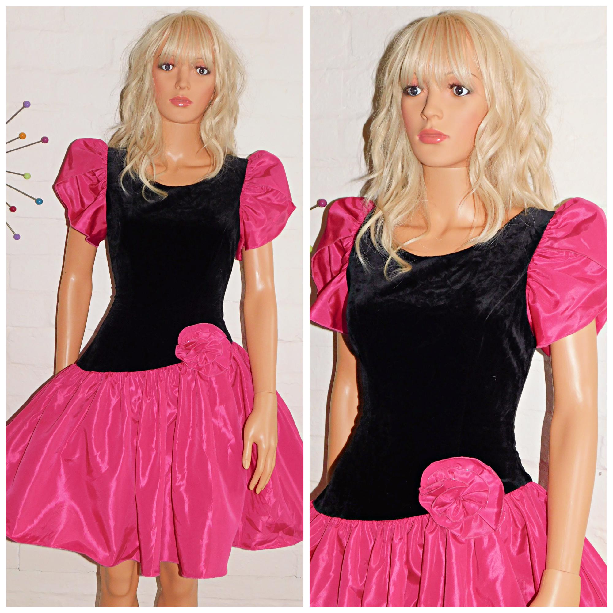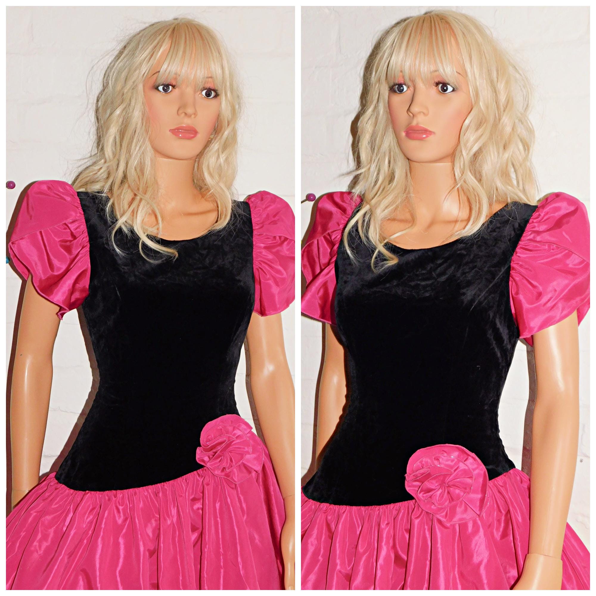 Gorgeous Eighties prom dress in black velvet with contrasting bright bubblegum pink skirt/sleeves
