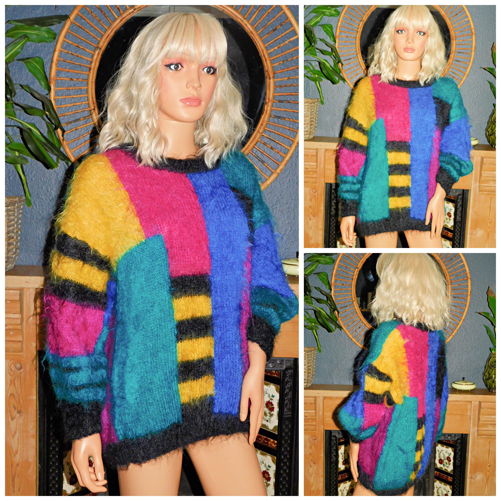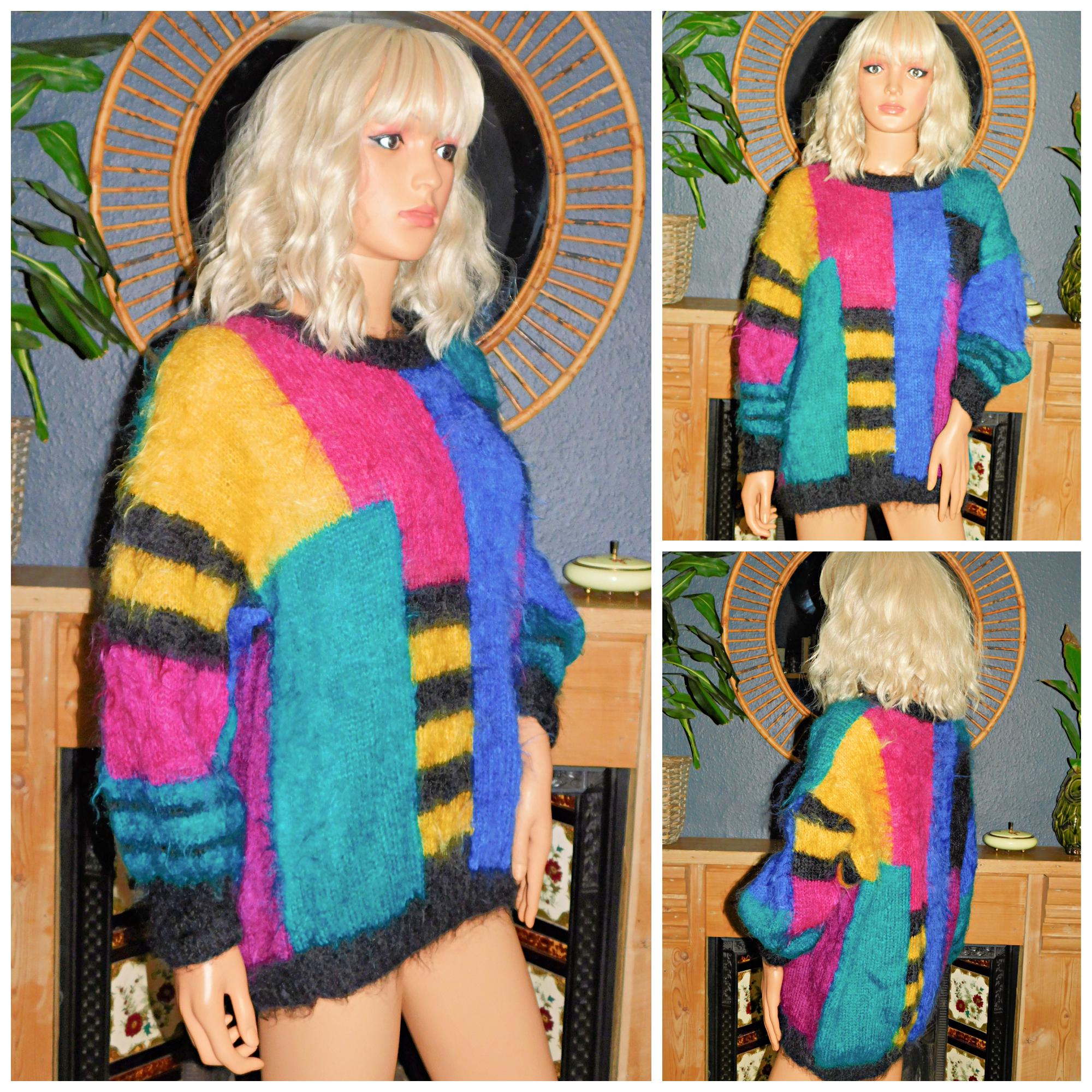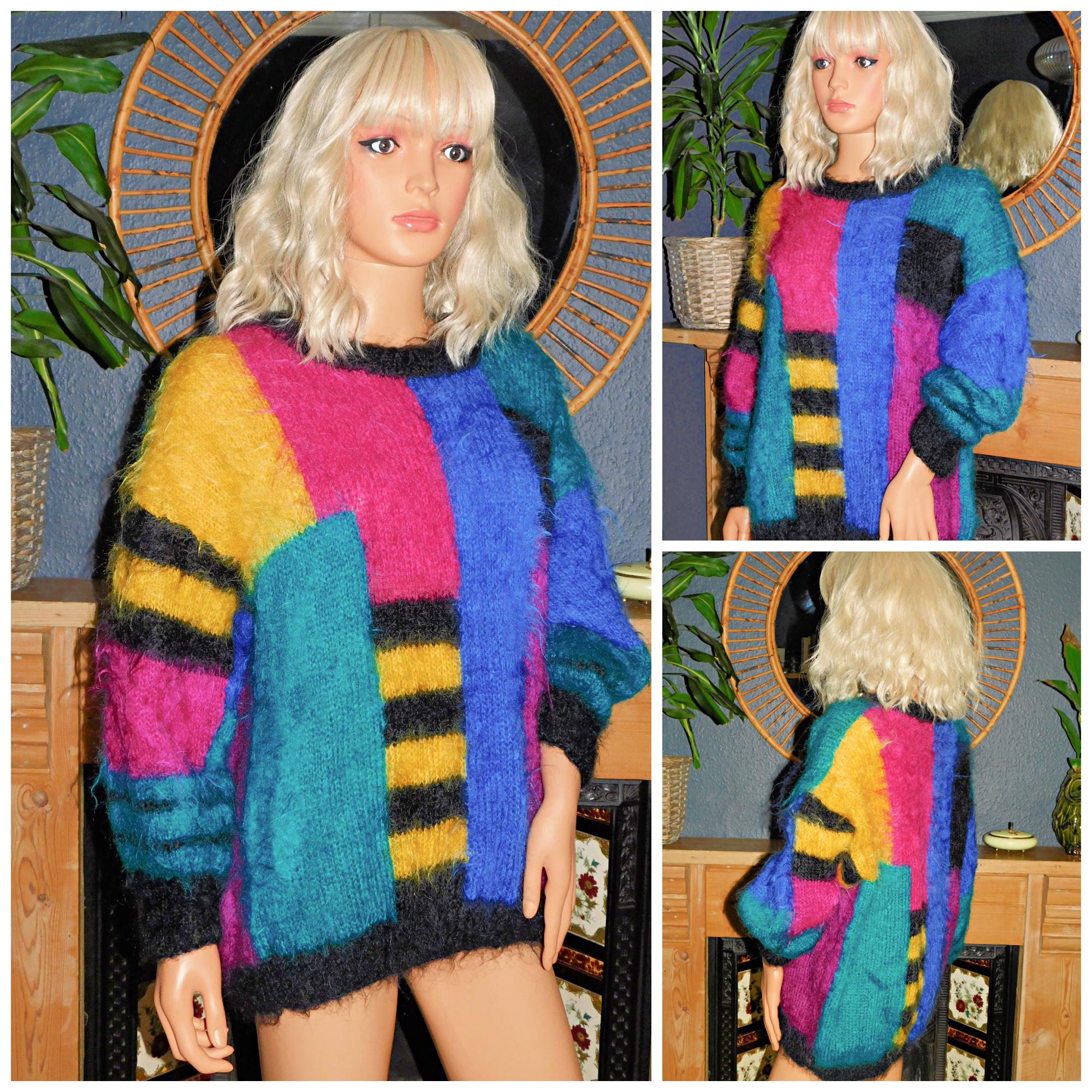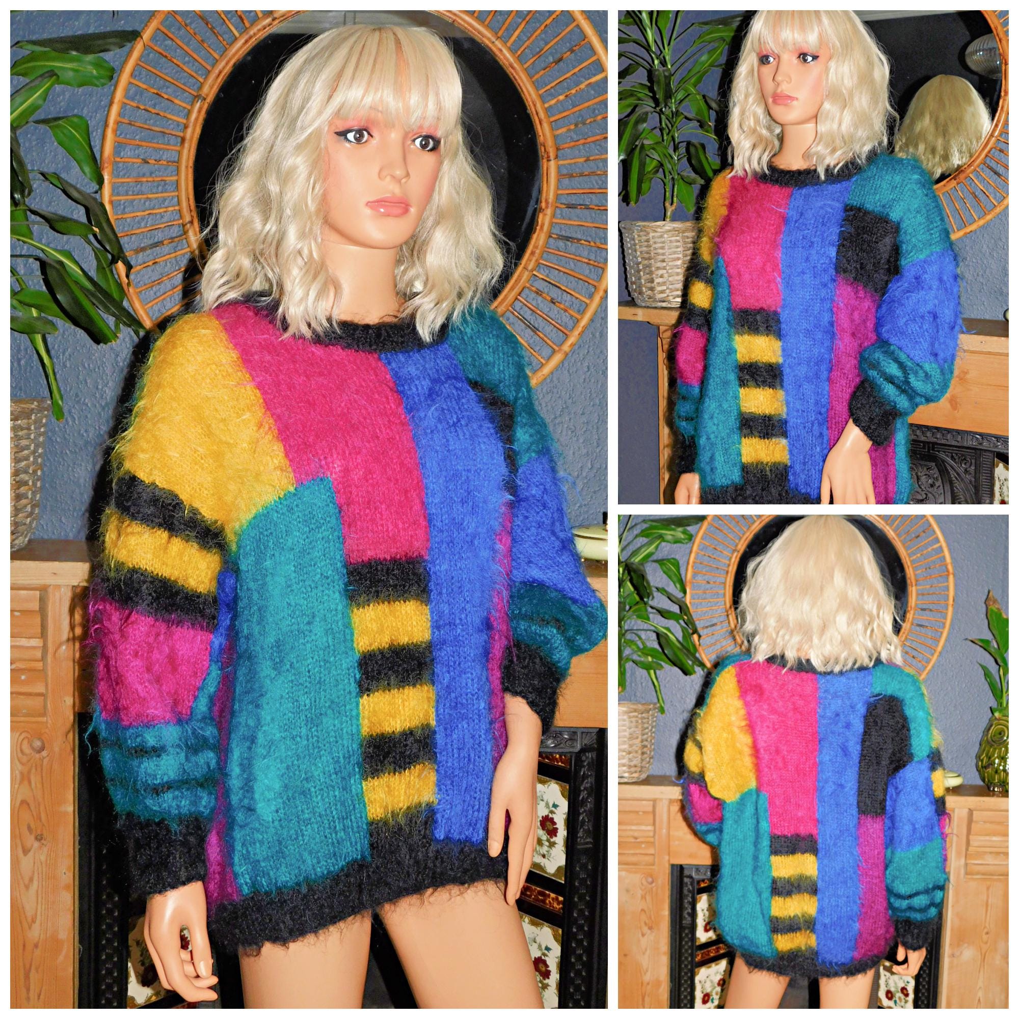 Vintage 80s Multicoloured SHAGGY MOHAIR Colour Block Sweater Jumper S M L 1980s Slouchy Hand Knit
