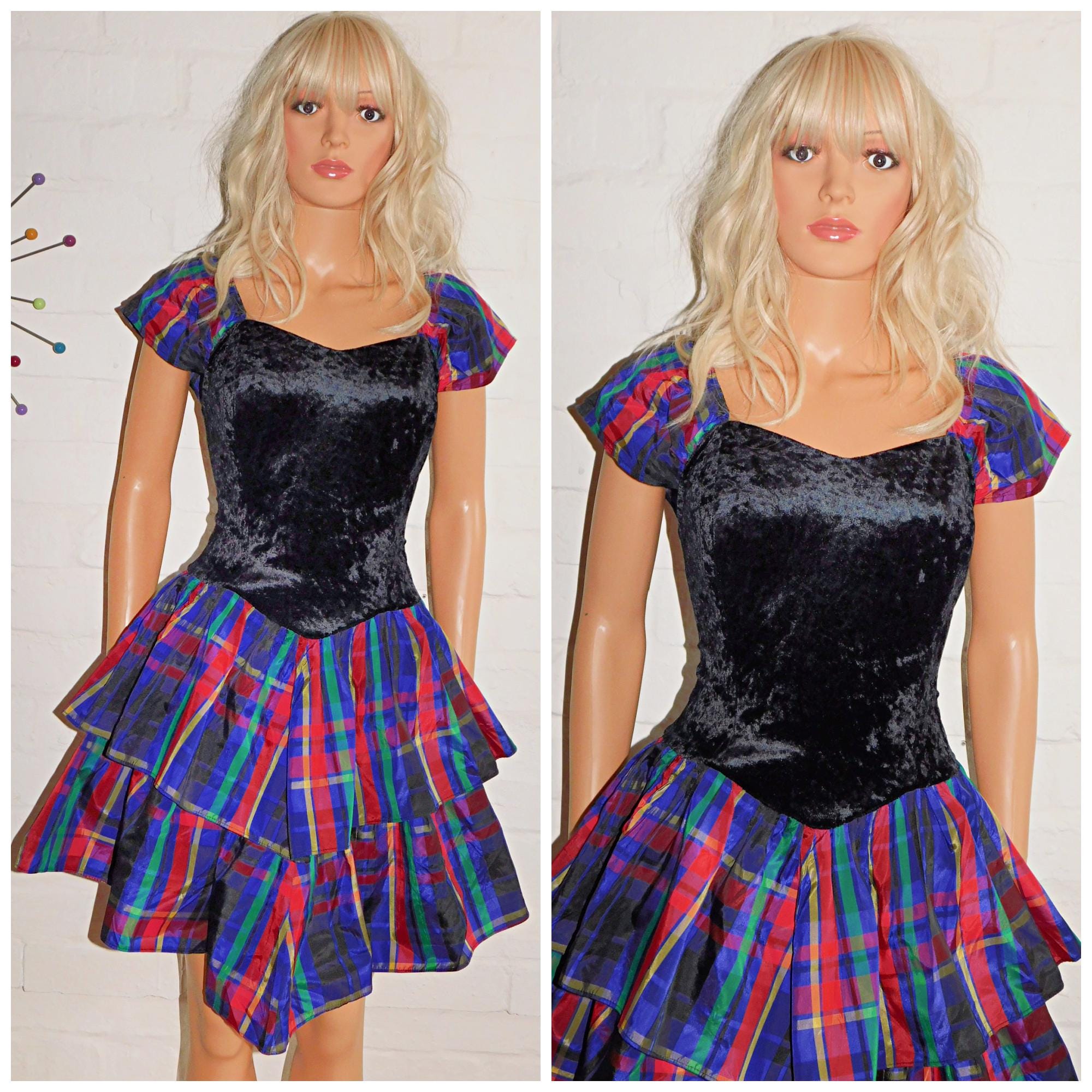 Classic Eighties prom dress in black velvet with a contrasting red/green/yellow/purple tartan print