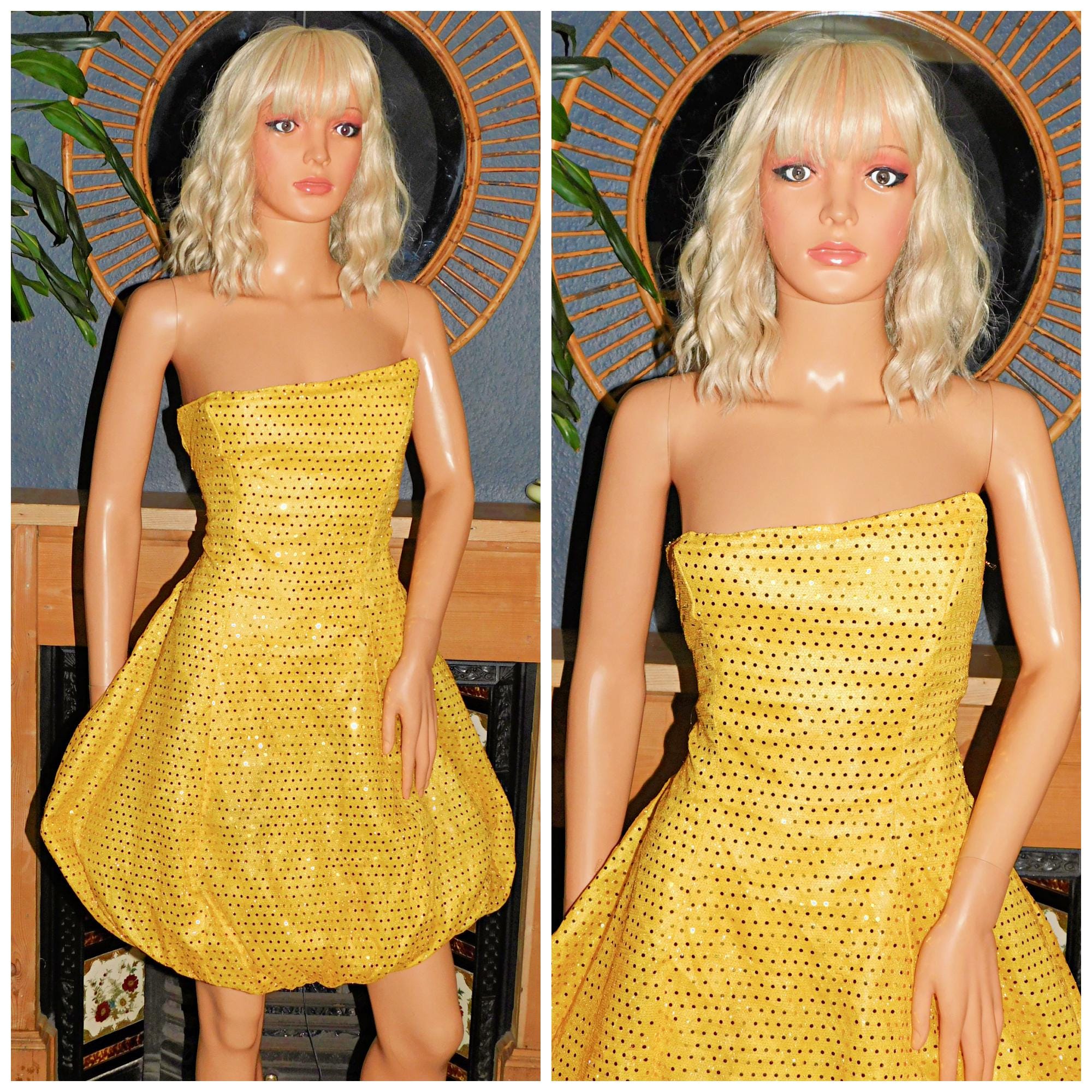 Vintage 90s Yellow Gold SEQUIN STRAPLESS PUFFBALL Mini Party Dress 10 S 1990s Disco