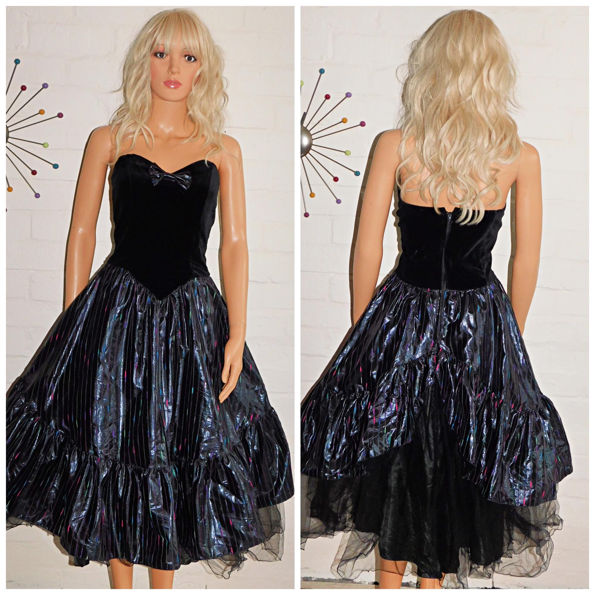 Vintage 80s Strapless METALLIC Black FULL SKIRT Bow Prom Party Dress 10 S 1980s Kitsch