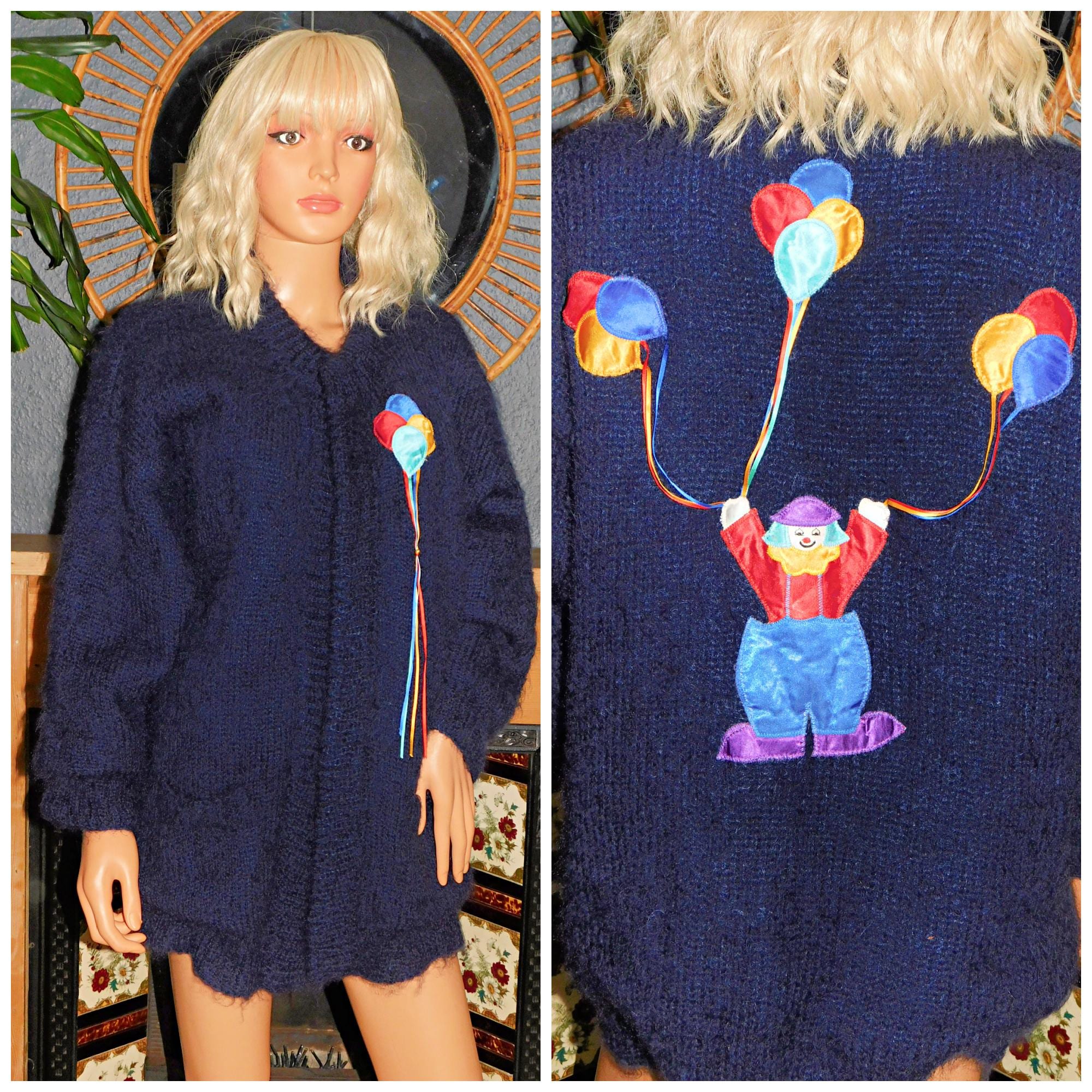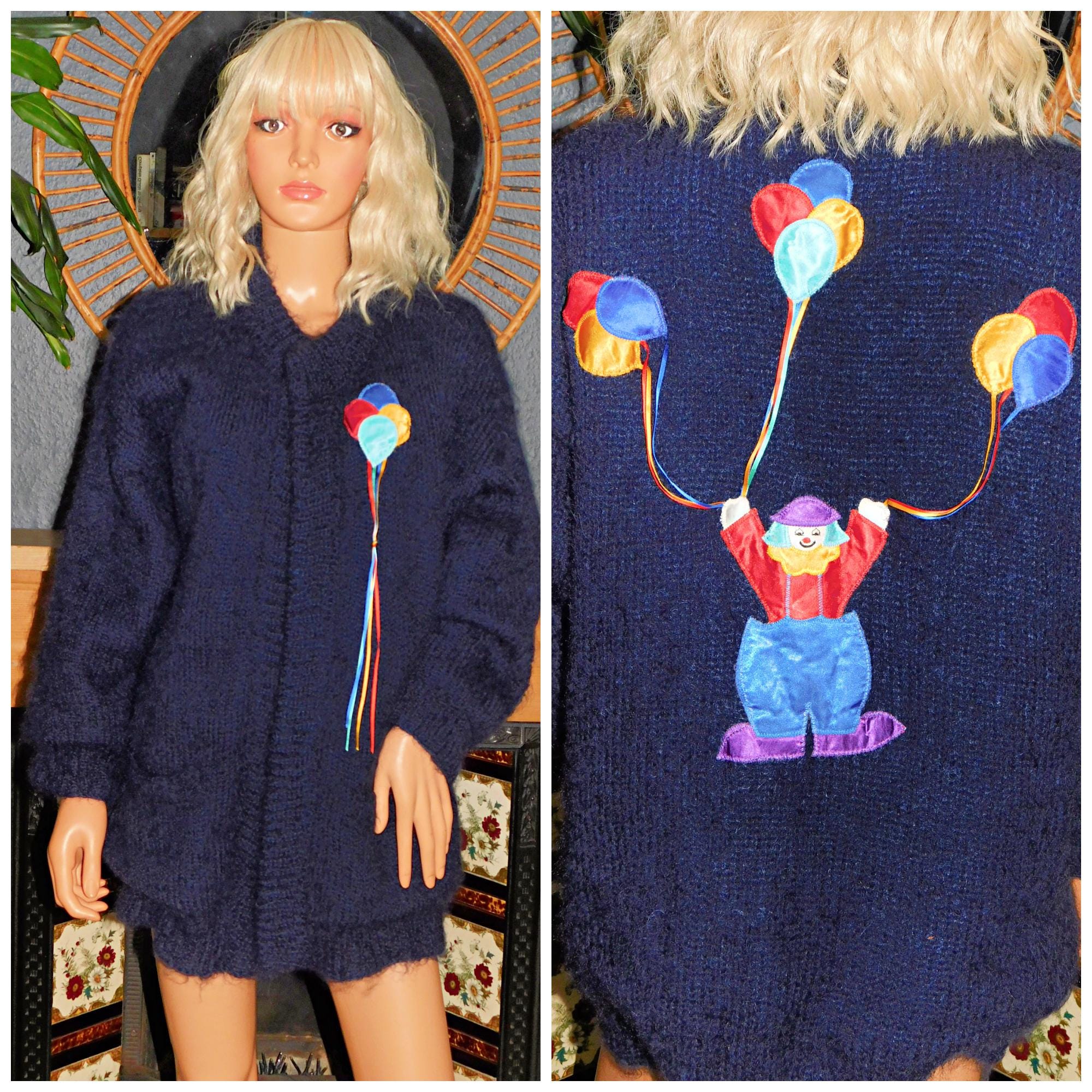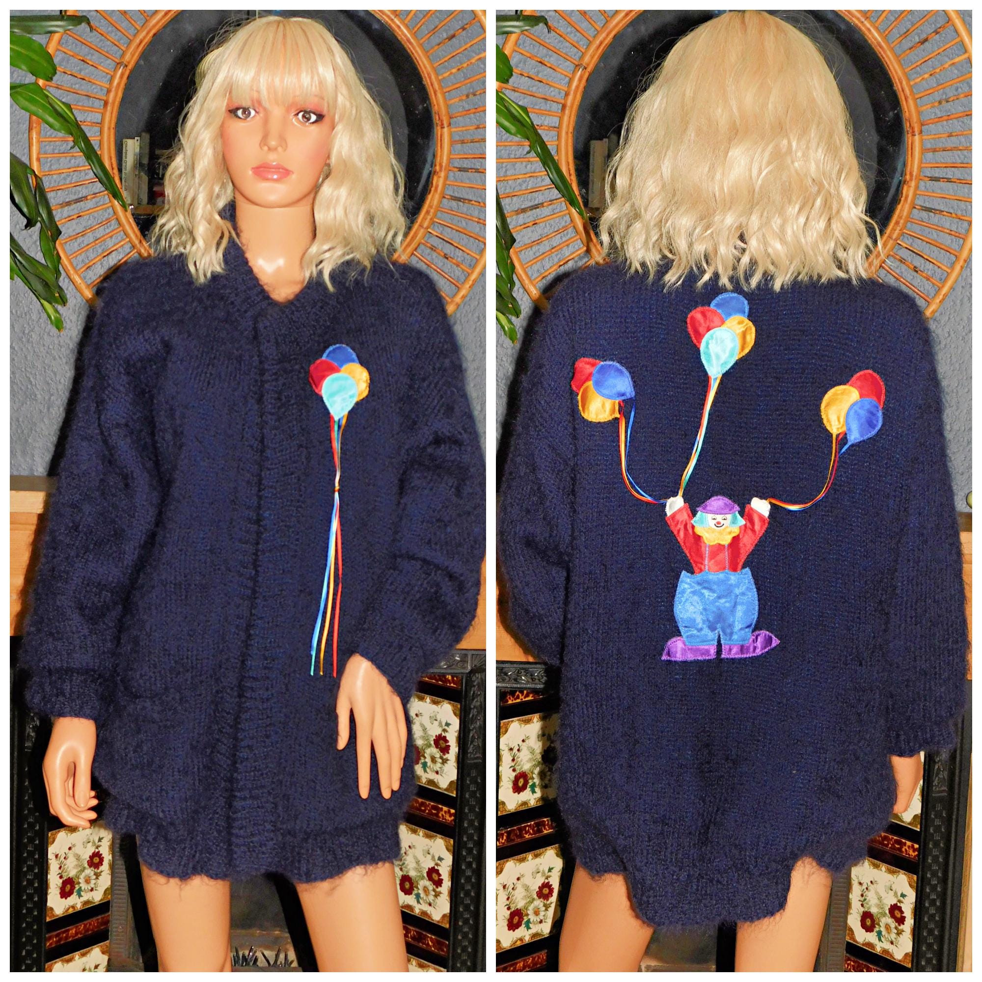 Gorgeous Eighties oversized shaggy slouchy mohair cardigan in navy blue with applique clown holding balloons!