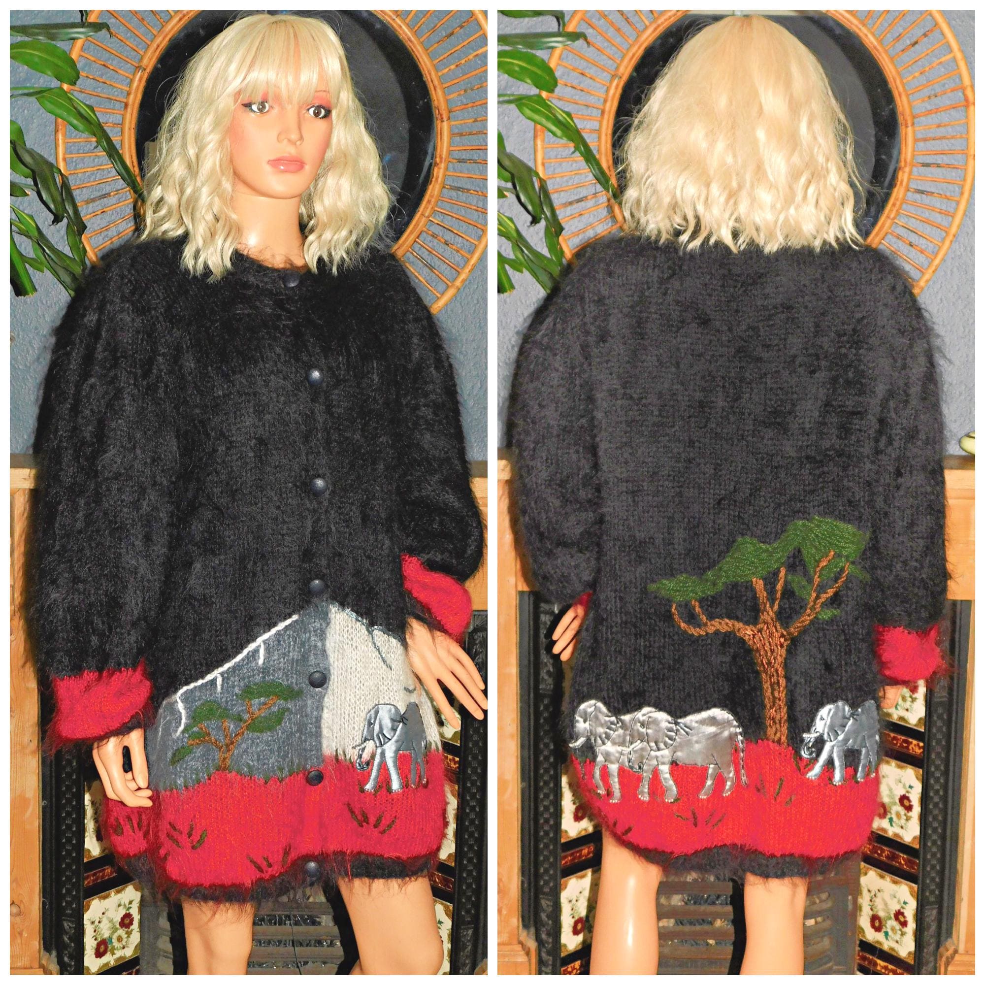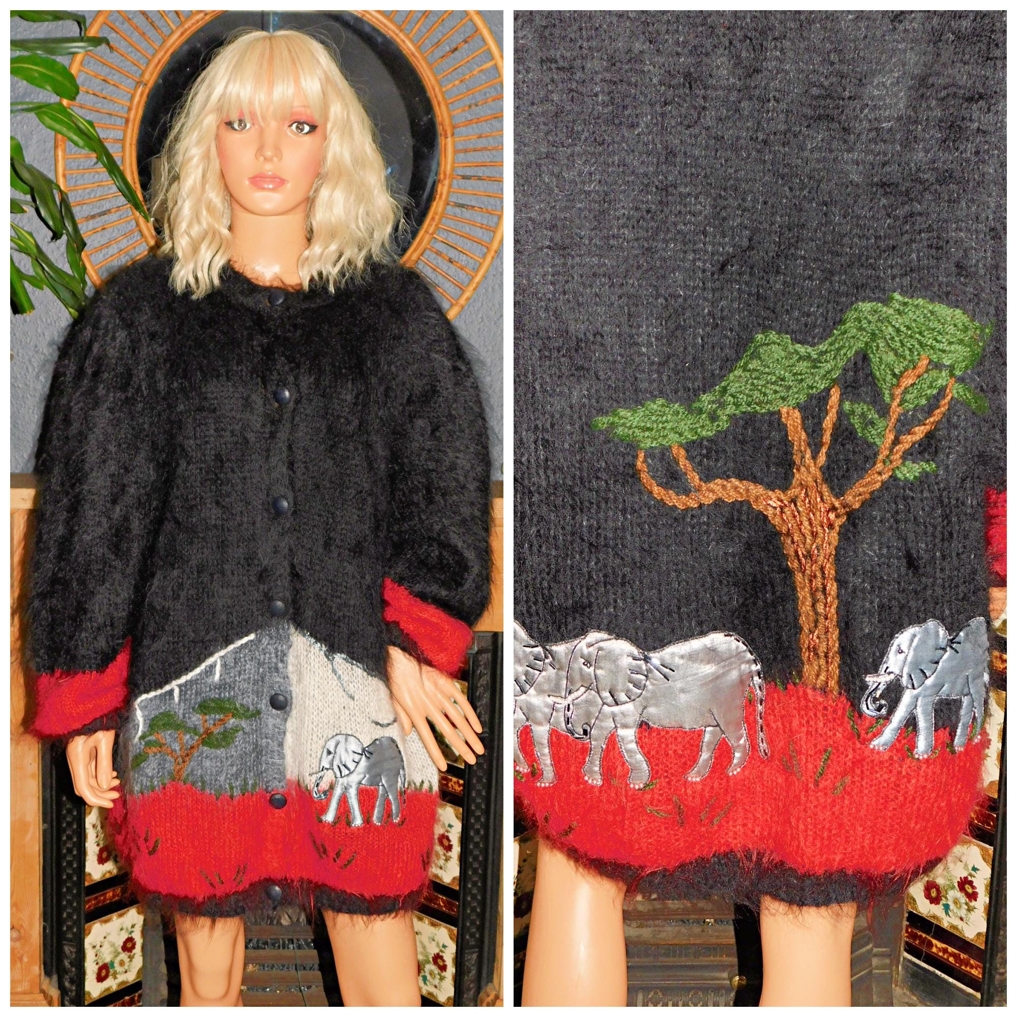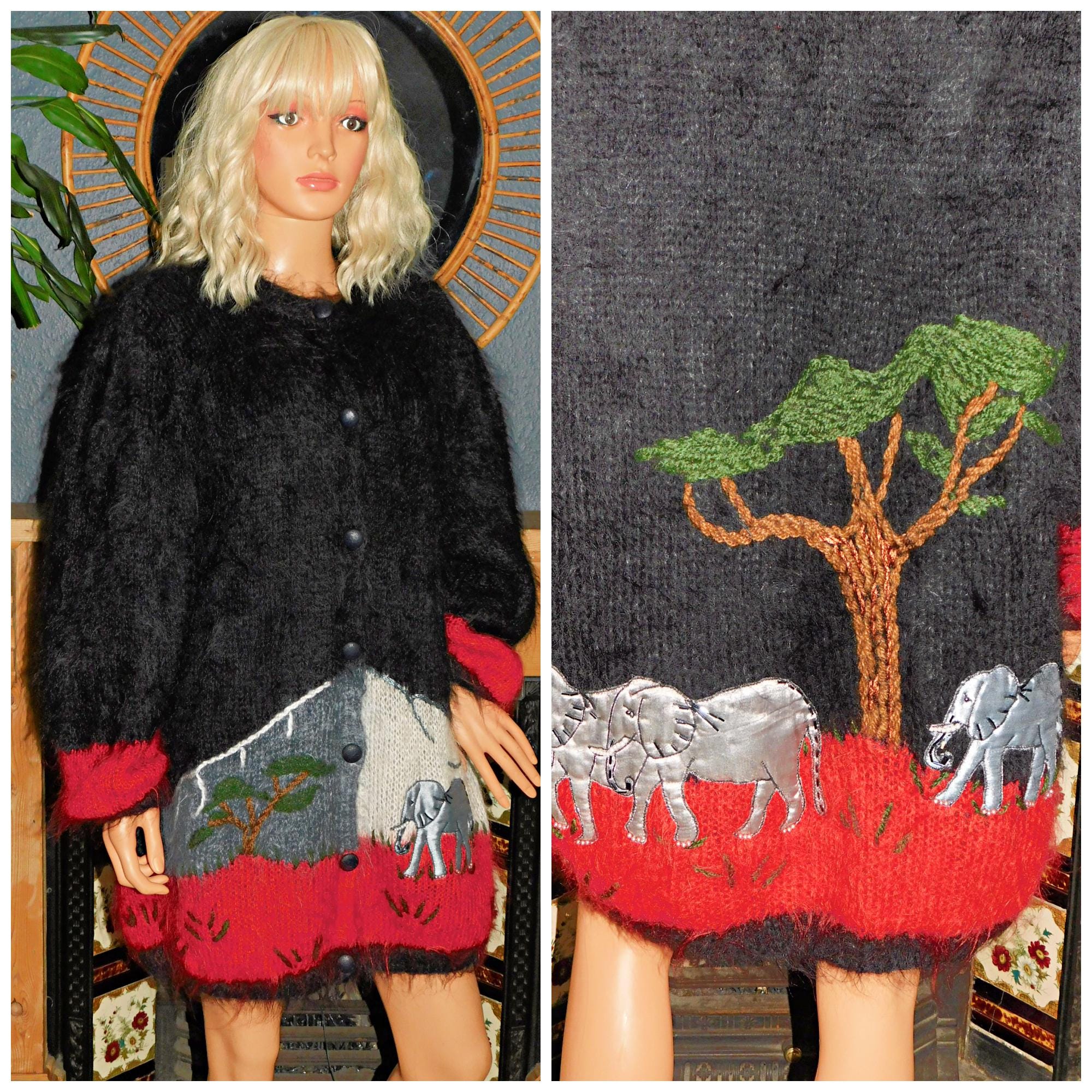 Vintage 80s Novelty Applique ELEPHANT MOHAIR Shaggy OVERSIZED Slouchy Cardigan M L 1980s Kitsch Wool Fluffy Trees Kitsch Black Red