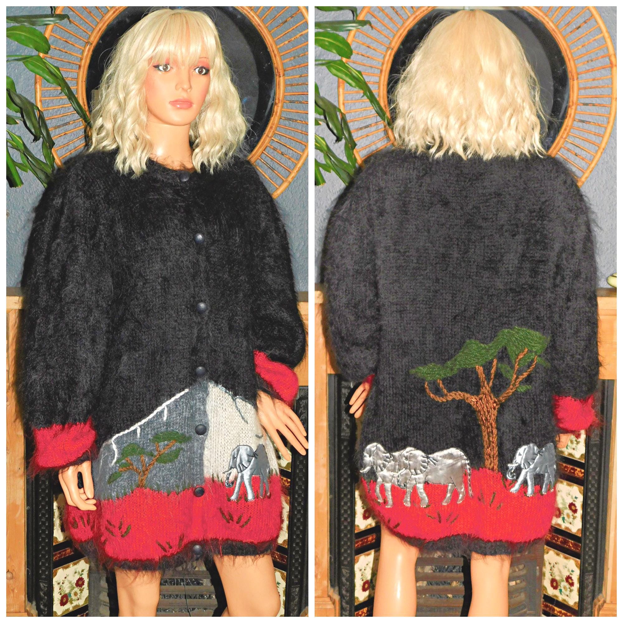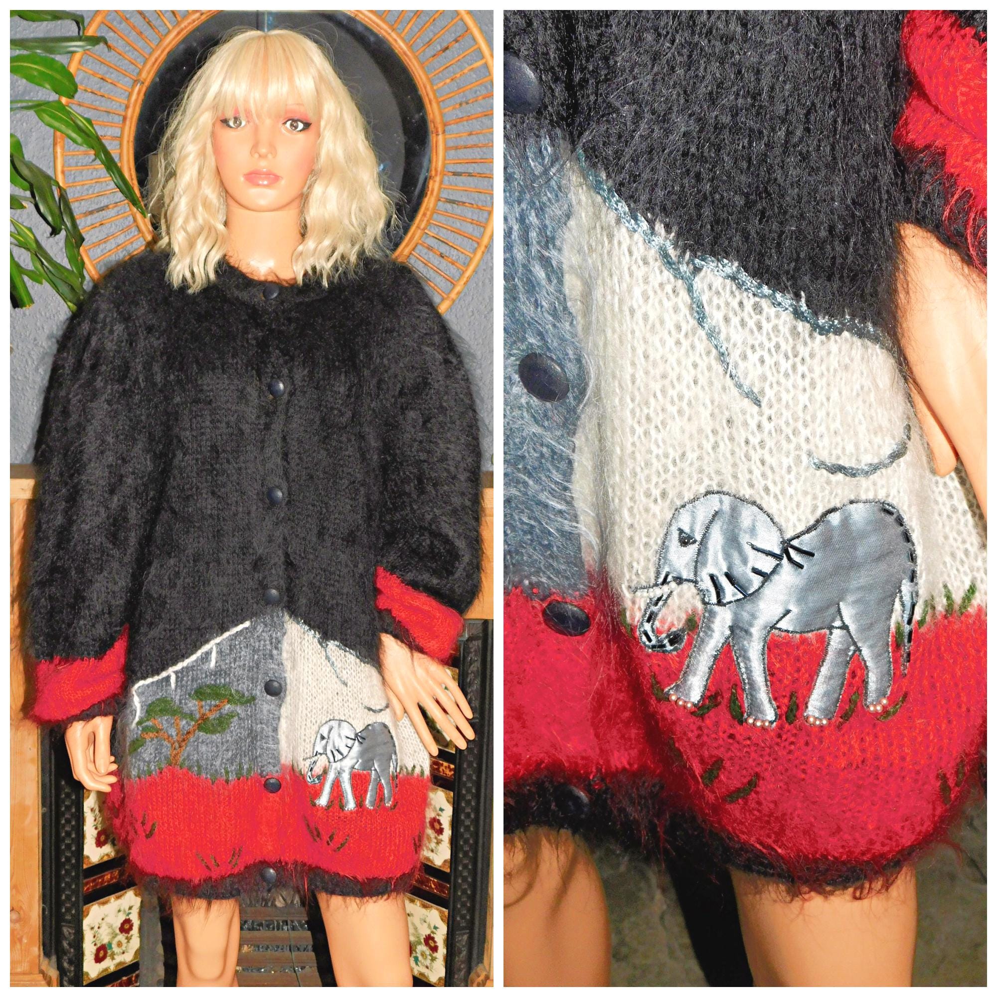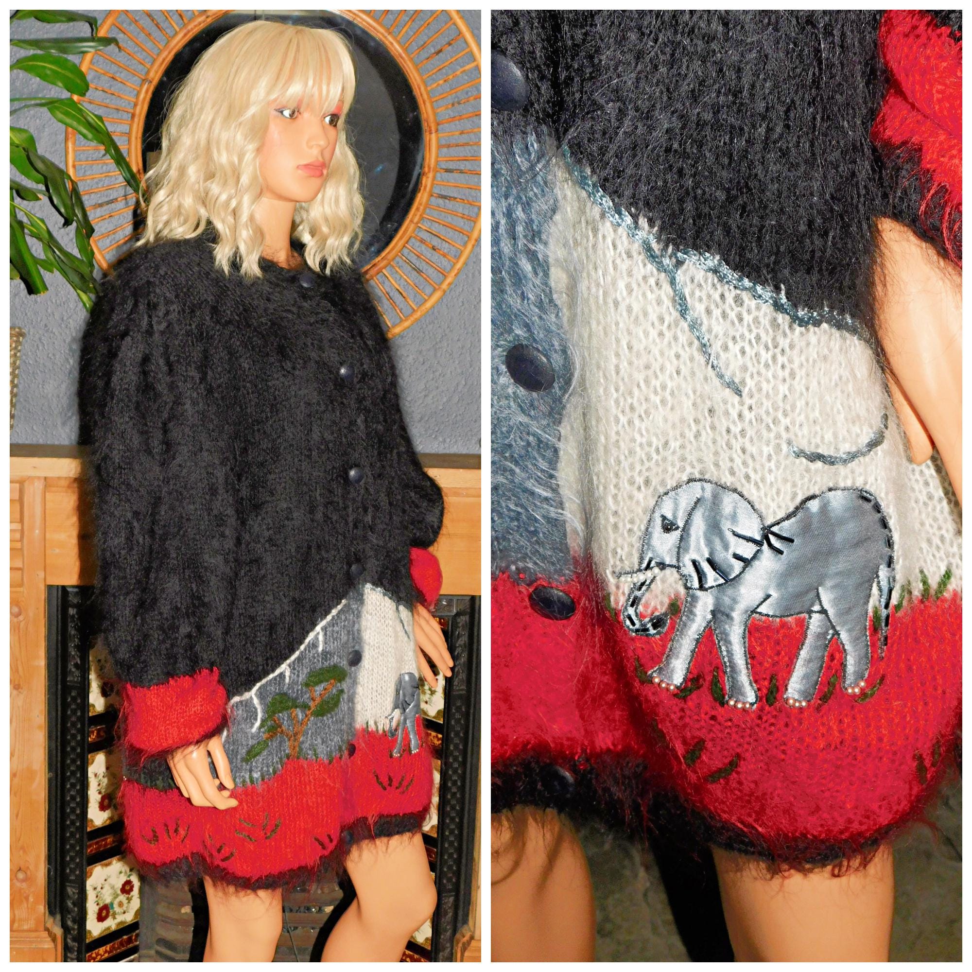 Vintage 80s Novelty Applique ELEPHANT MOHAIR Shaggy OVERSIZED Slouchy Cardigan M L 1980s Kitsch Wool Fluffy Trees Kitsch Black Red