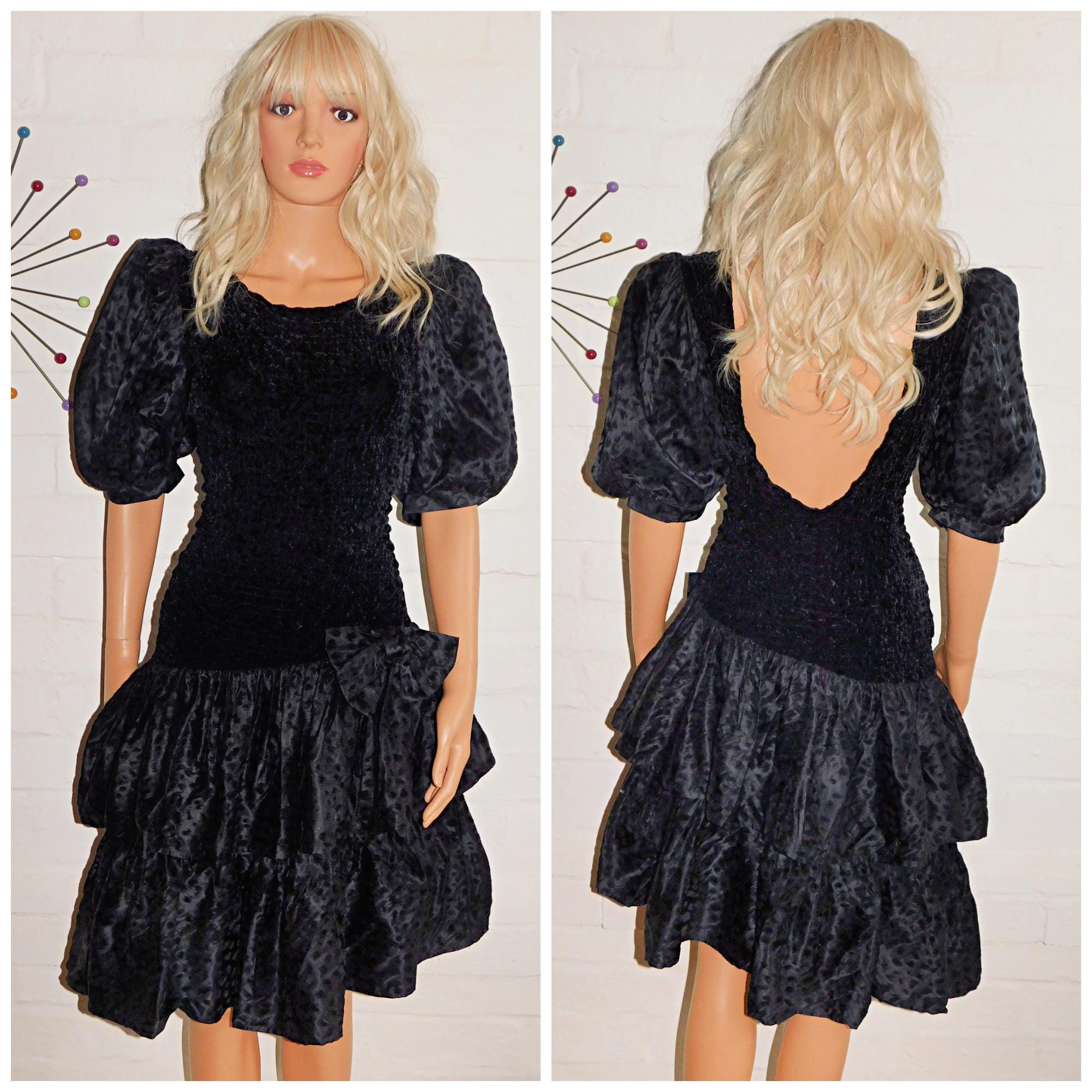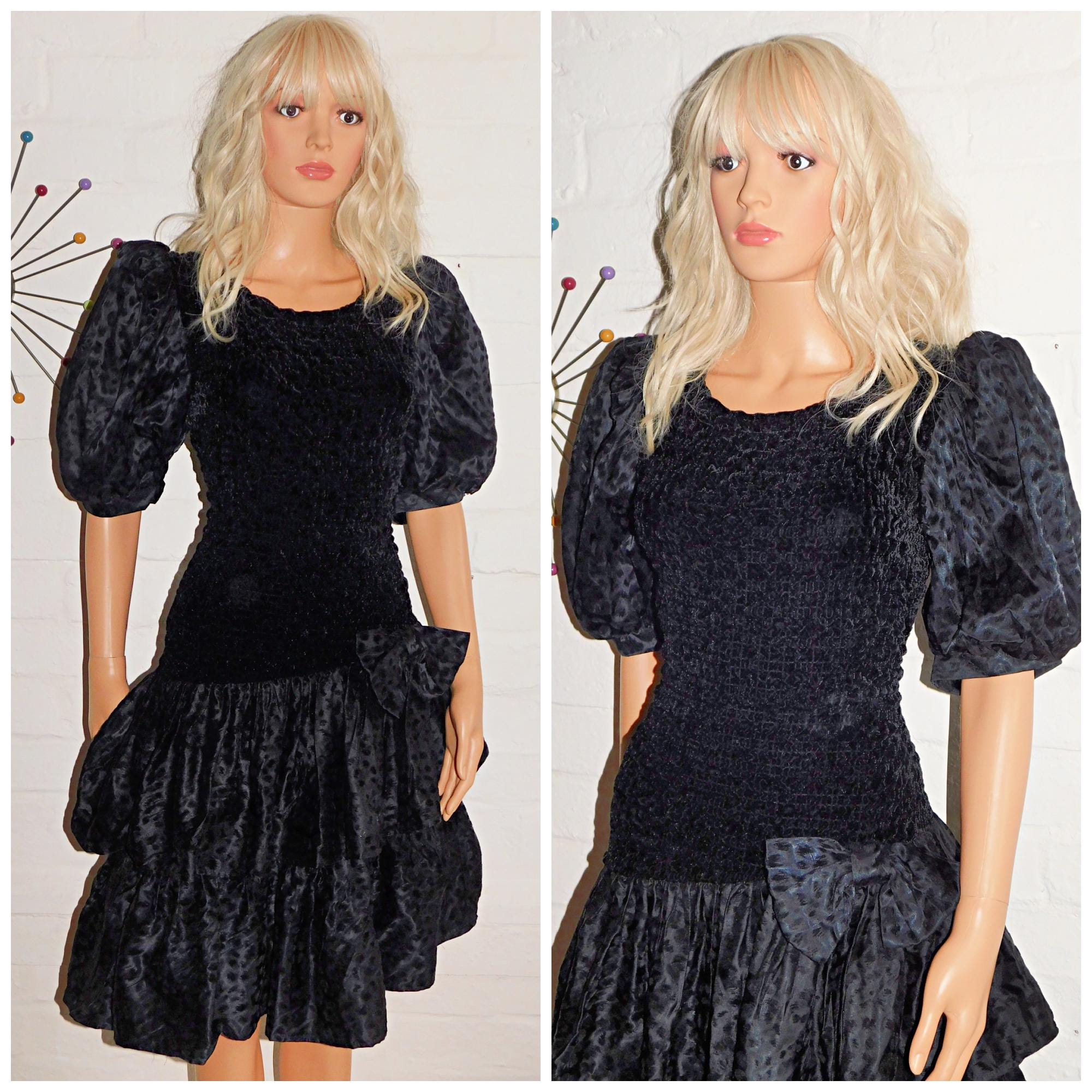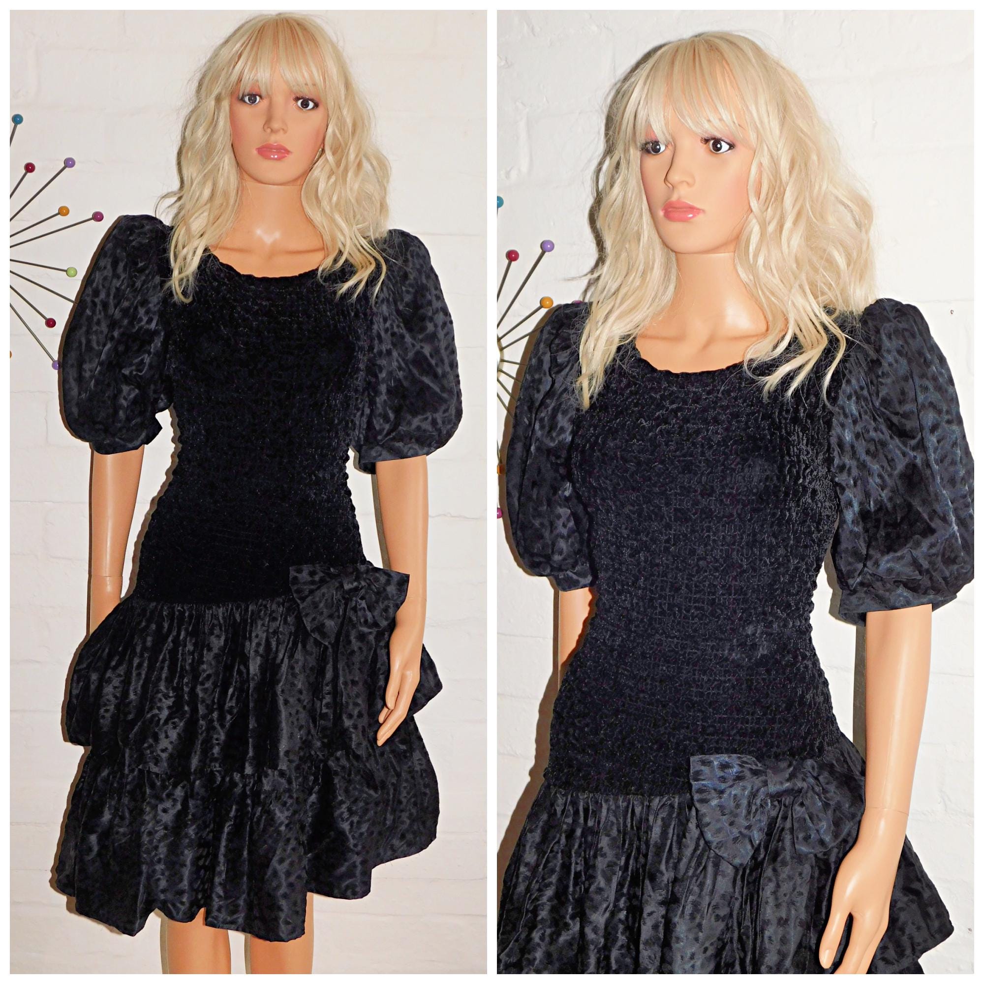 Vintage 1980s Black Bow Drop Waist PUFF Slvd RARA Prom Party Dress 10 12 S M 80s KITSCH