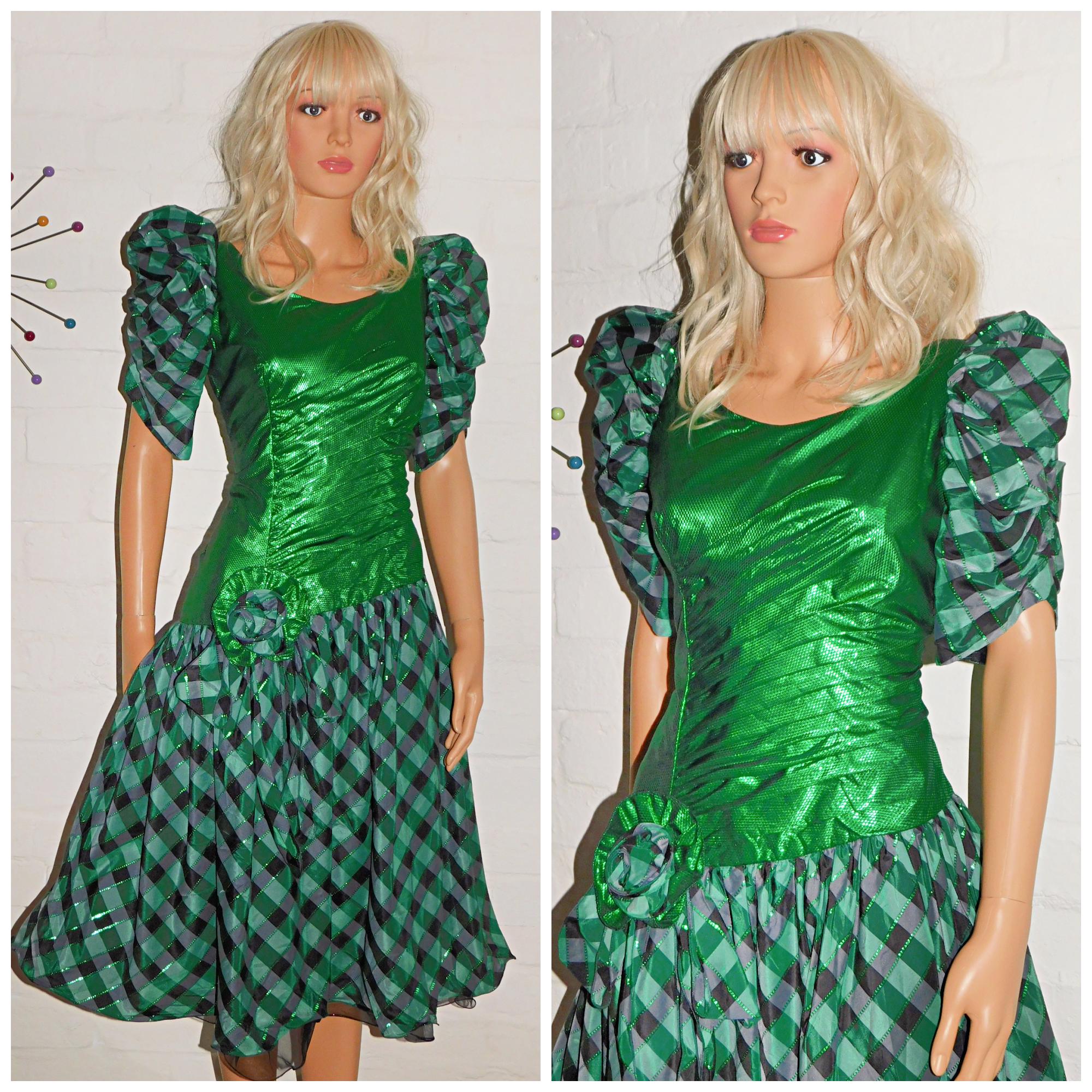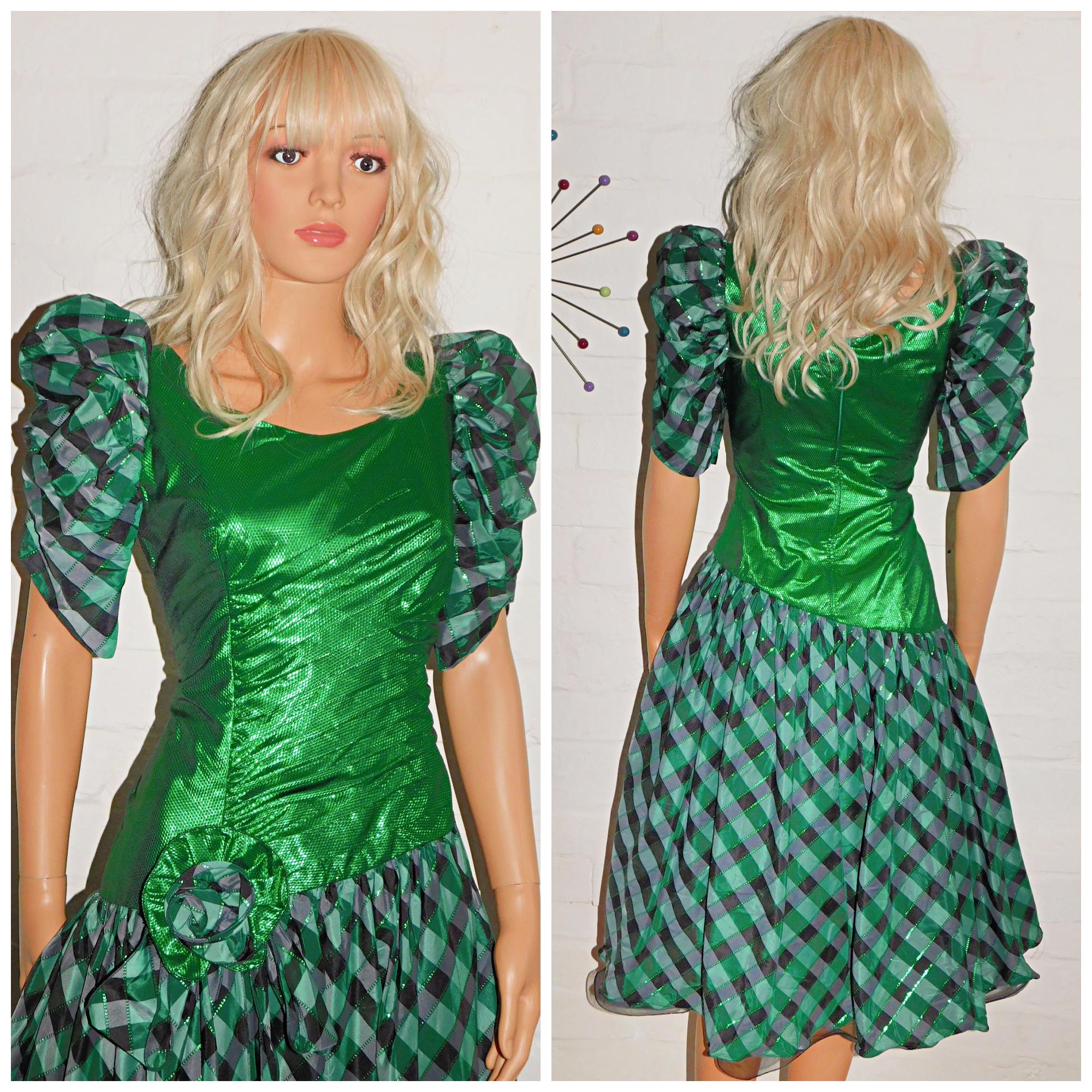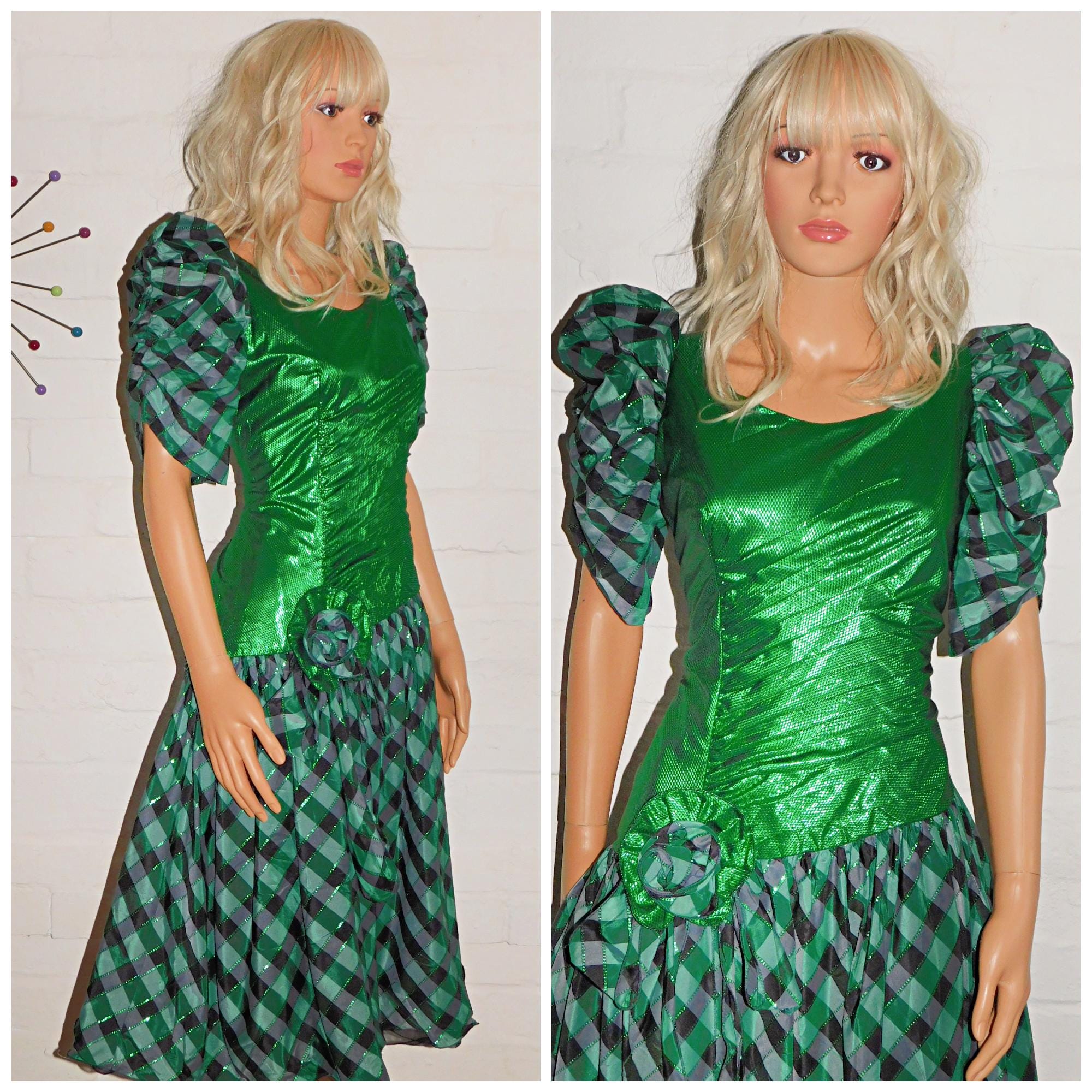 Fabulous 80s prom dress in metallic green with contrasting check skirt/sleeves