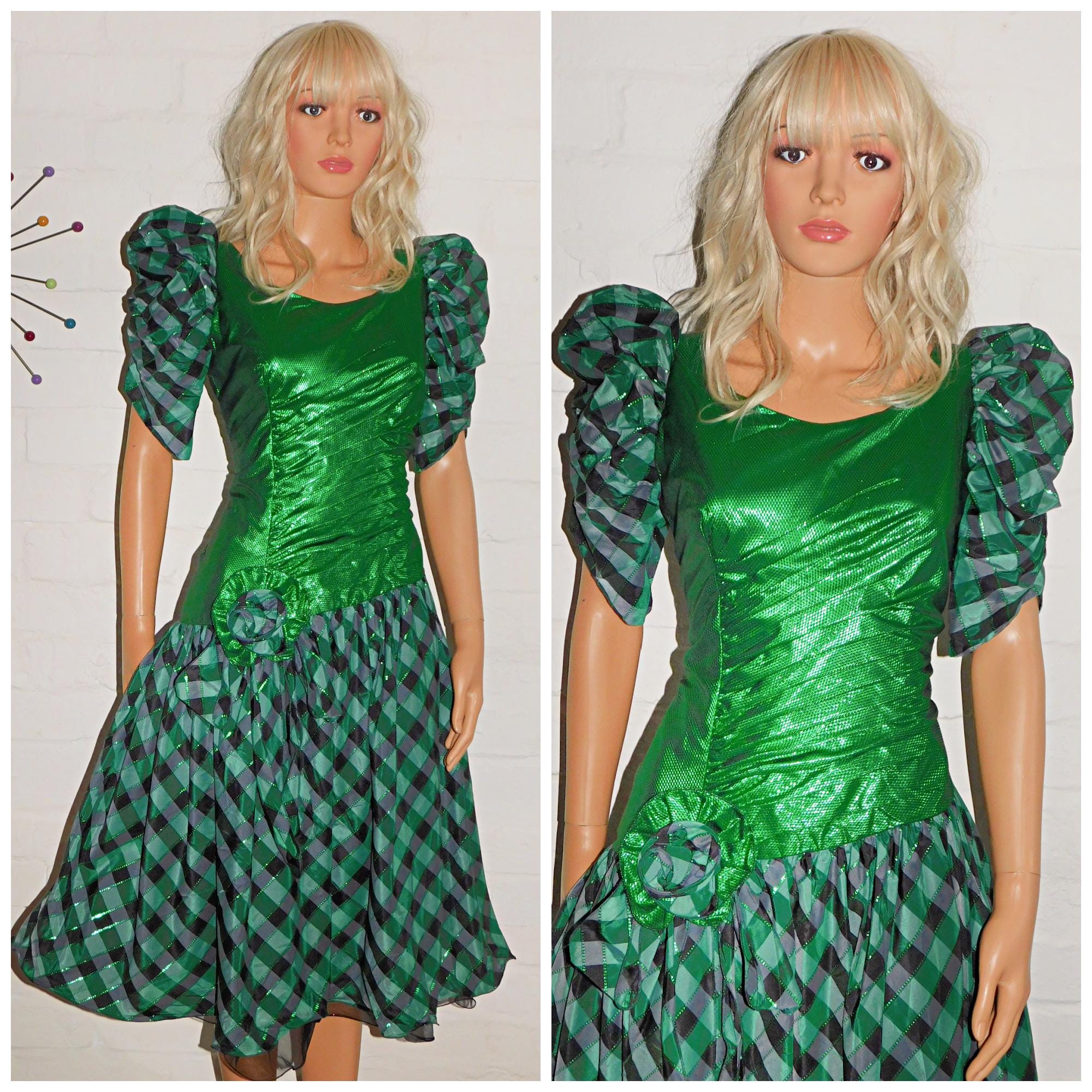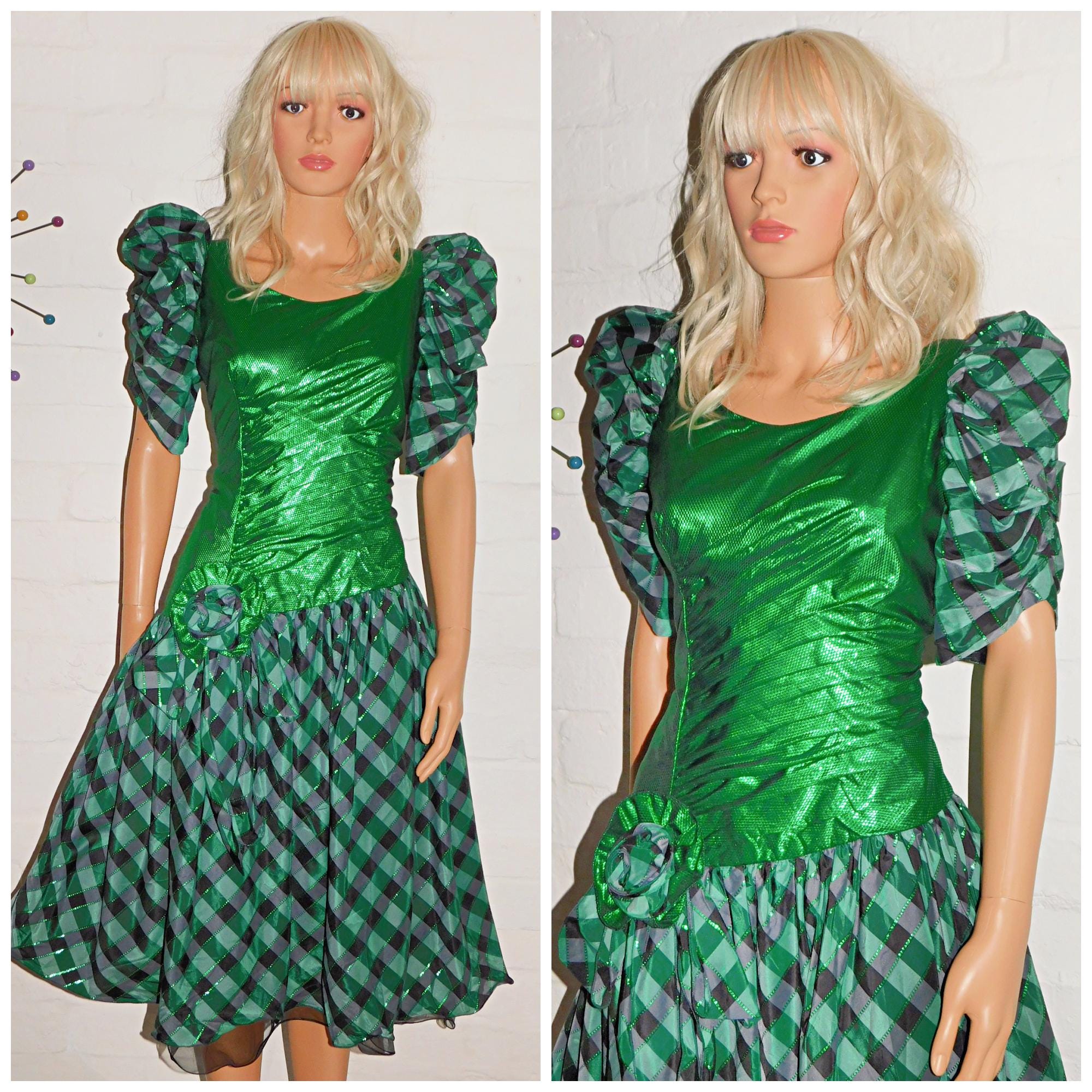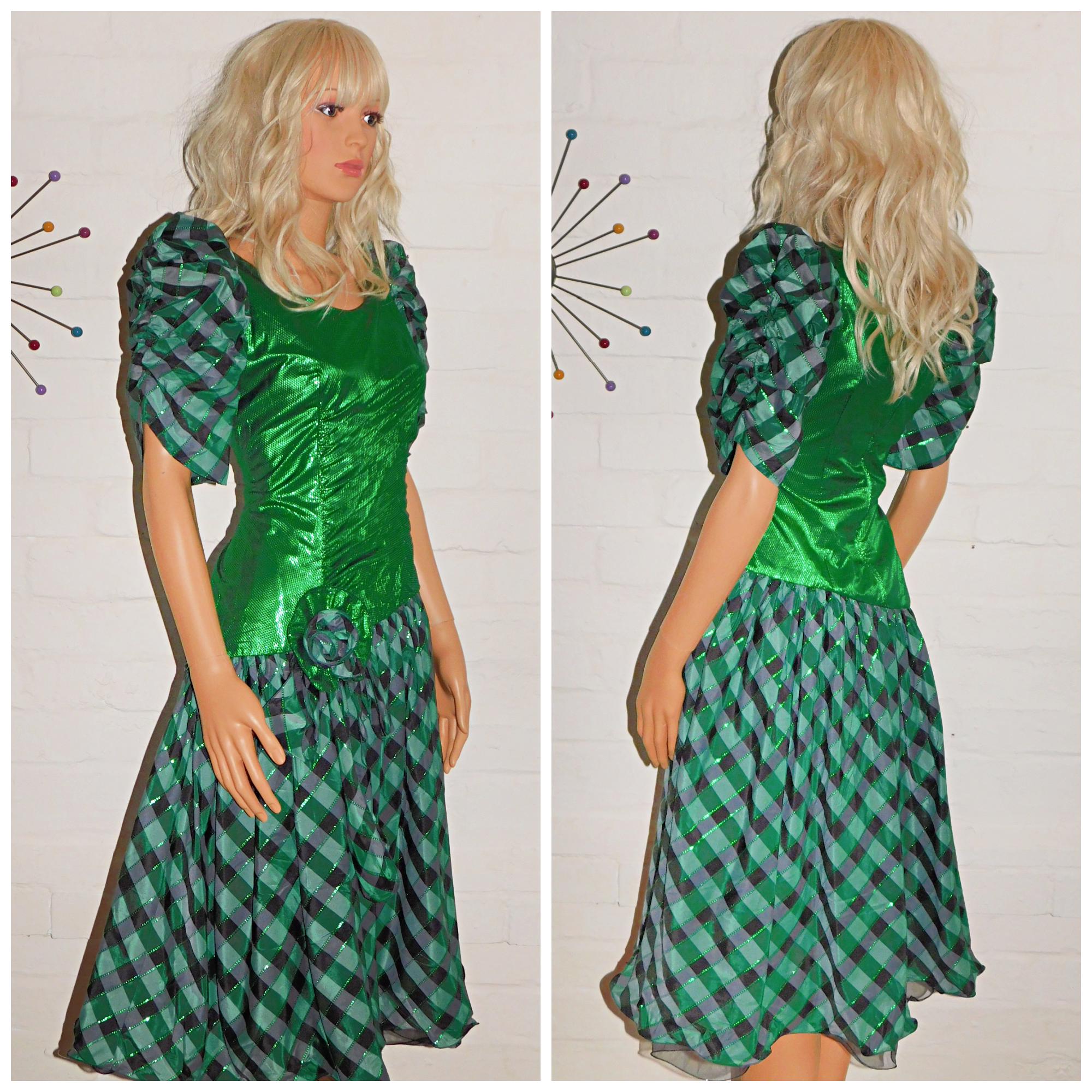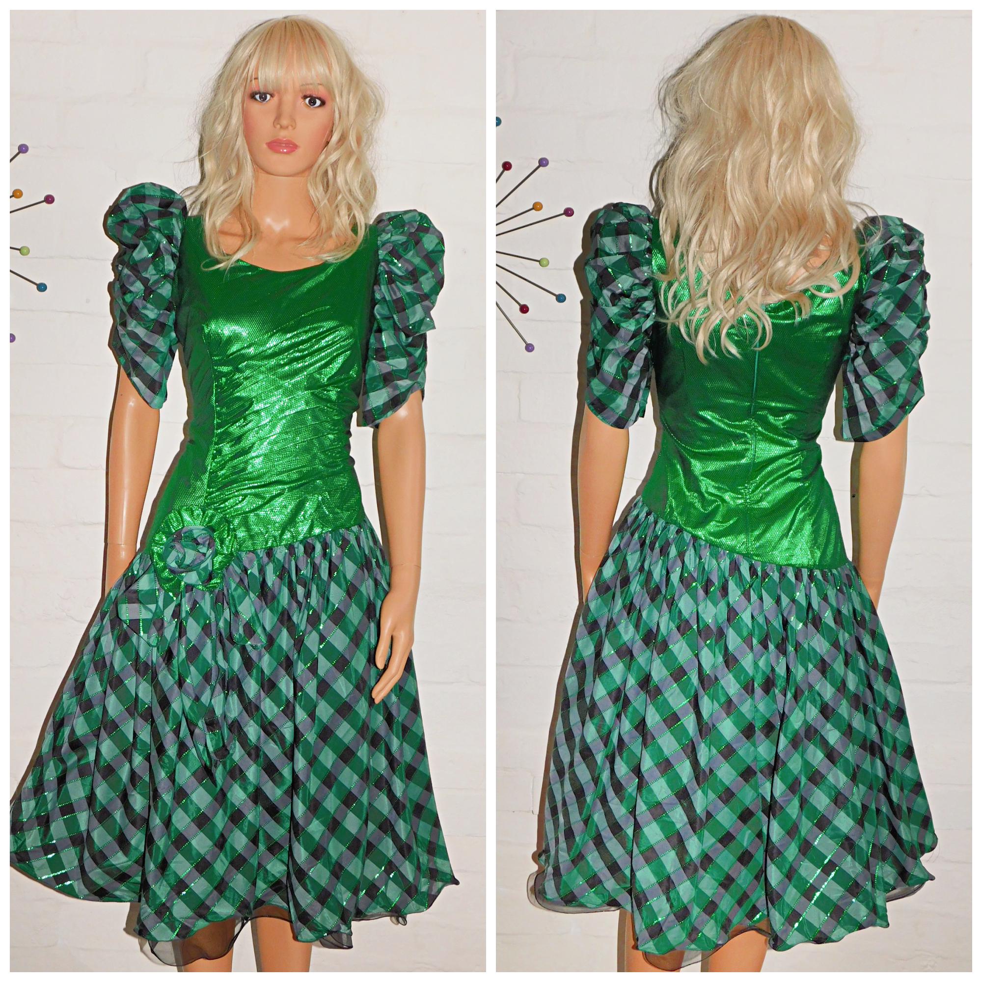 Fabulous 80s prom dress in metallic green with contrasting check skirt/sleeves