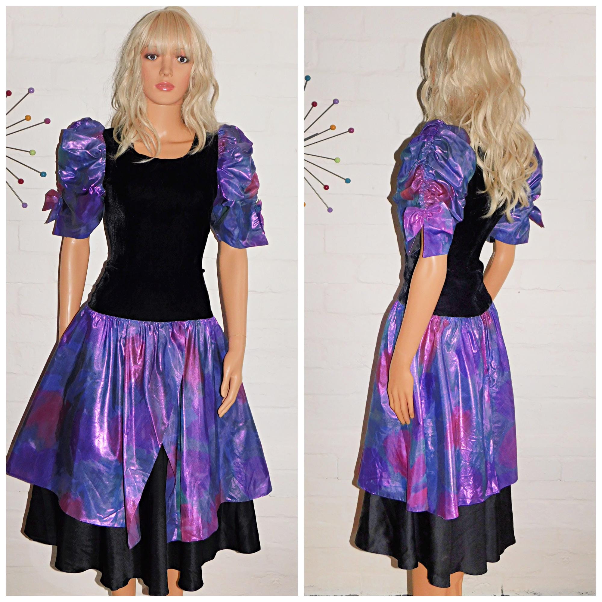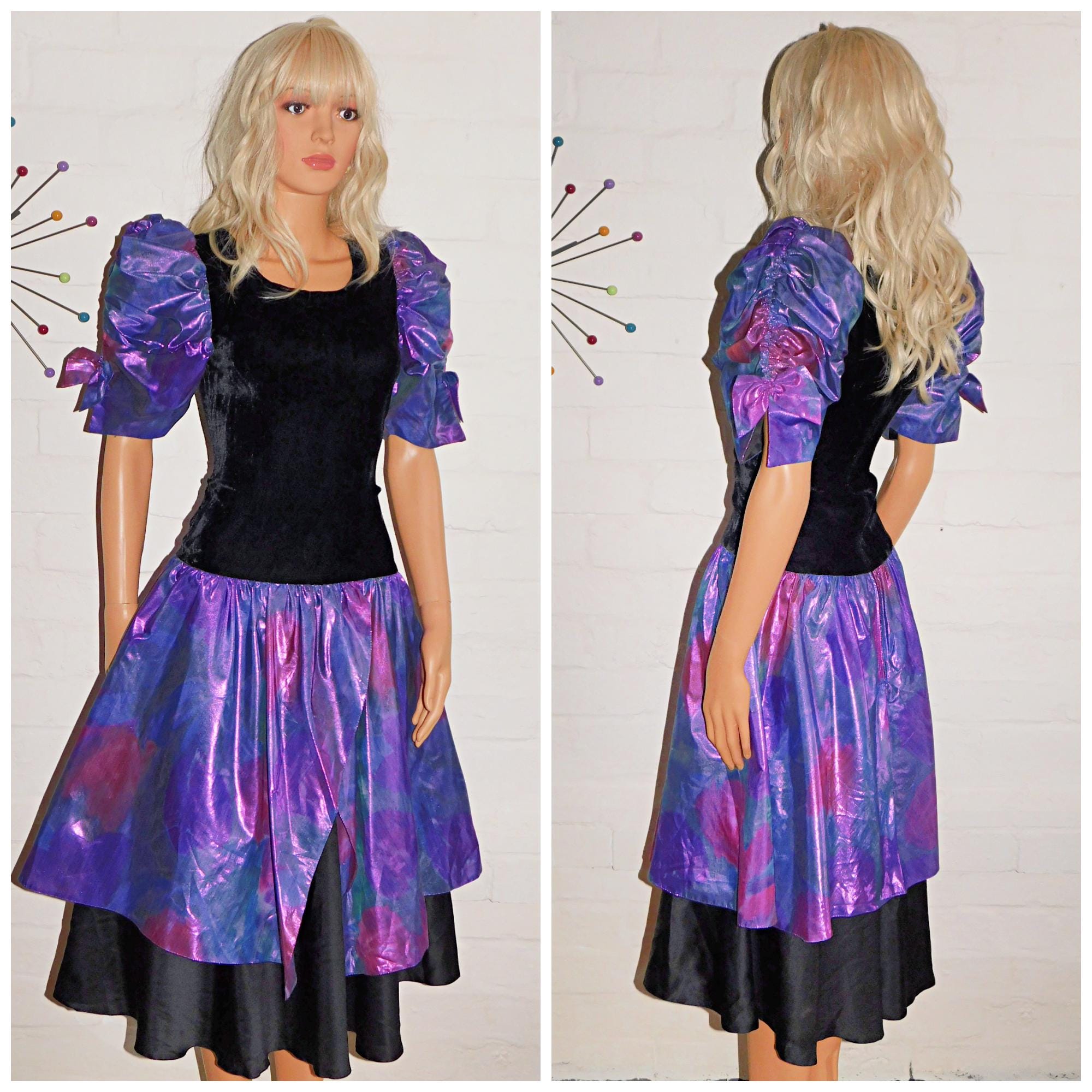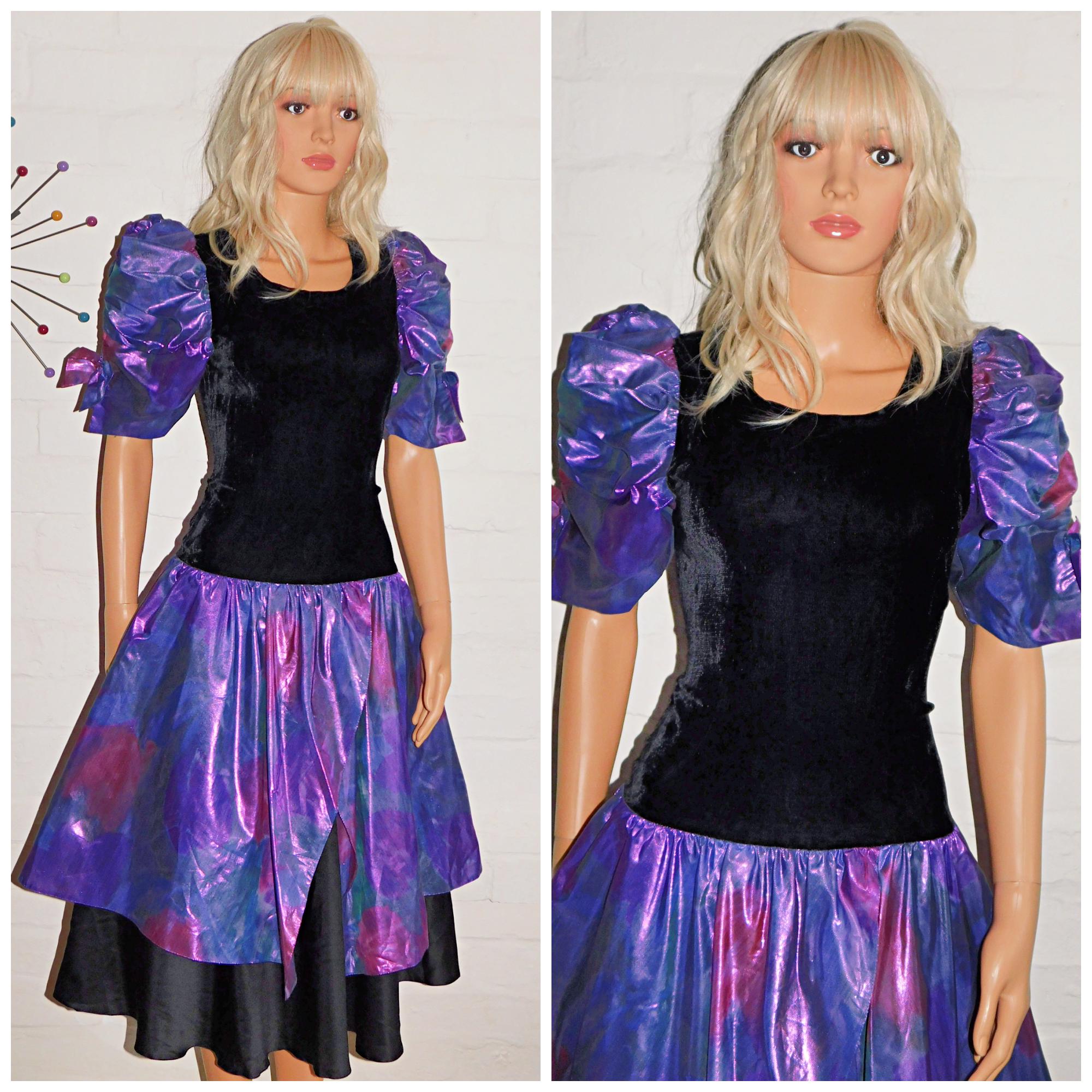 Vintage 80s Black METALLIC Purple PUFF Slvd Drop Waist Prom Party Dress 8 10 S 1980s Kitsch