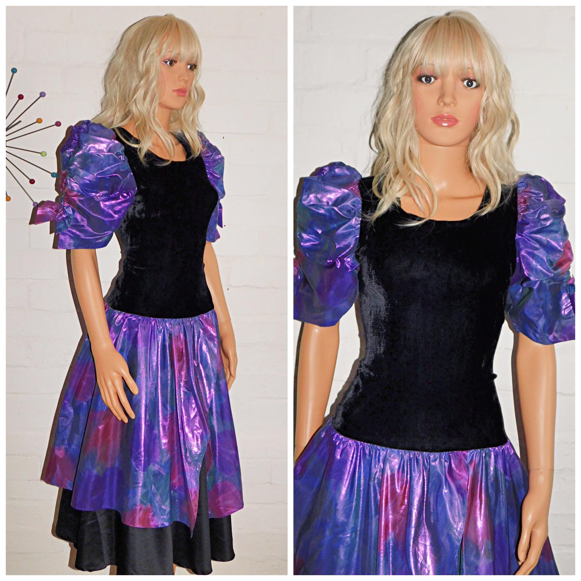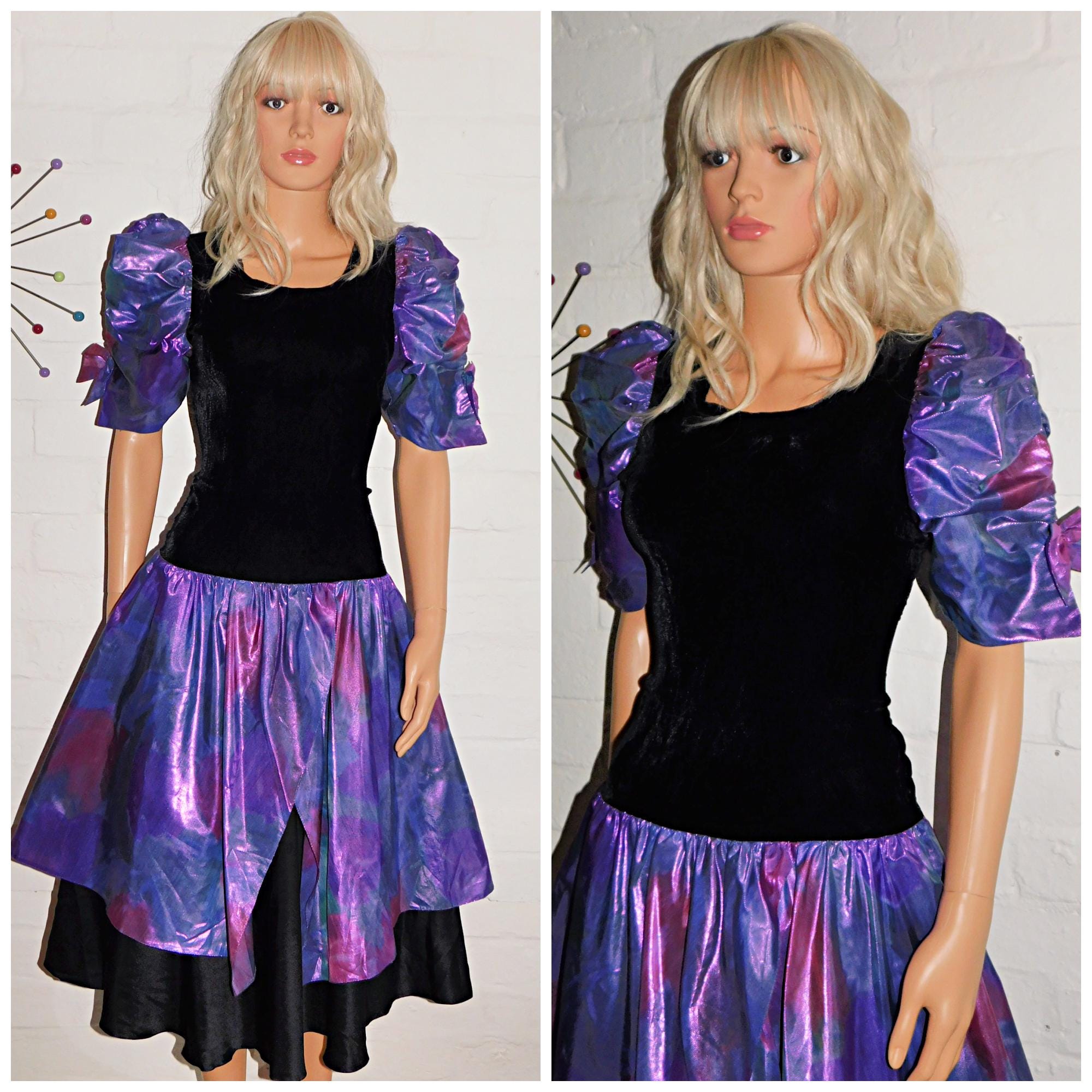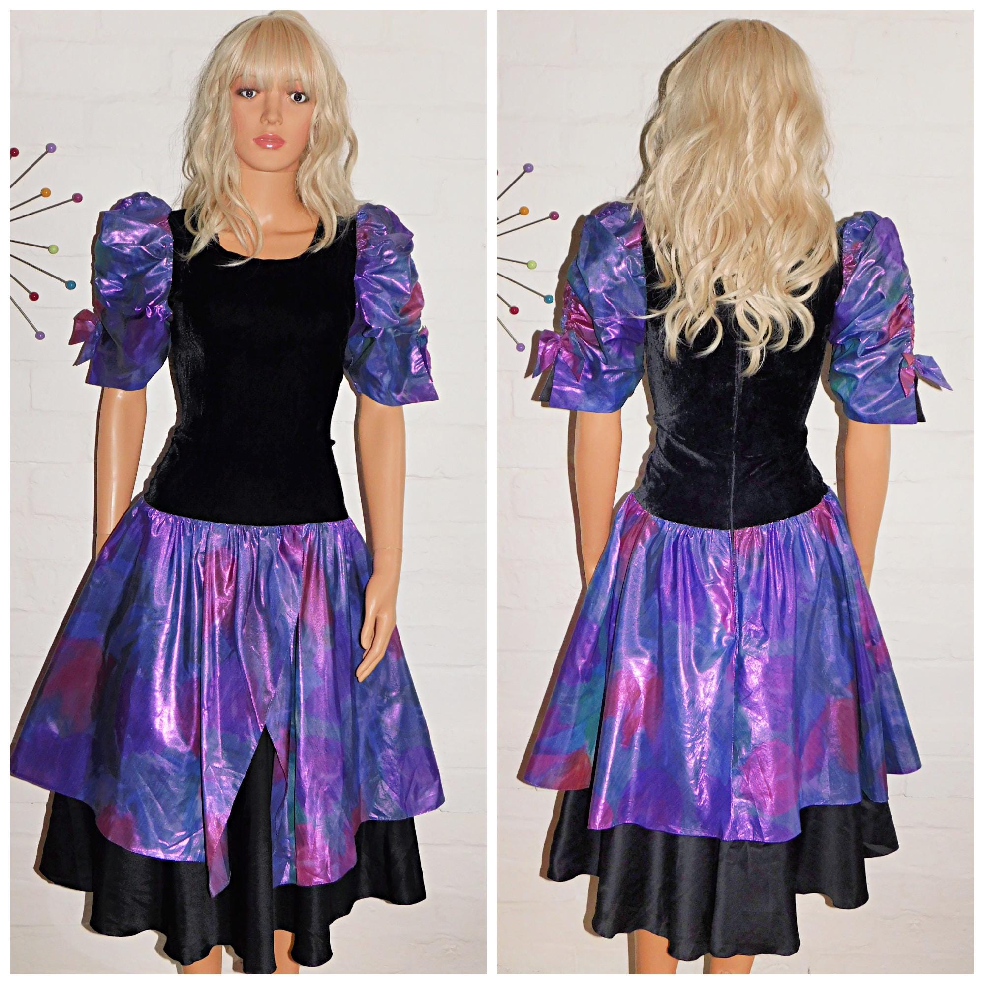 Vintage 80s Black METALLIC Purple PUFF Slvd Drop Waist Prom Party Dress 8 10 S 1980s Kitsch