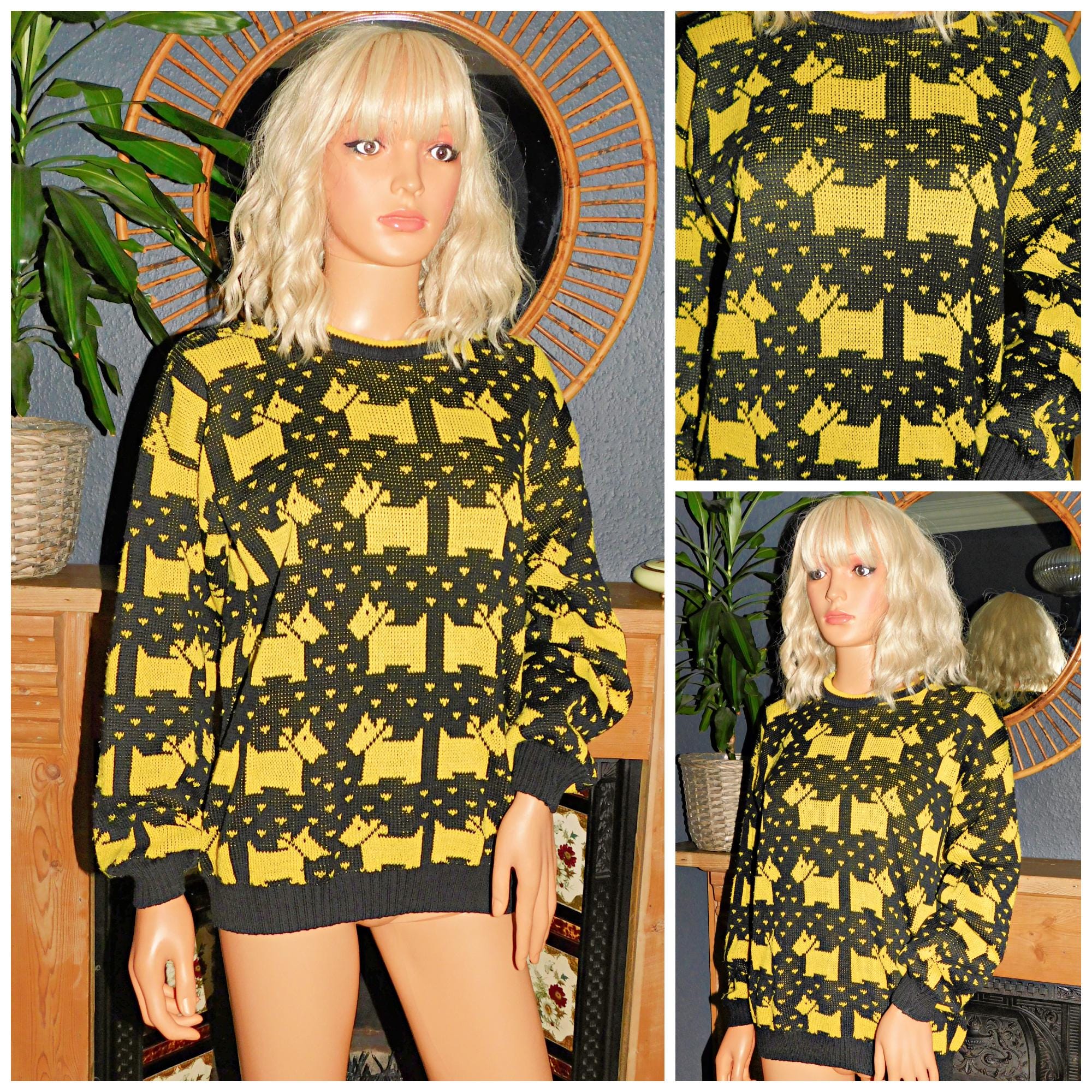 Vintage 80s 90s SCOTTY DOG Black Yellow Jumper Sweater S M 1990s Novelty Kitsch 1980s