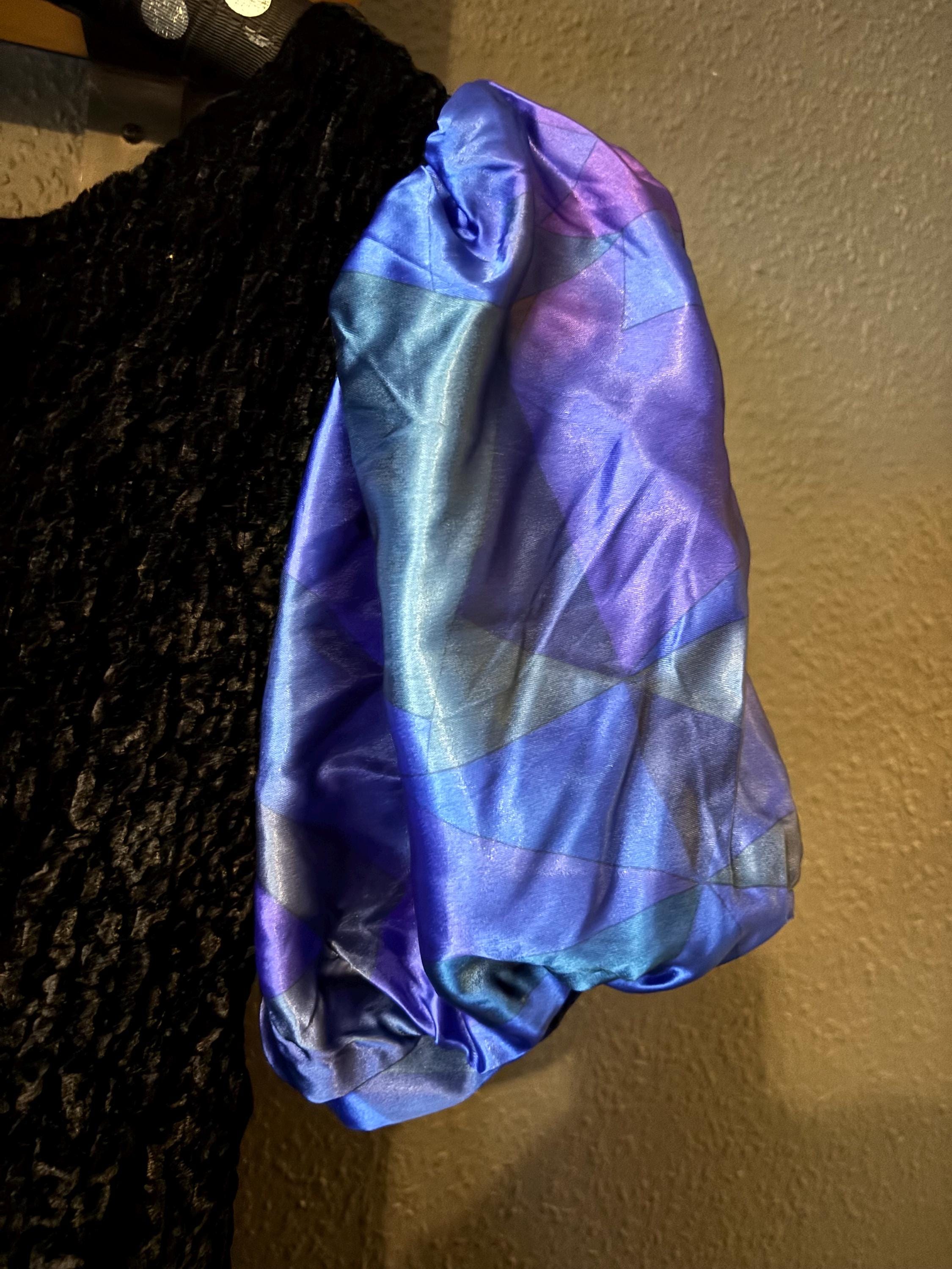 AMAZING Eighties prom dress in black with a blue/purple/green geometric print (it looks mostly blue on the pics and from afar but it is a very delicate geometric type print with purple/green also...see last photo taken on iphone with no flash)