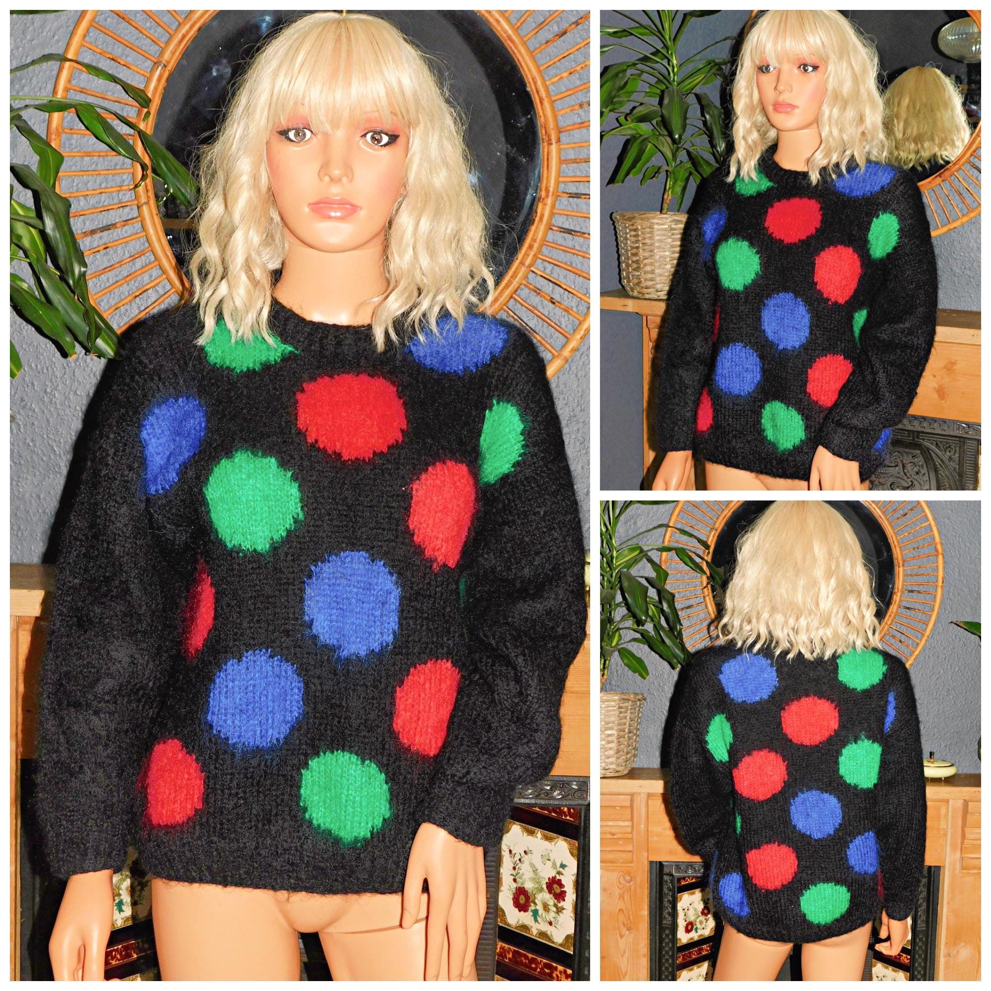 Eighties cosy shaggy mohair jumper in black with multicoloured spots!