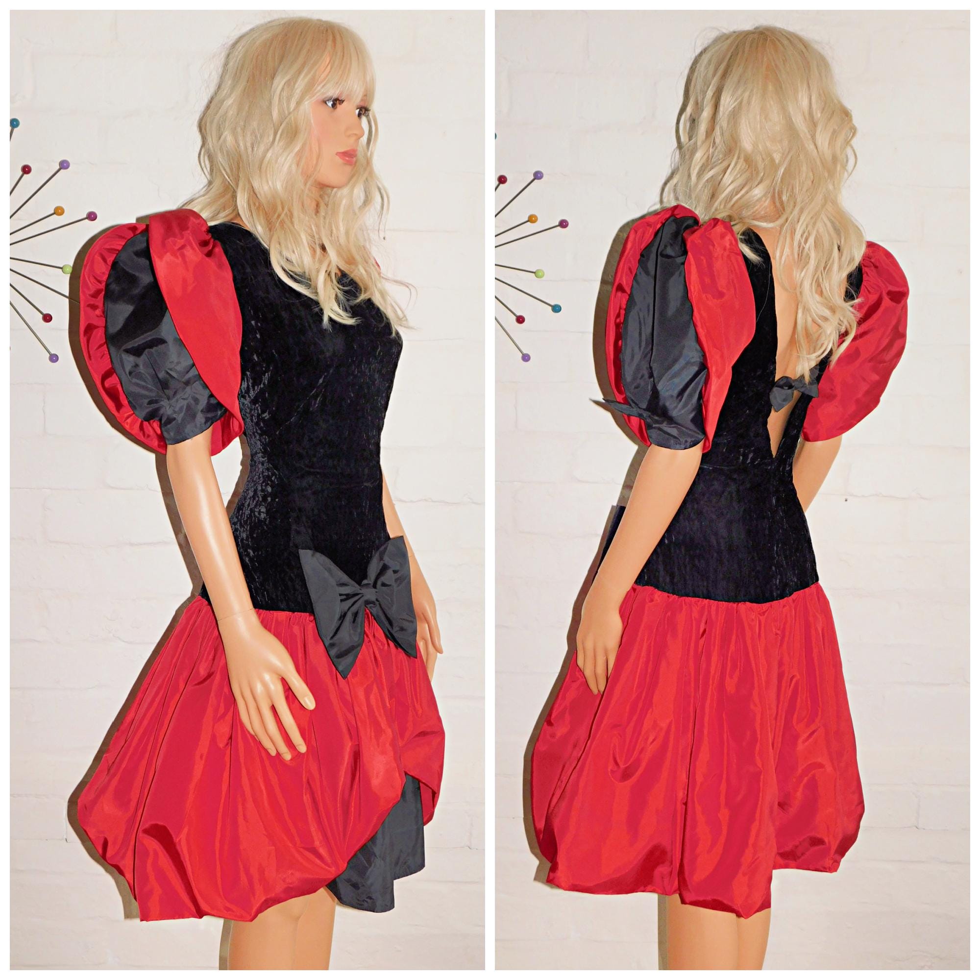 Vintage 80s Red Black BOW PUFFBALL Bubble Hem Mini Prom Party Dress 12 M 1980s Cocktail Extreme Avant Garde Queen of Hearts