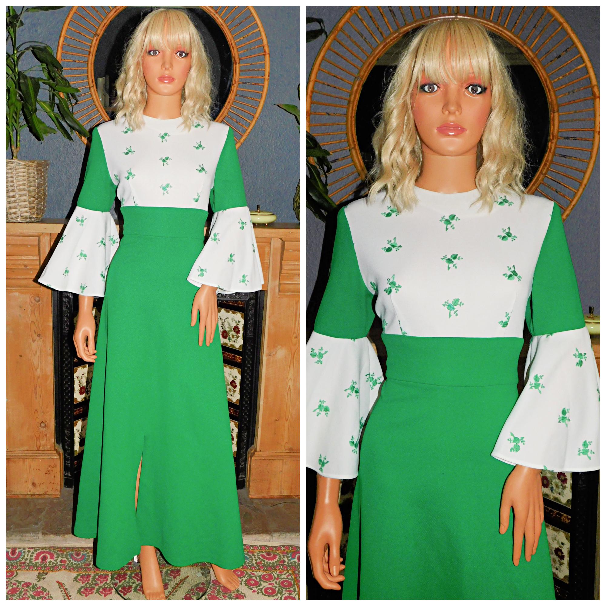 Vintage 70s APPLE Green White Embroidered BELL Slvd Maxi Dress 12 M 1970s Kitsch