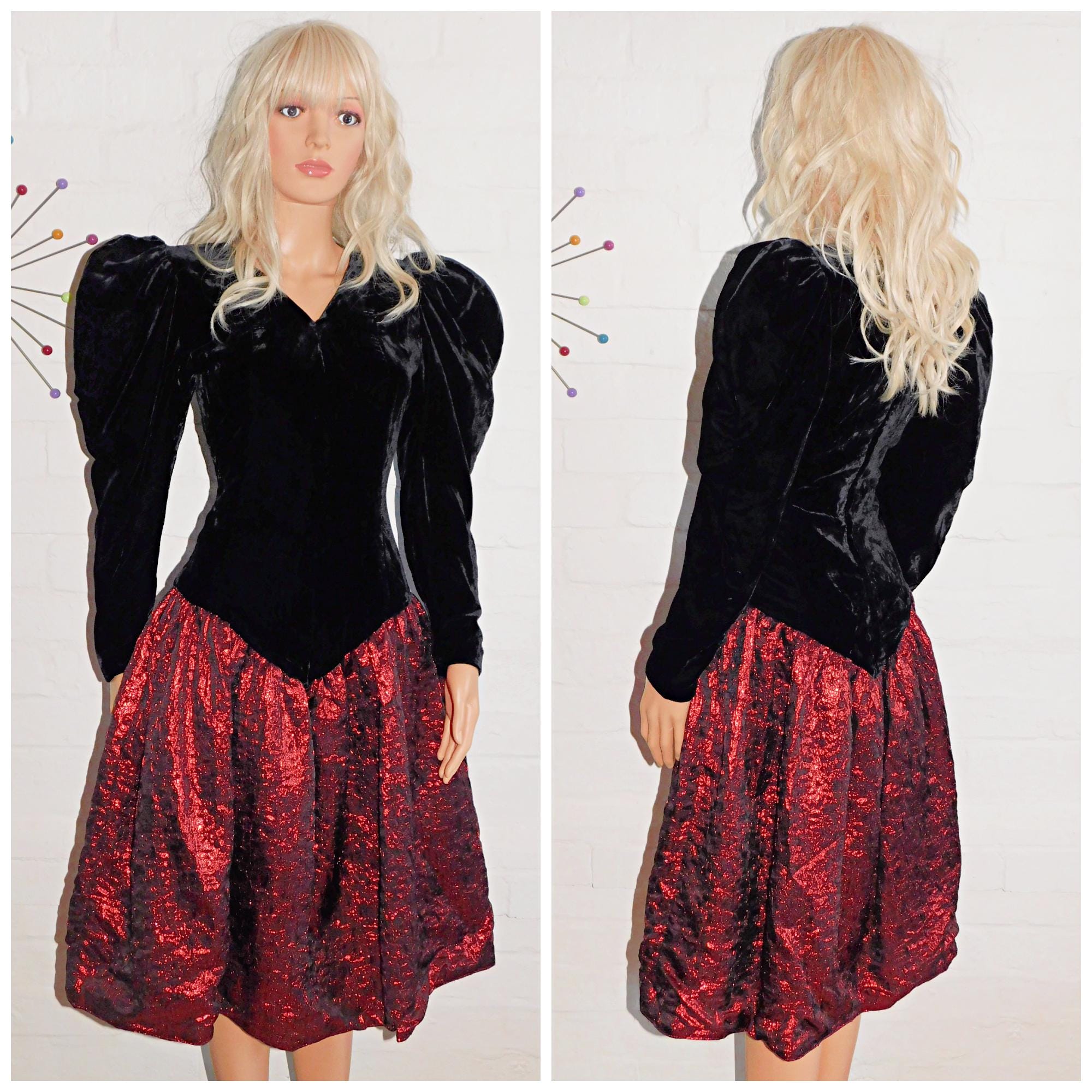 Vintage 1980s Black Velvet METALLIC Red PUFF Slvd Prom Party Dress 8 S 1980s Cocktail Kitsch