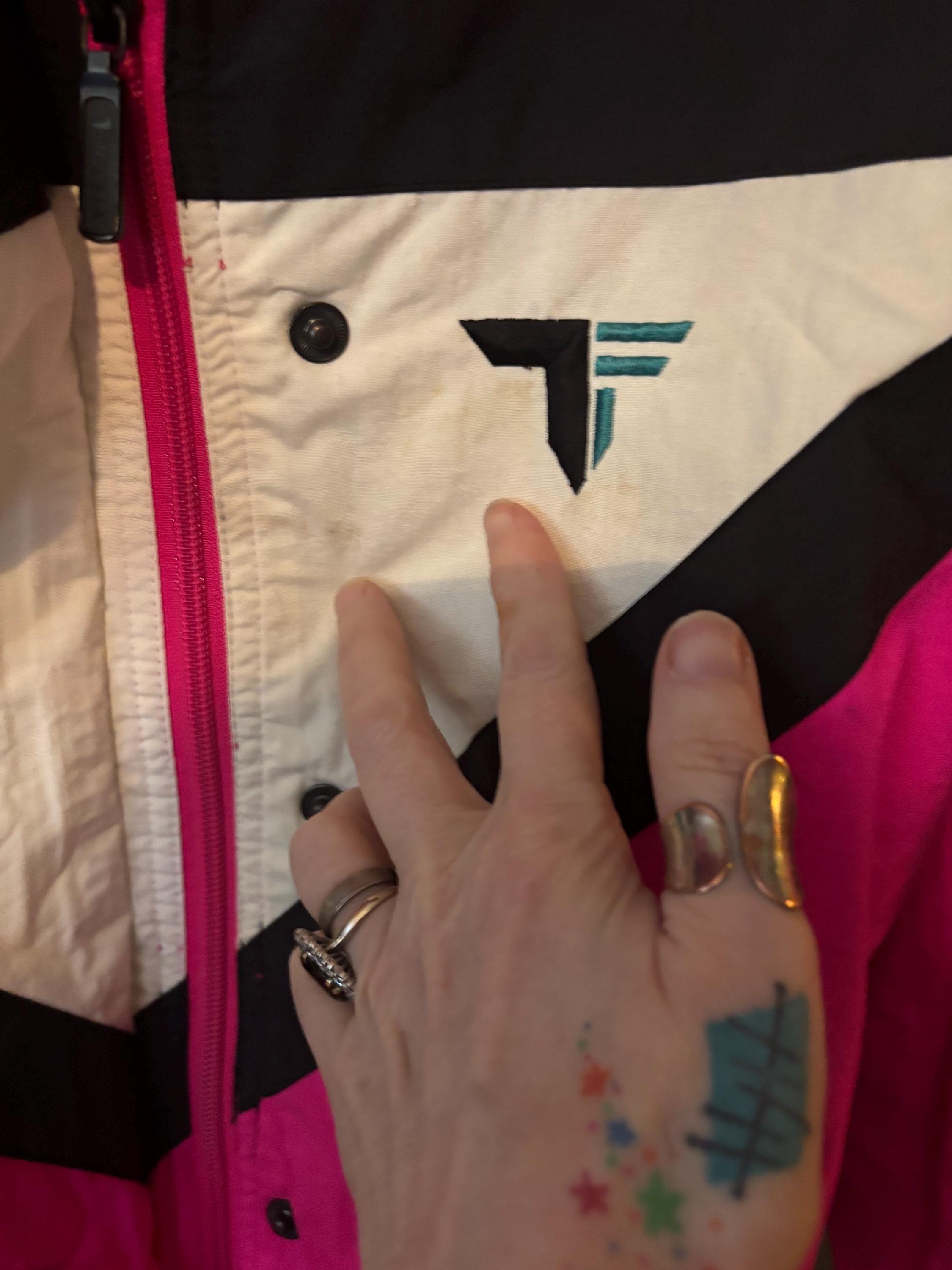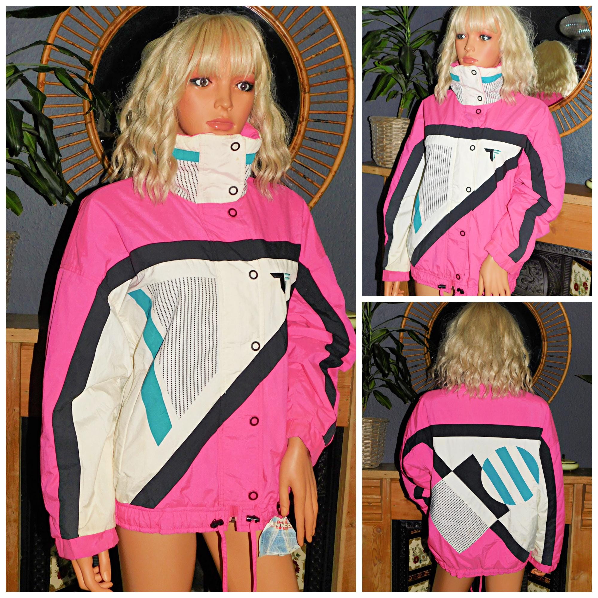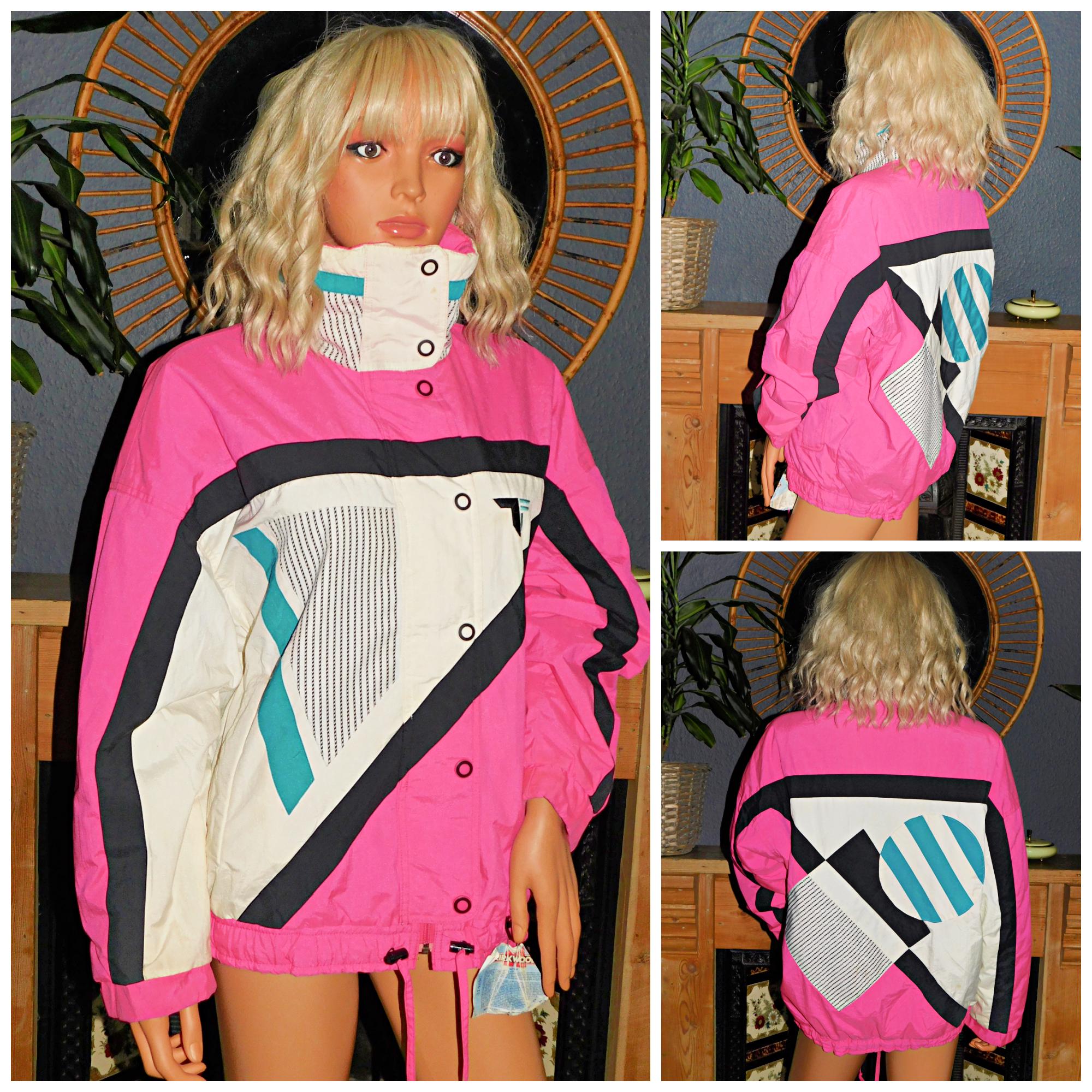 Classic padded 80s Ski jacket in neon pink/white/blue/black (white is a creamy white)