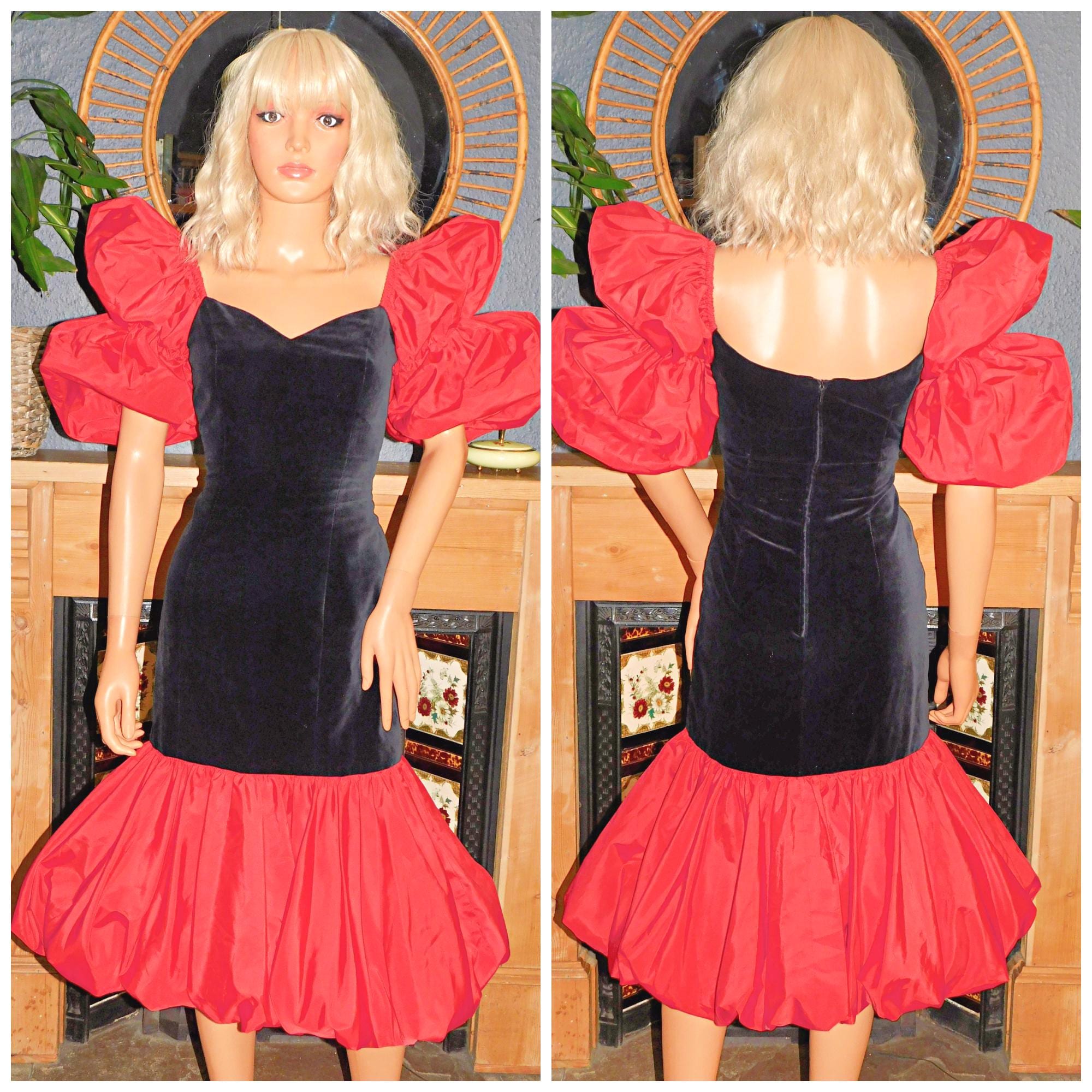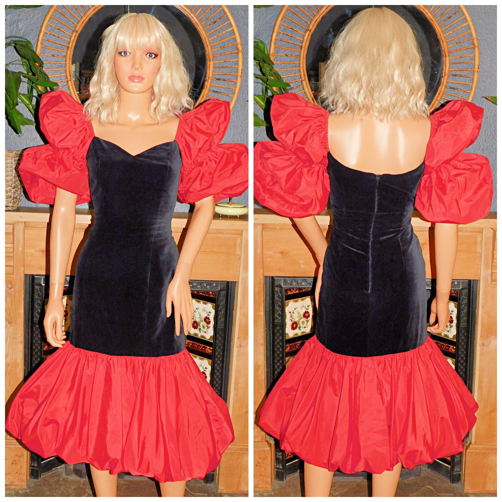Vintage 1980s AVANT GARDE Black Red Velvet Bubble Hem PUFFBALL Prom Party Dress 10 S 80s