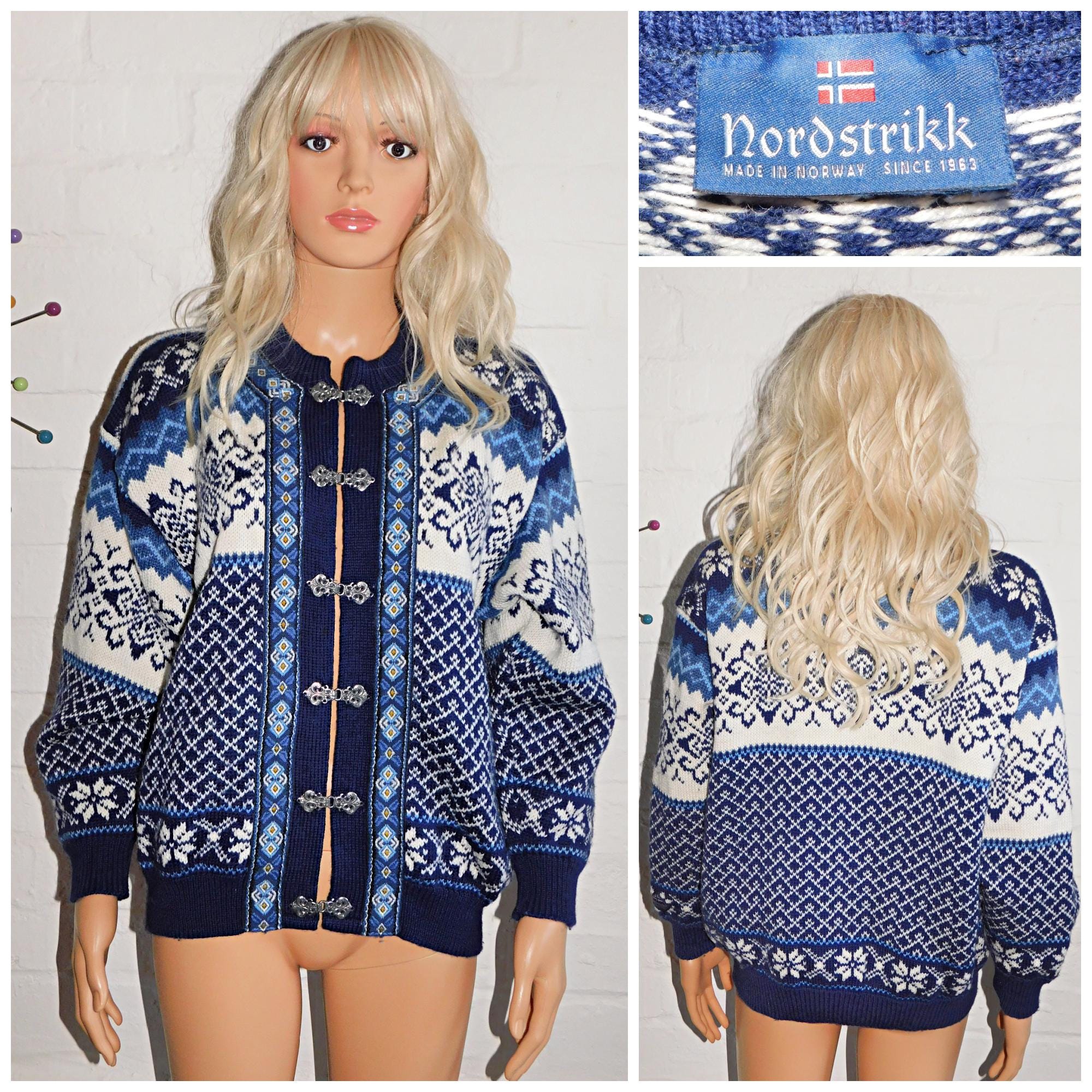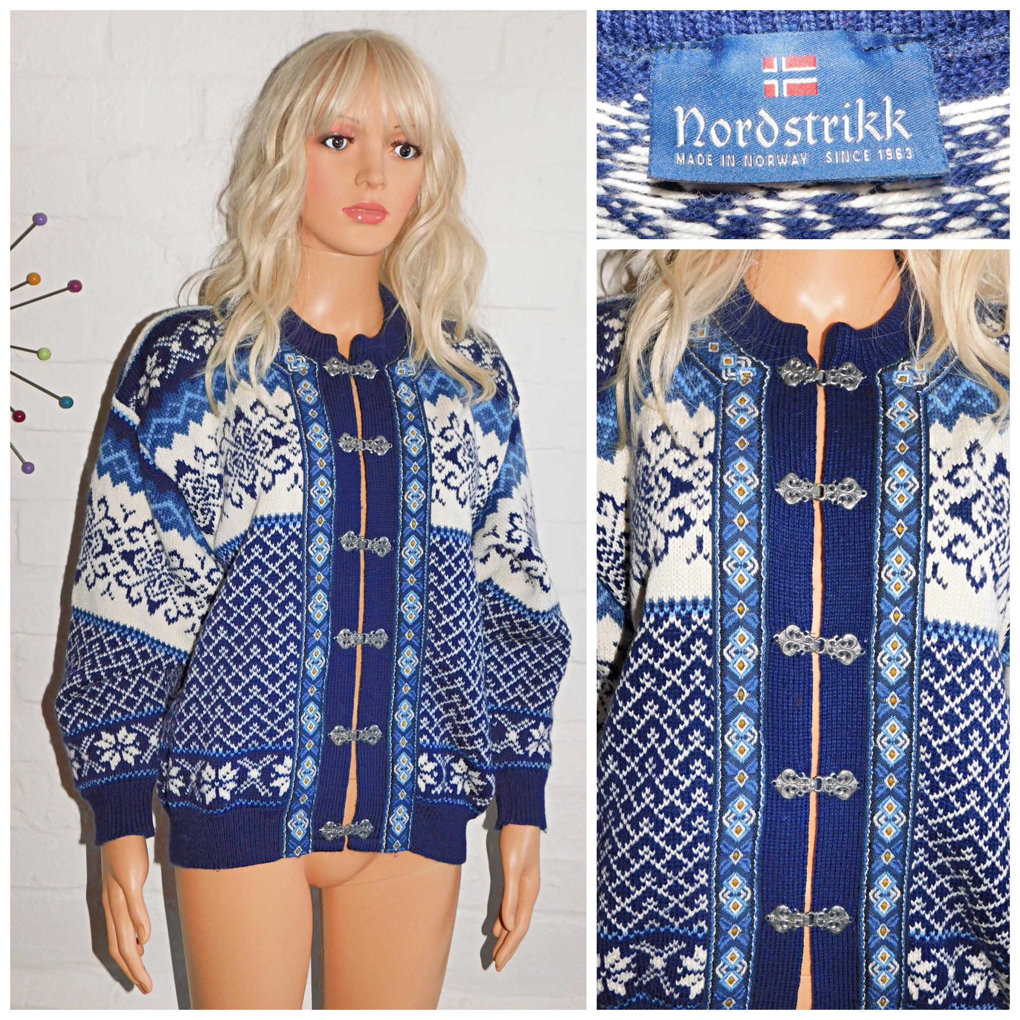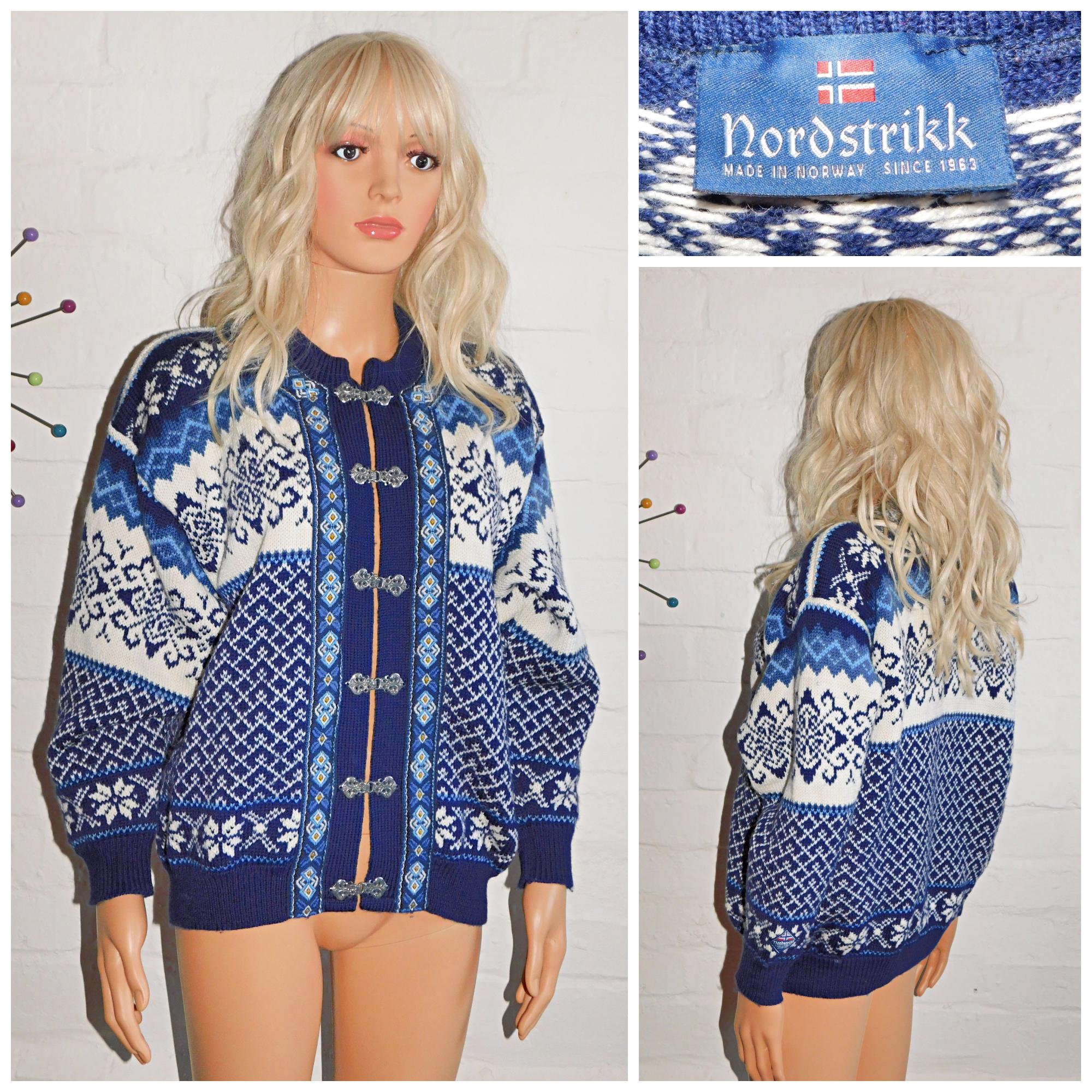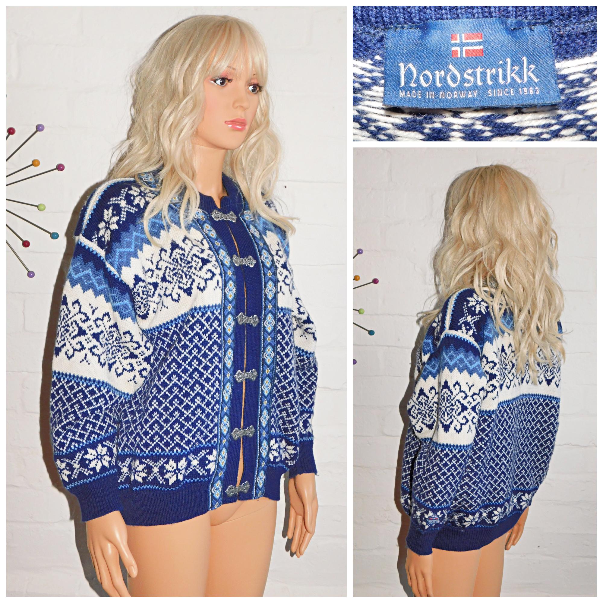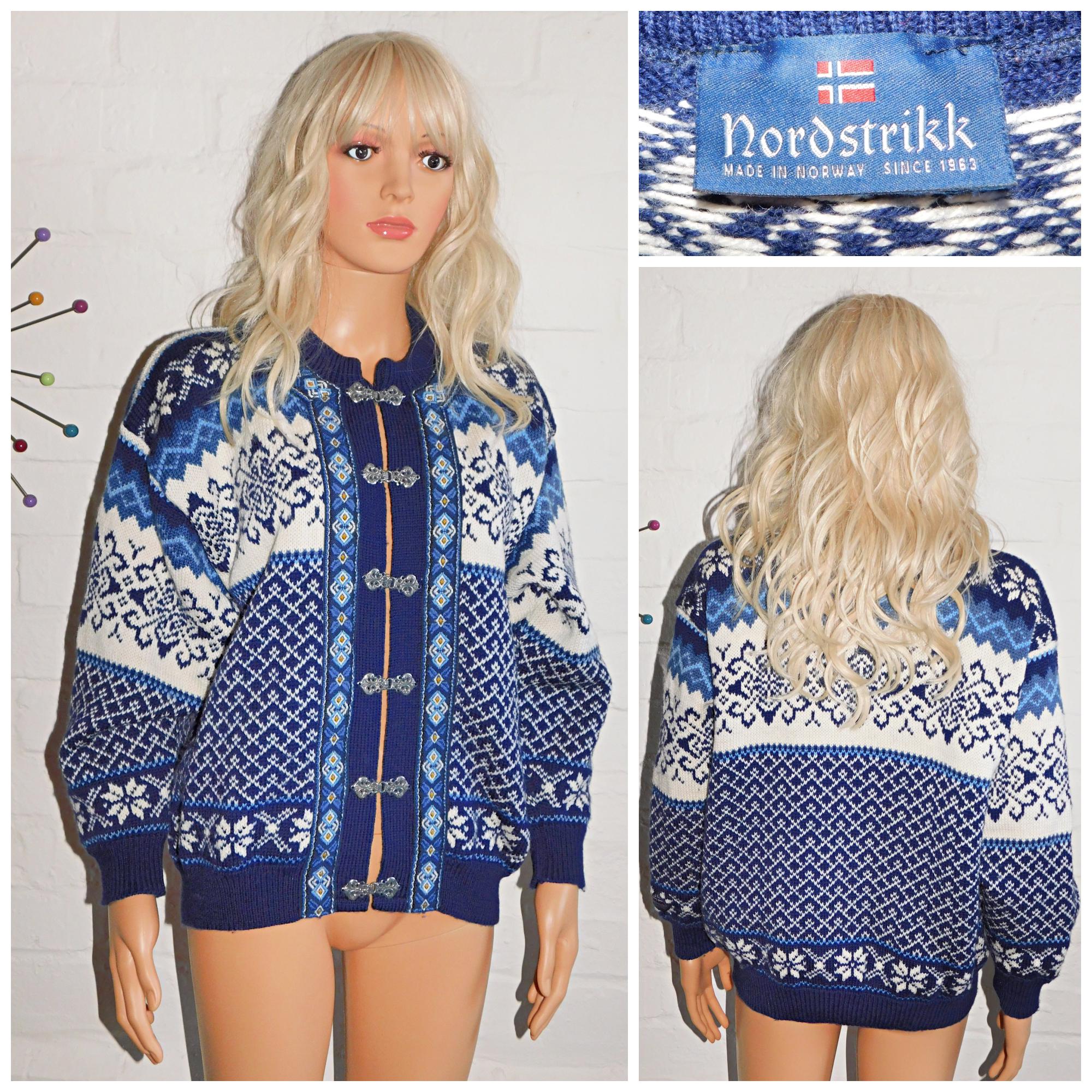Vintage 90s Nordstrikk NORDIC PURE WOOL Cream/Blue Patterned Cardigan S M 1990s Christmas Scandinavian Norwegian Winter