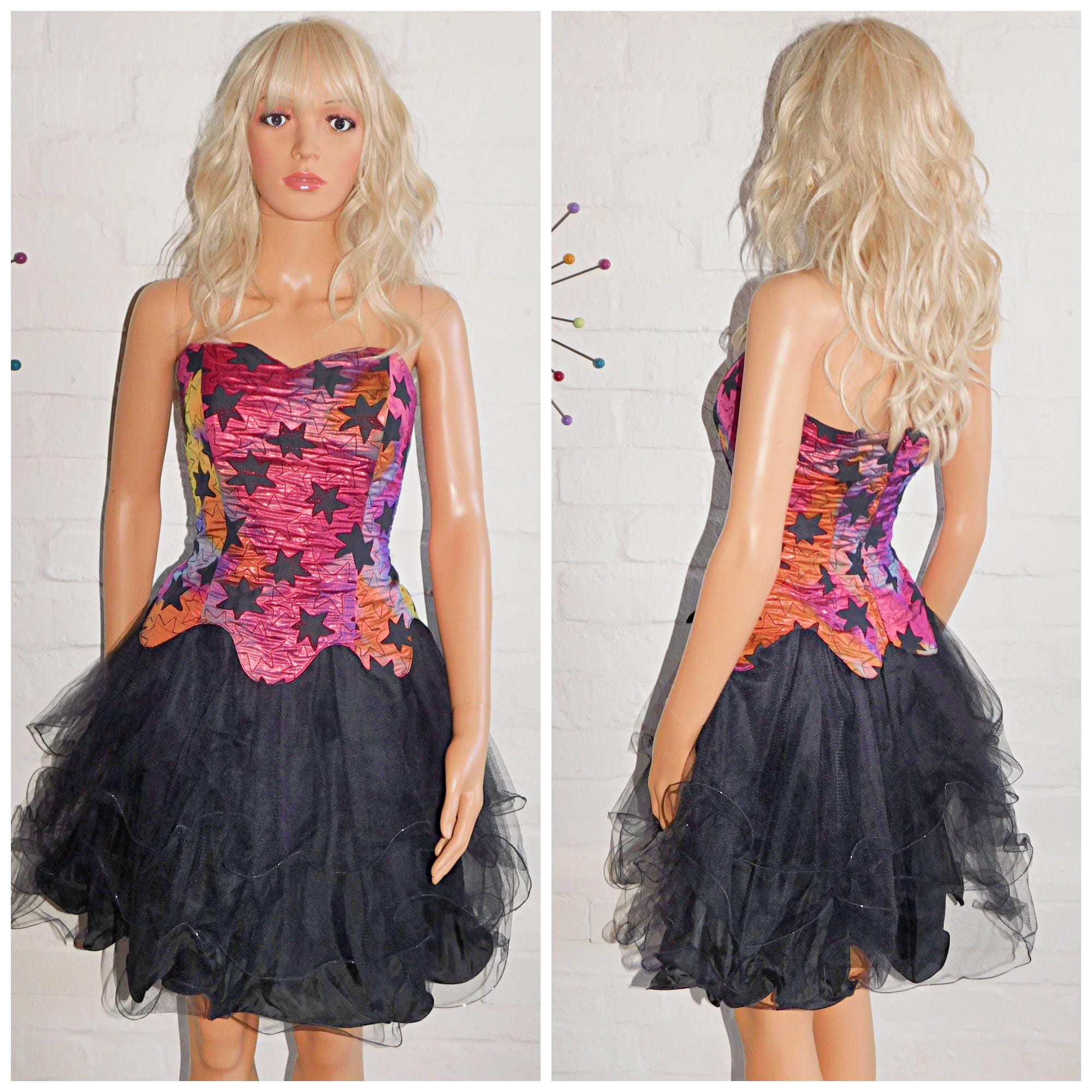 AMAZING Eighties mini prom dress in black with contrasting bright pinky/orange/purple metallic star print