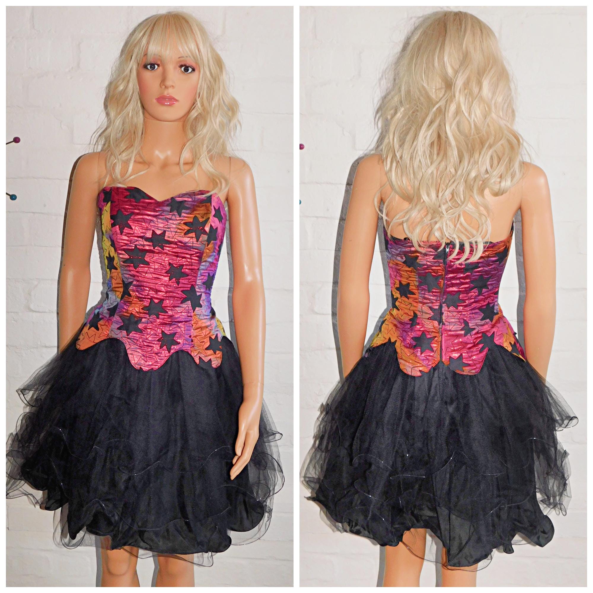 Vintage 80s Black Pink METALLIC STAR Strapless Net TULLE Prom Party Dress 8 S 1980s Kitsch