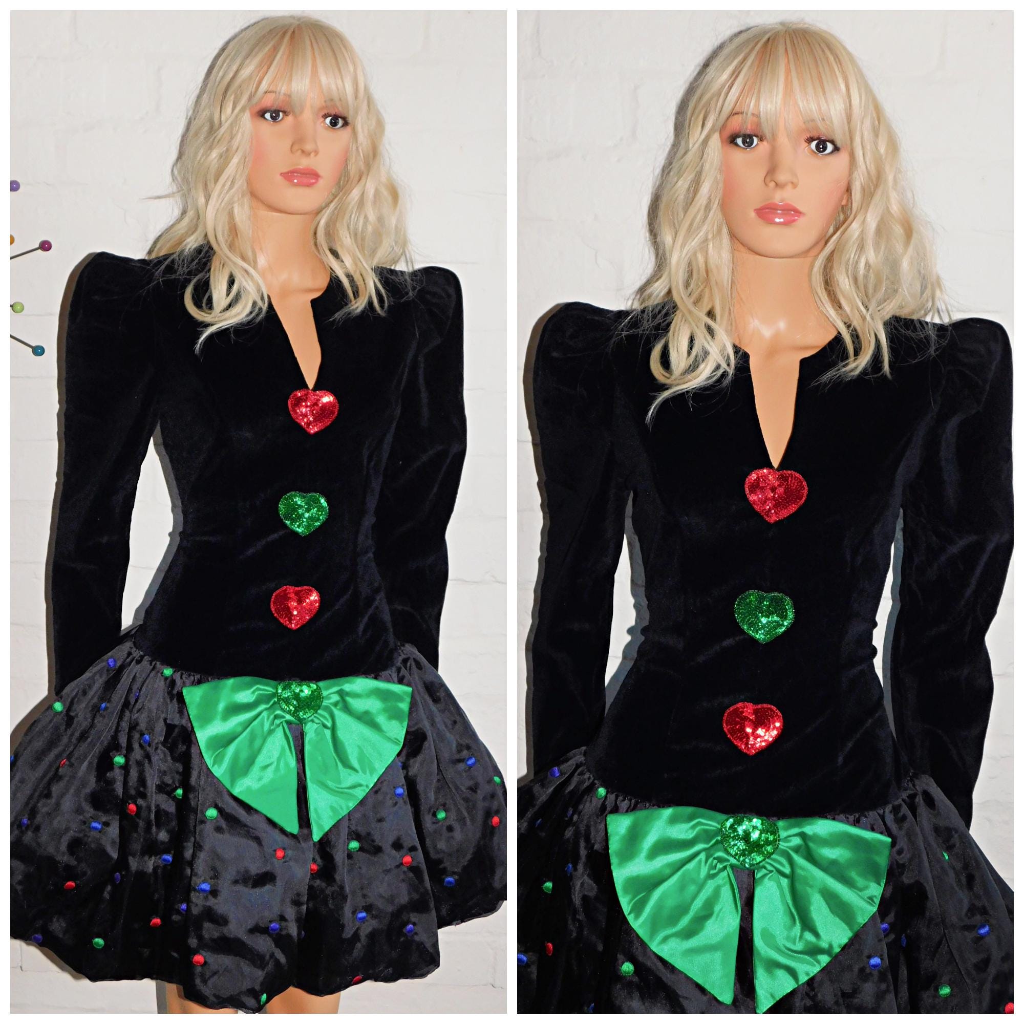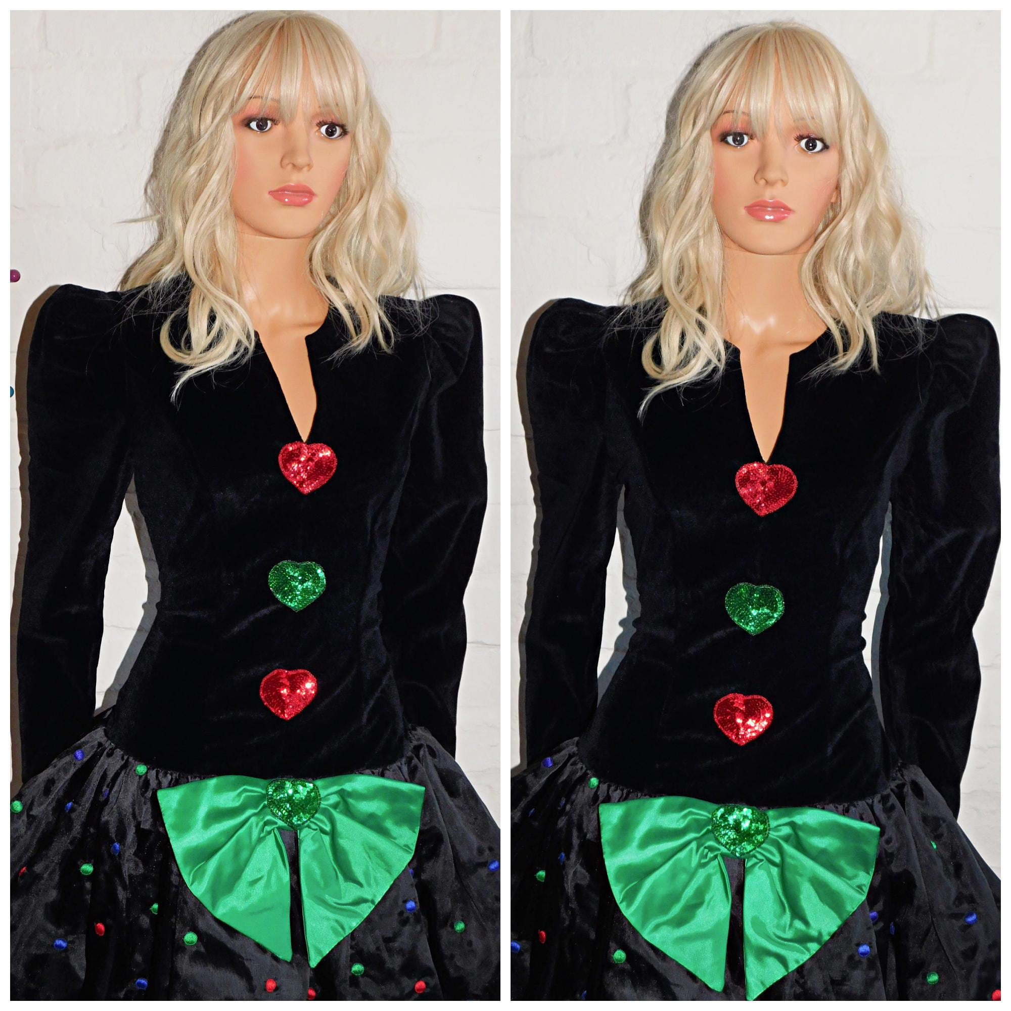 Fitted black velvet bodice with applique sequin hearts (top one is attatched at the top of the heart only)