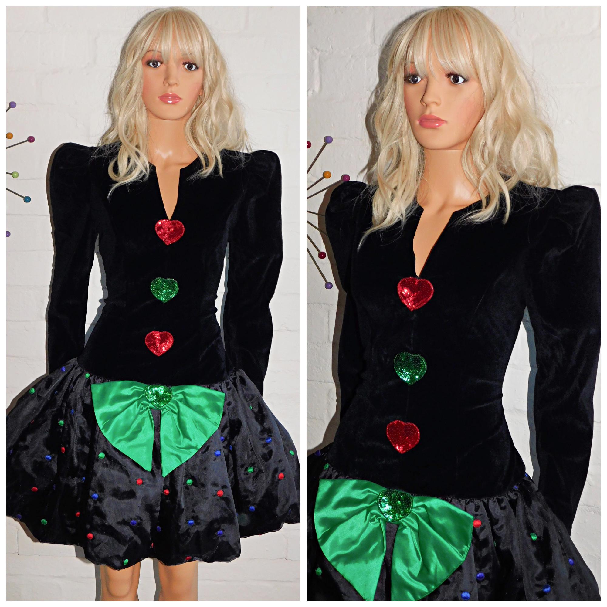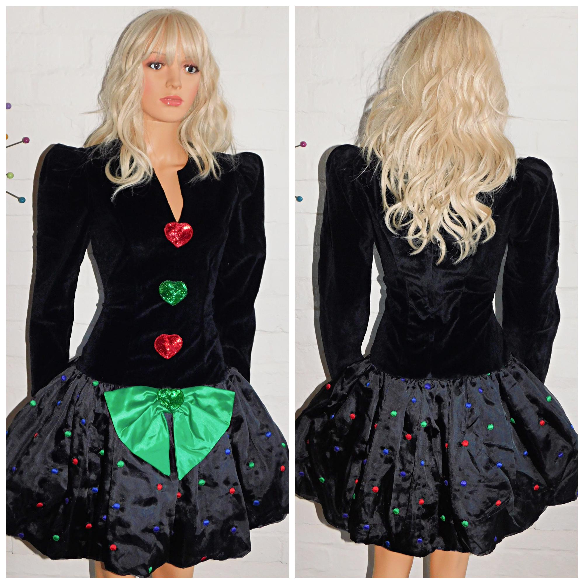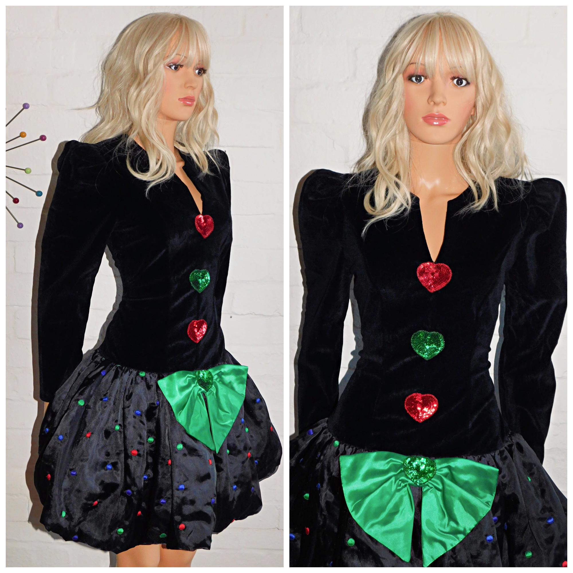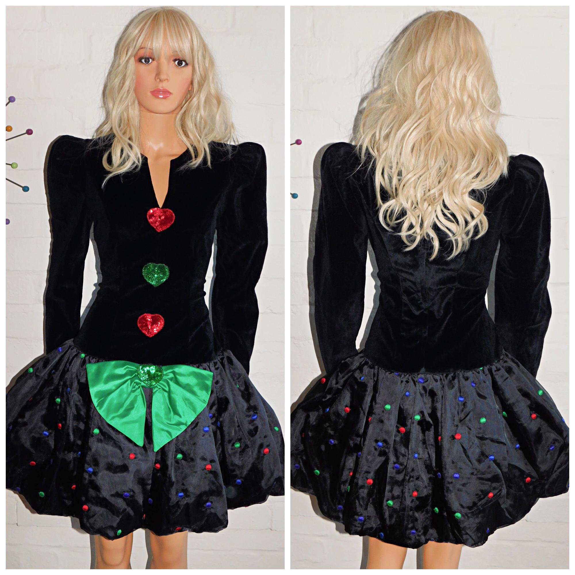 Vintage 80s Black SPOTTY BOW Drop Waist BUBBLE Hem Prom Party Dress 10 12 S M Puffball 1980s Kitsch