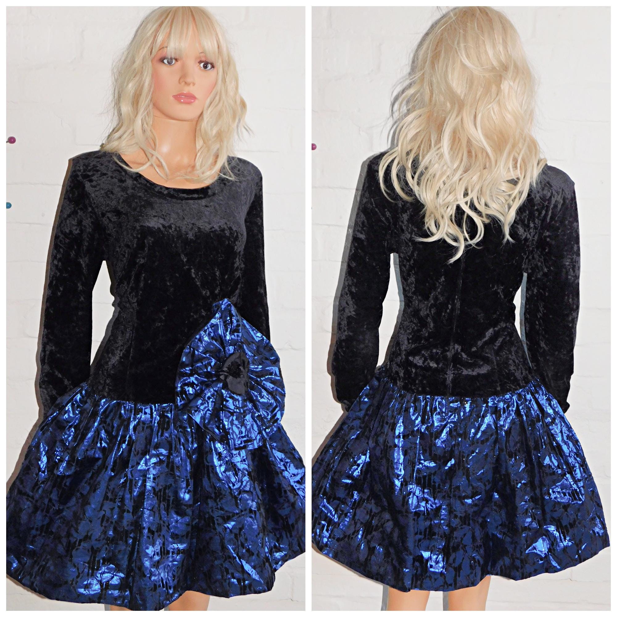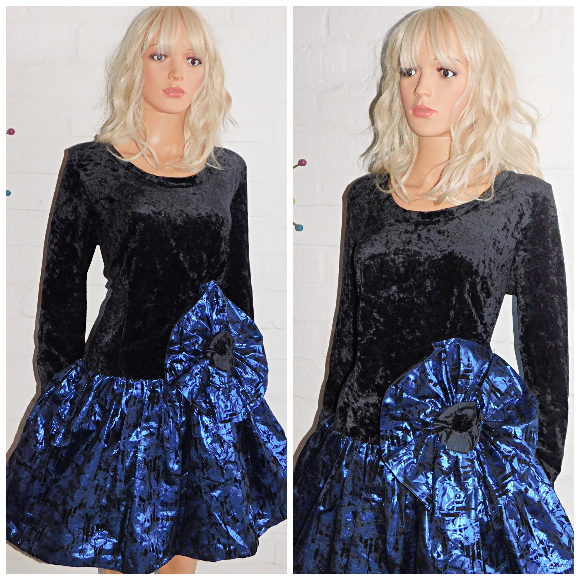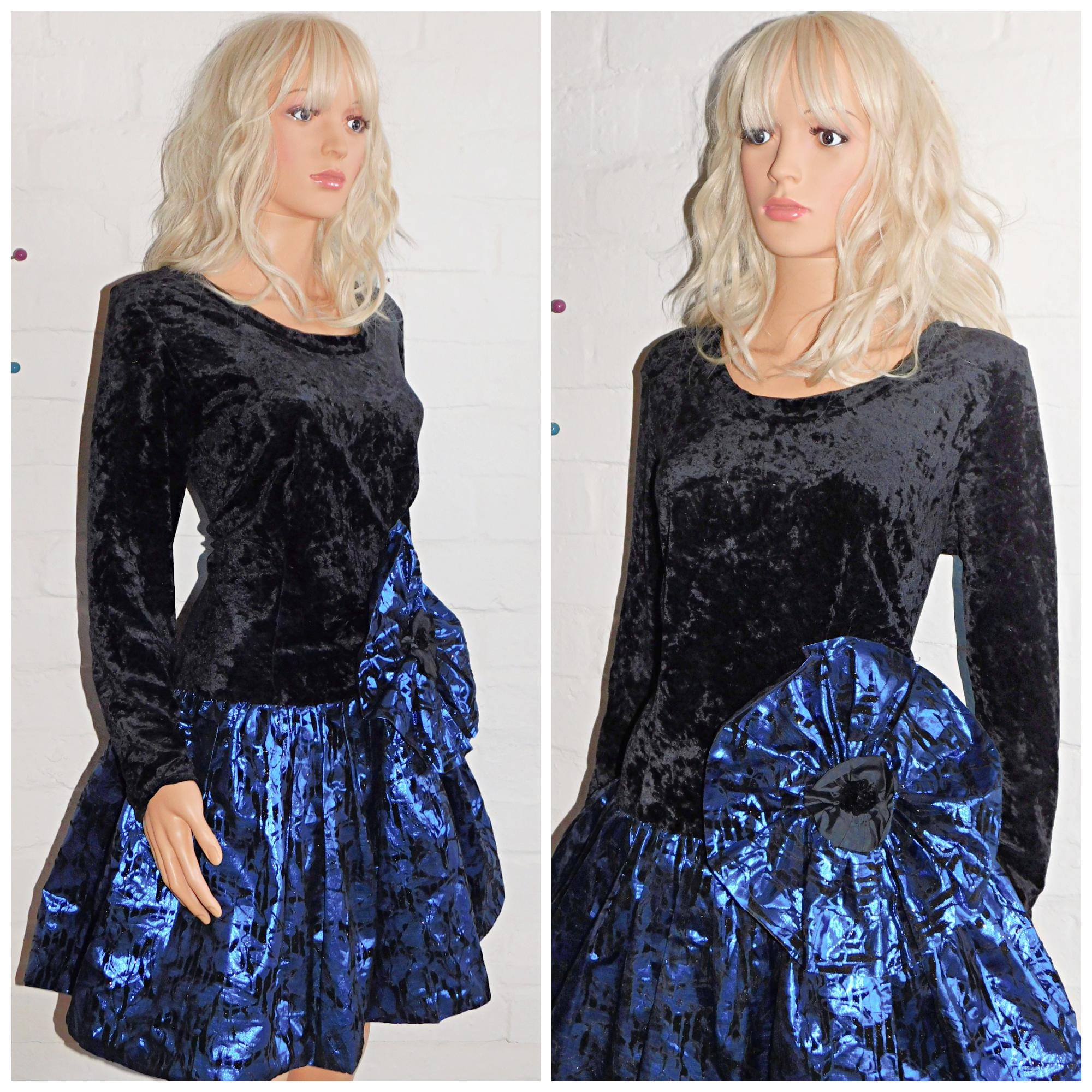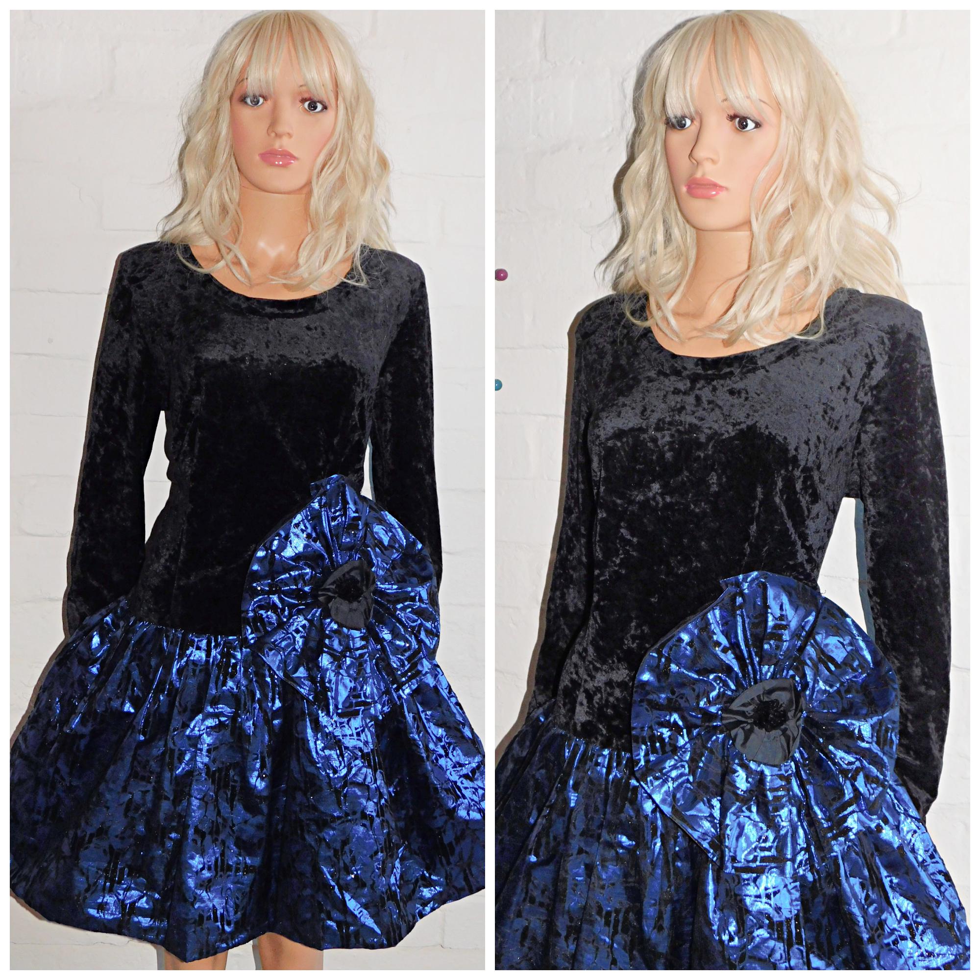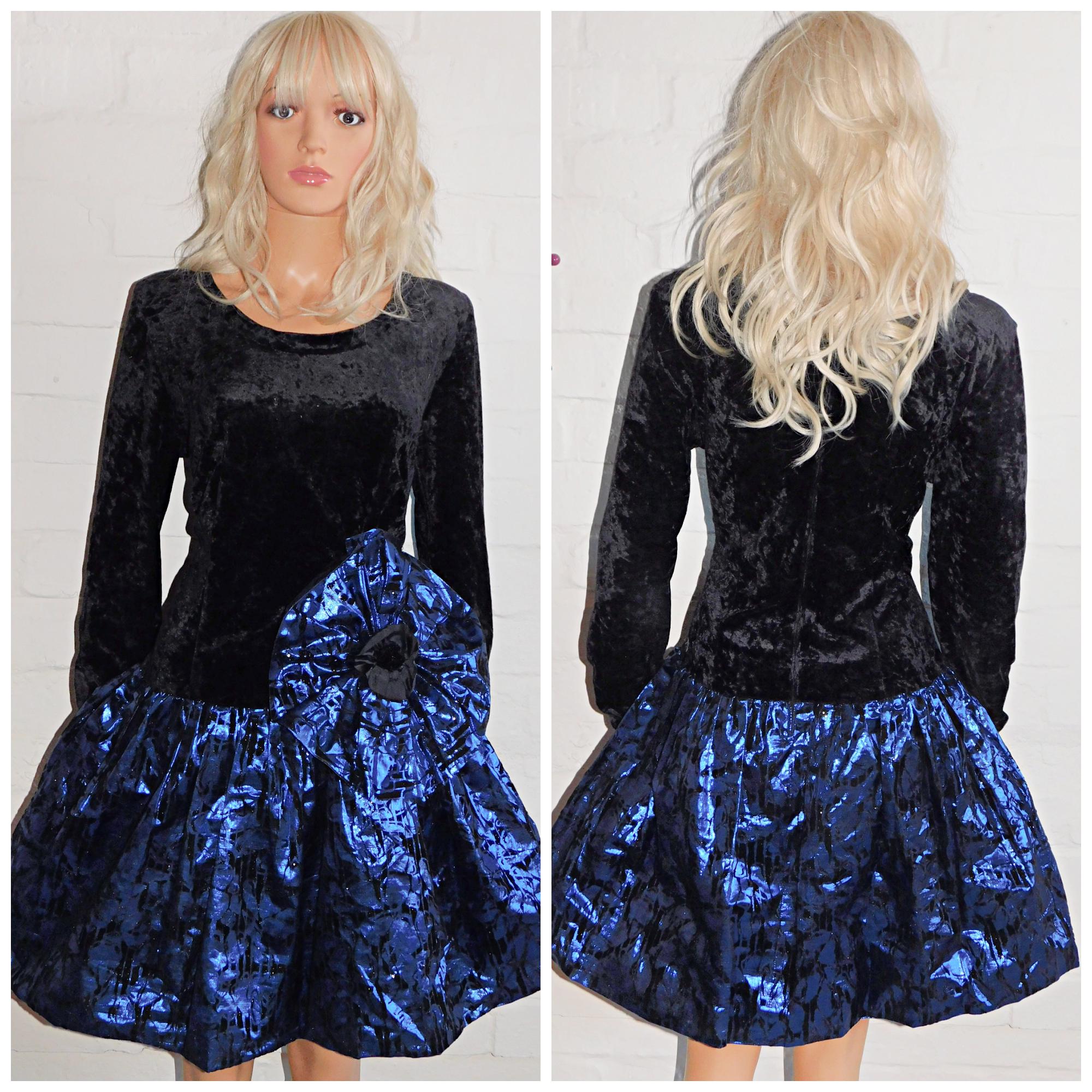 Vintage 1980s Avant Garde Black METALLIC Blue Velvet Drop Waist Puffball Prom Party Dress 80s 16 18 L Xl 80s Kitsch
