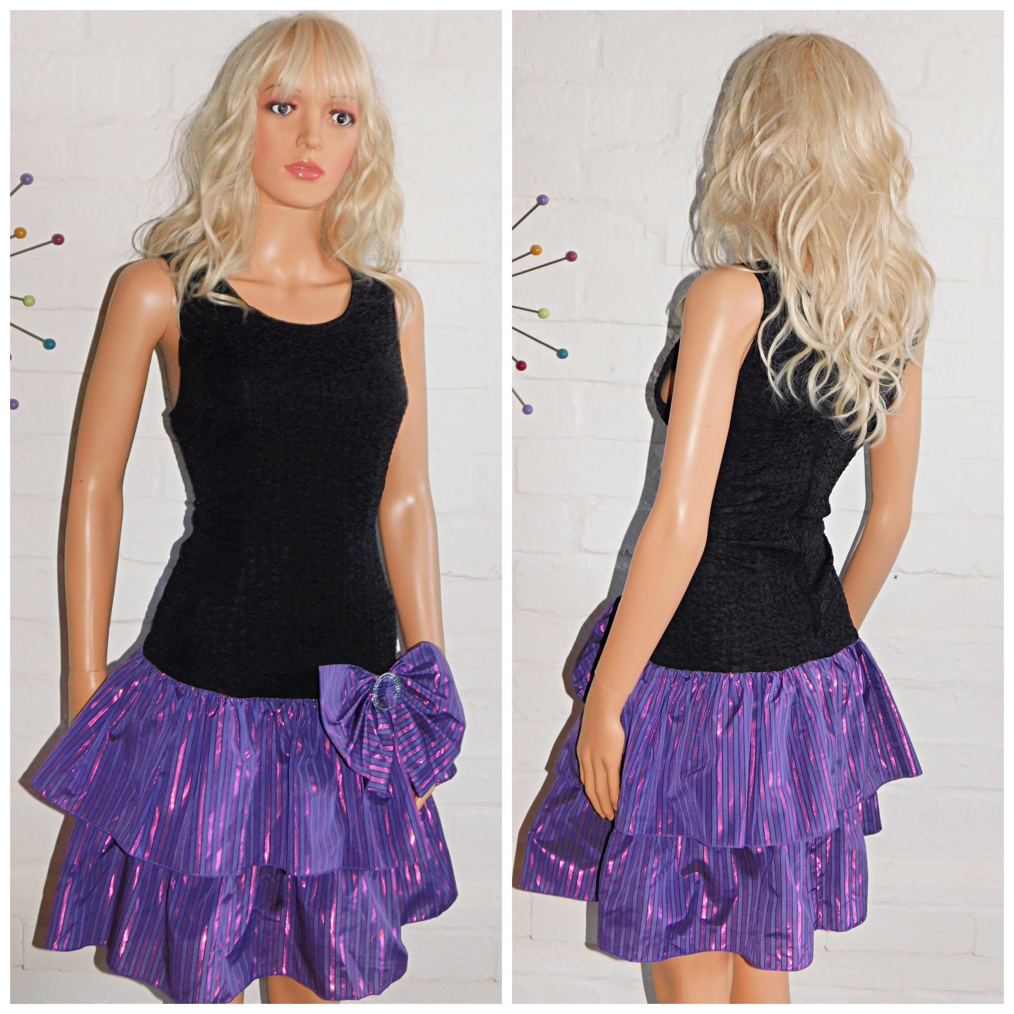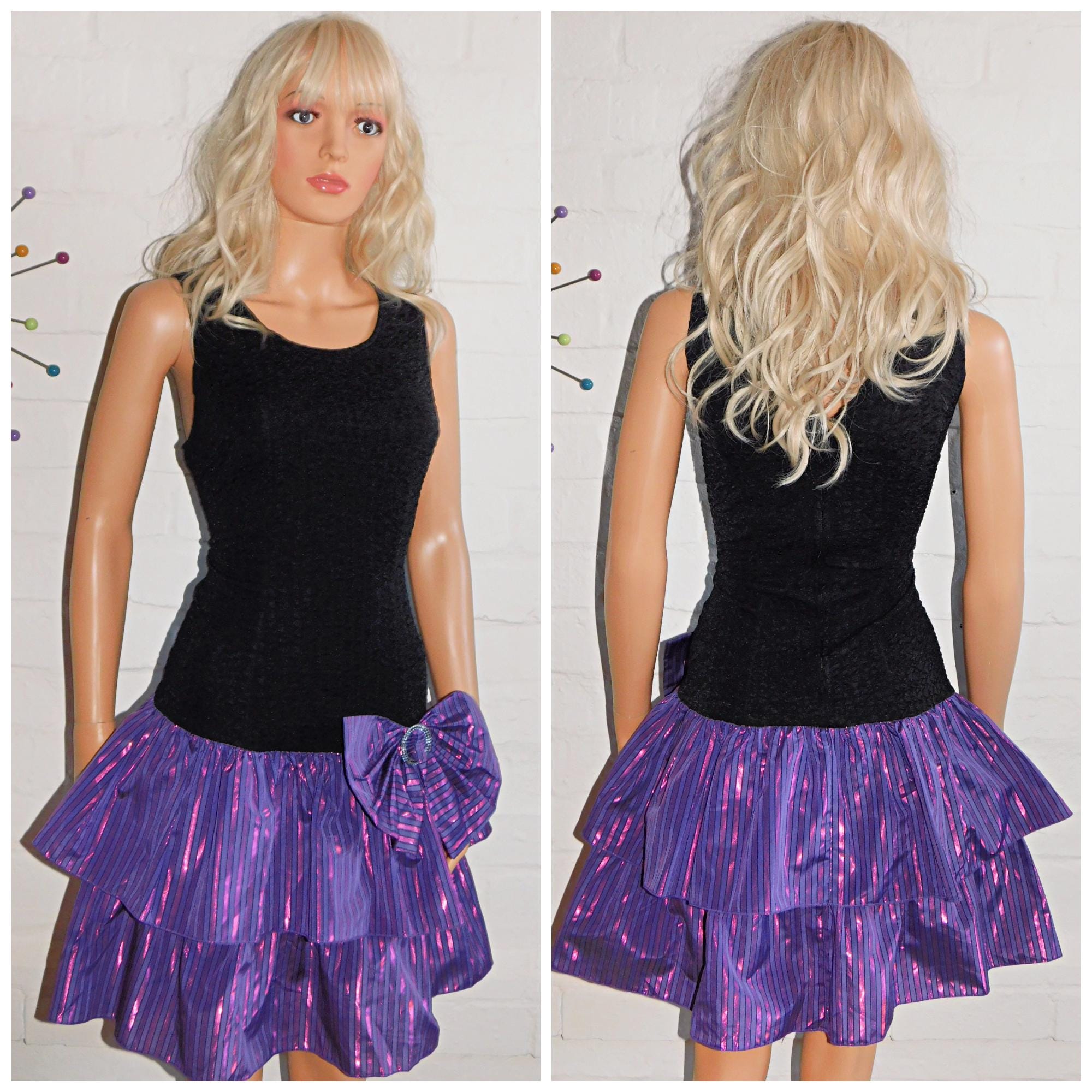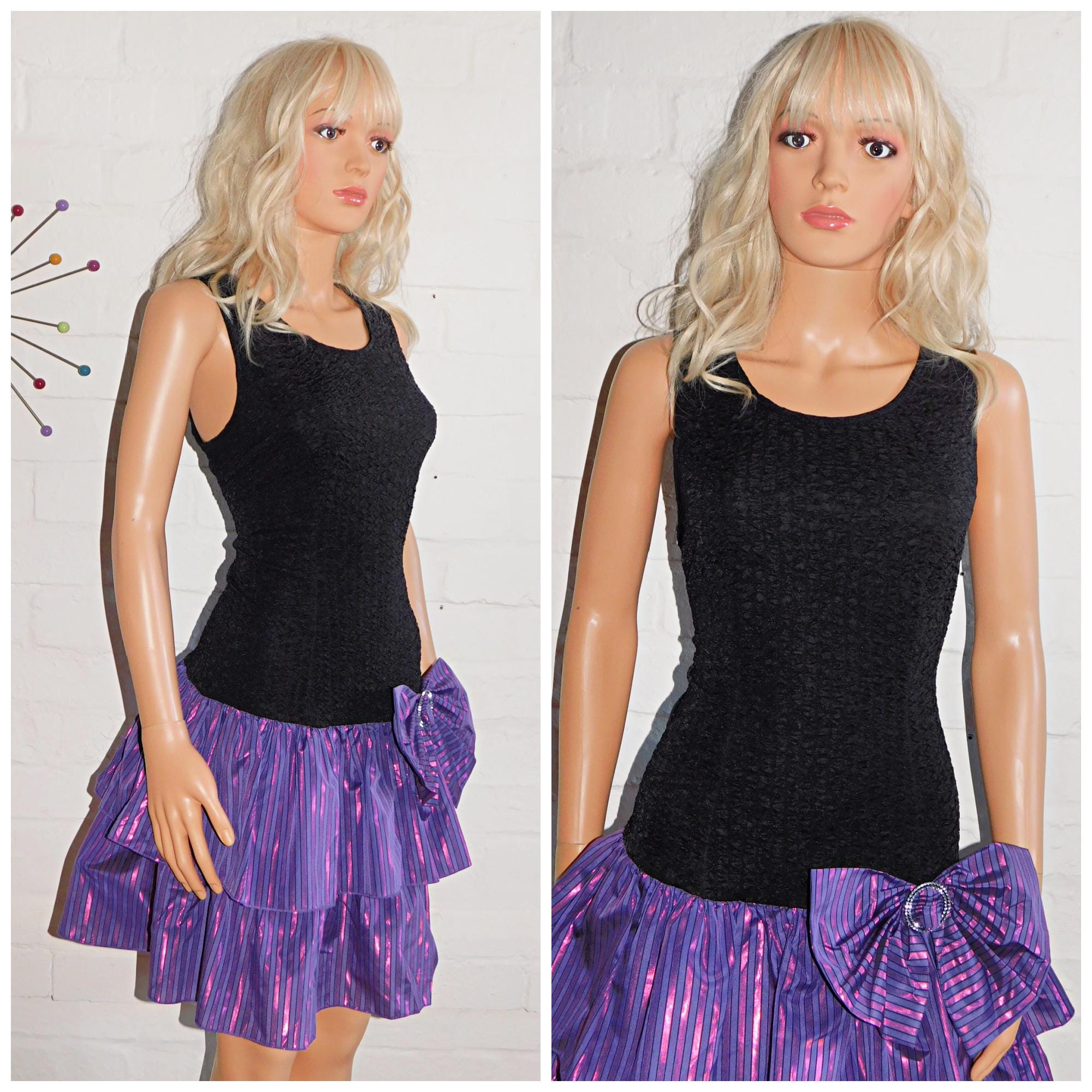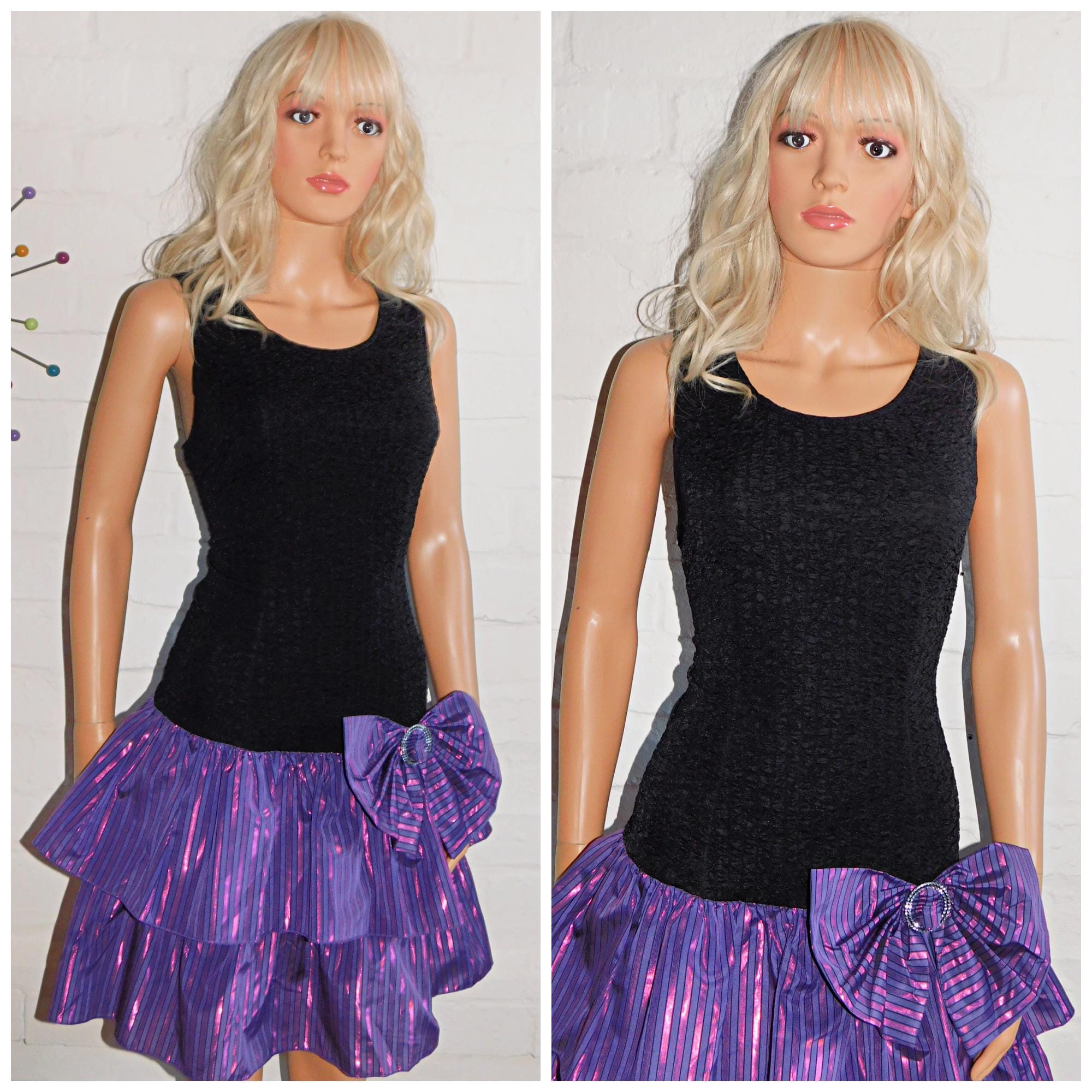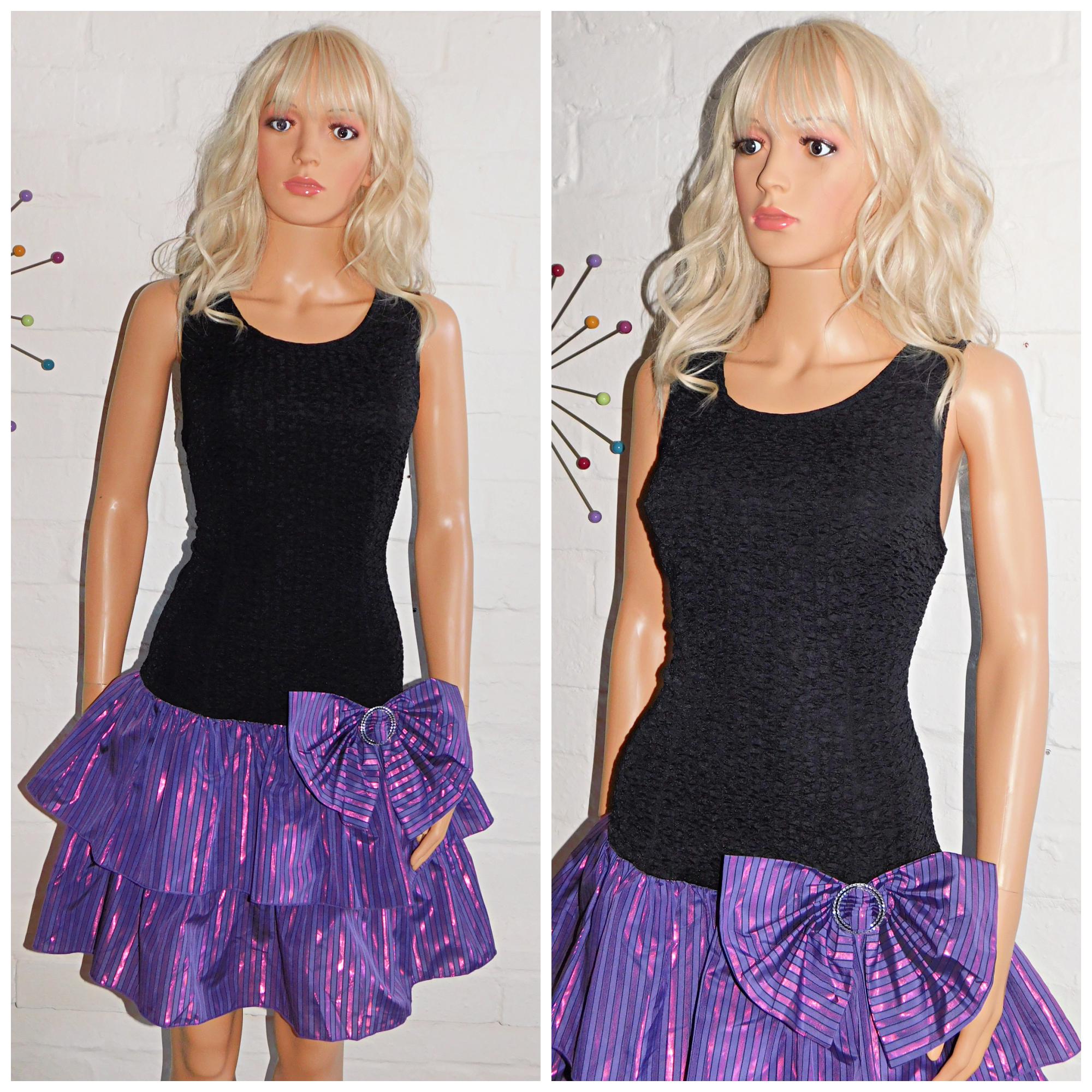 Vintage 80s Black Purple Drop Waist BOW RARA Prom Party Dress 10 12 S M 1980s Cocktail Evening Kitsch