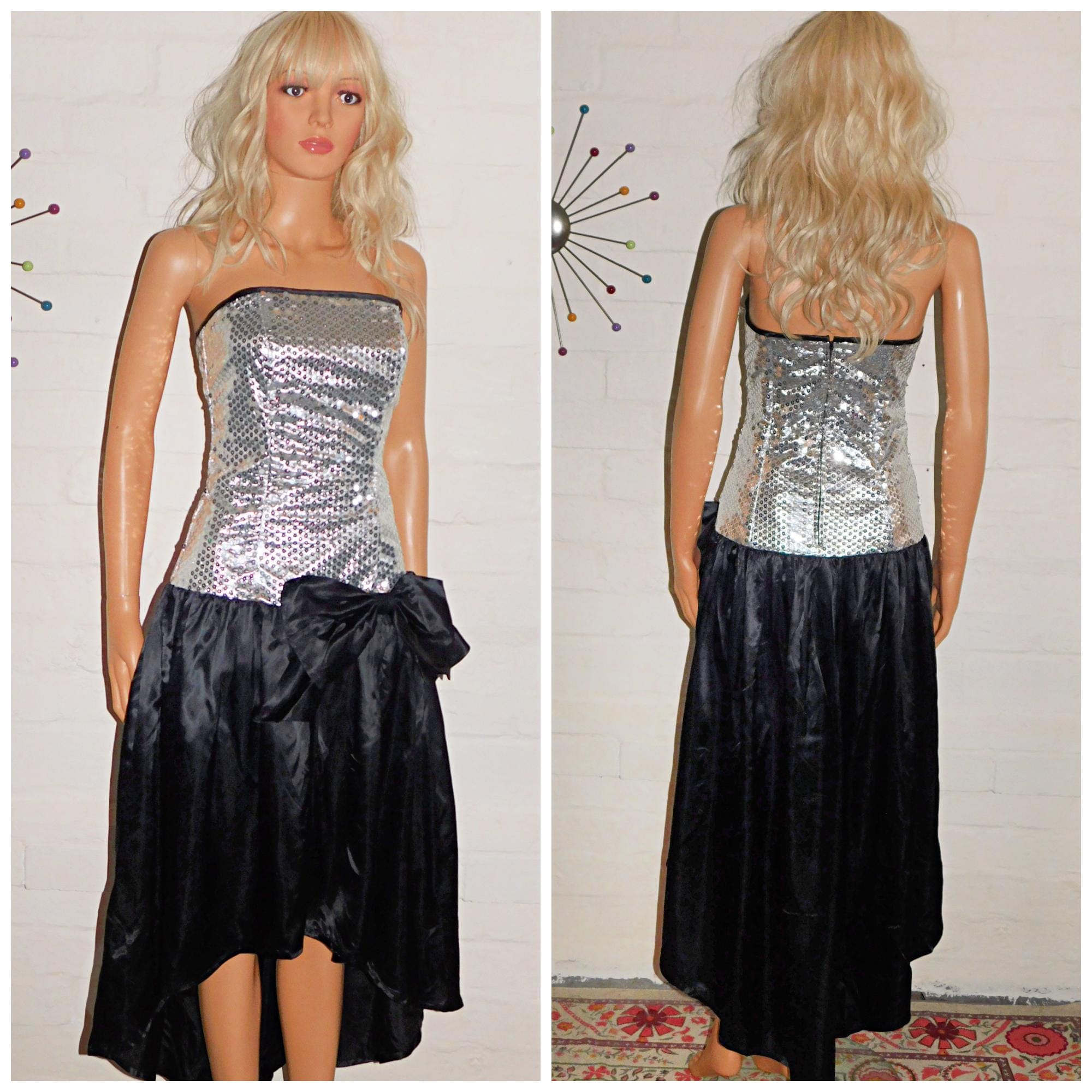 Vintage 80s STRAPLESS METALLIC SILVER Sequin Bow Cocktail Prom Party Dress 8 10 S 1980s Evening