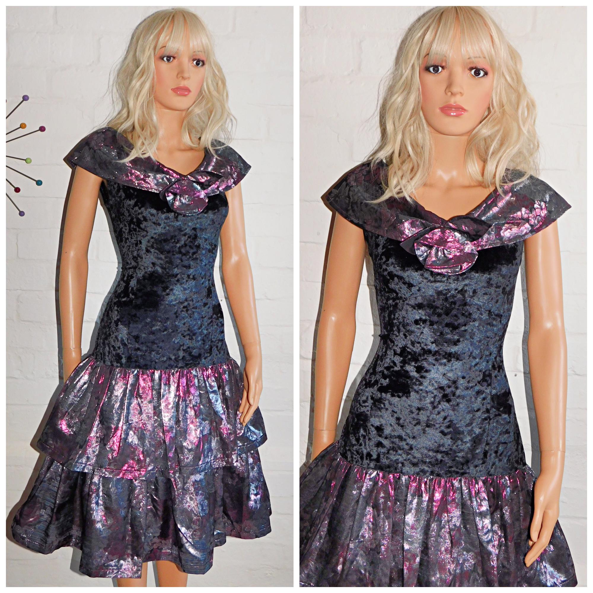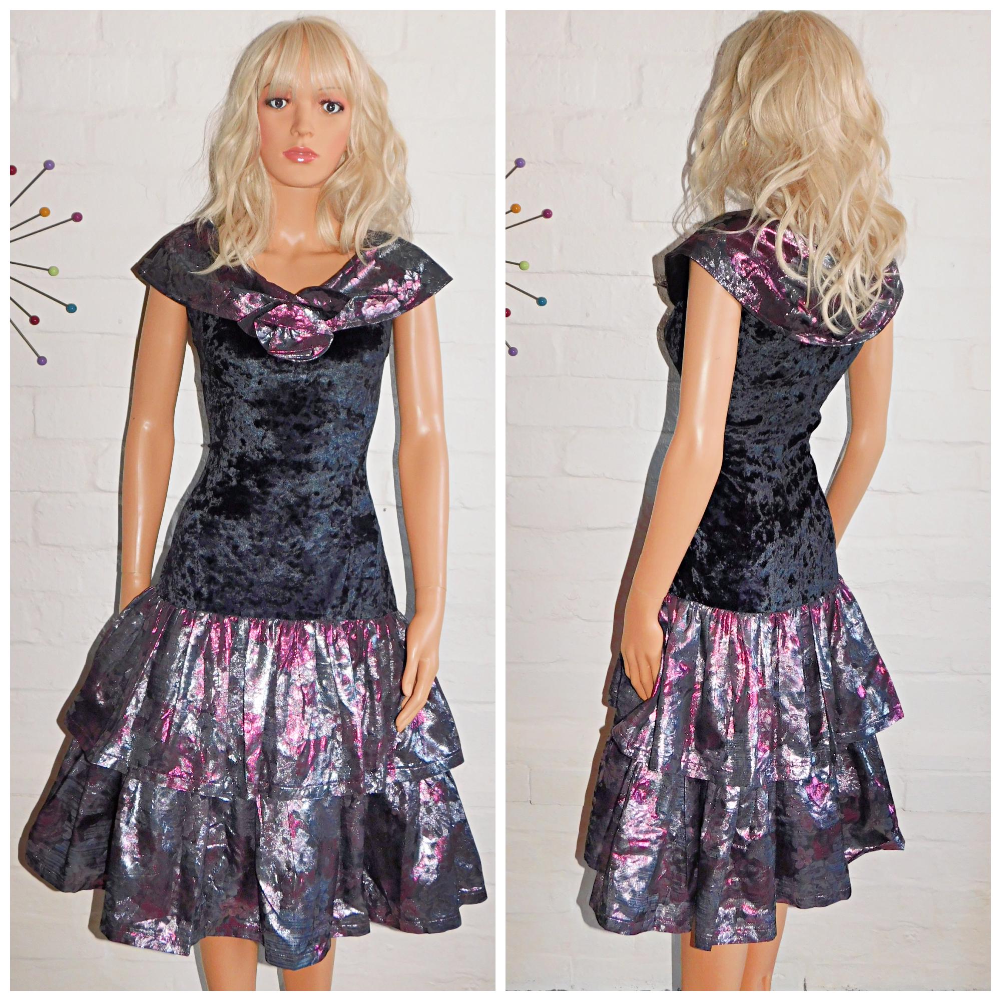 Vintage 80s Black Multicoloured METALLIC RARA Prom Party Dress 8 10 S 1980s Kitsch Shawl Collar
