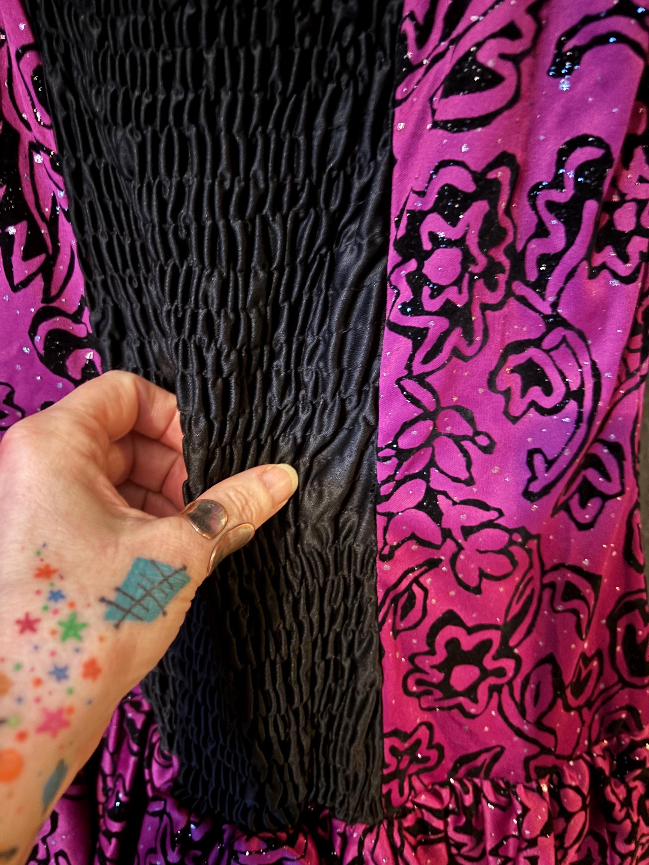 AMAZING Eighties prom dress in a magenta/black glittery abstract floral print