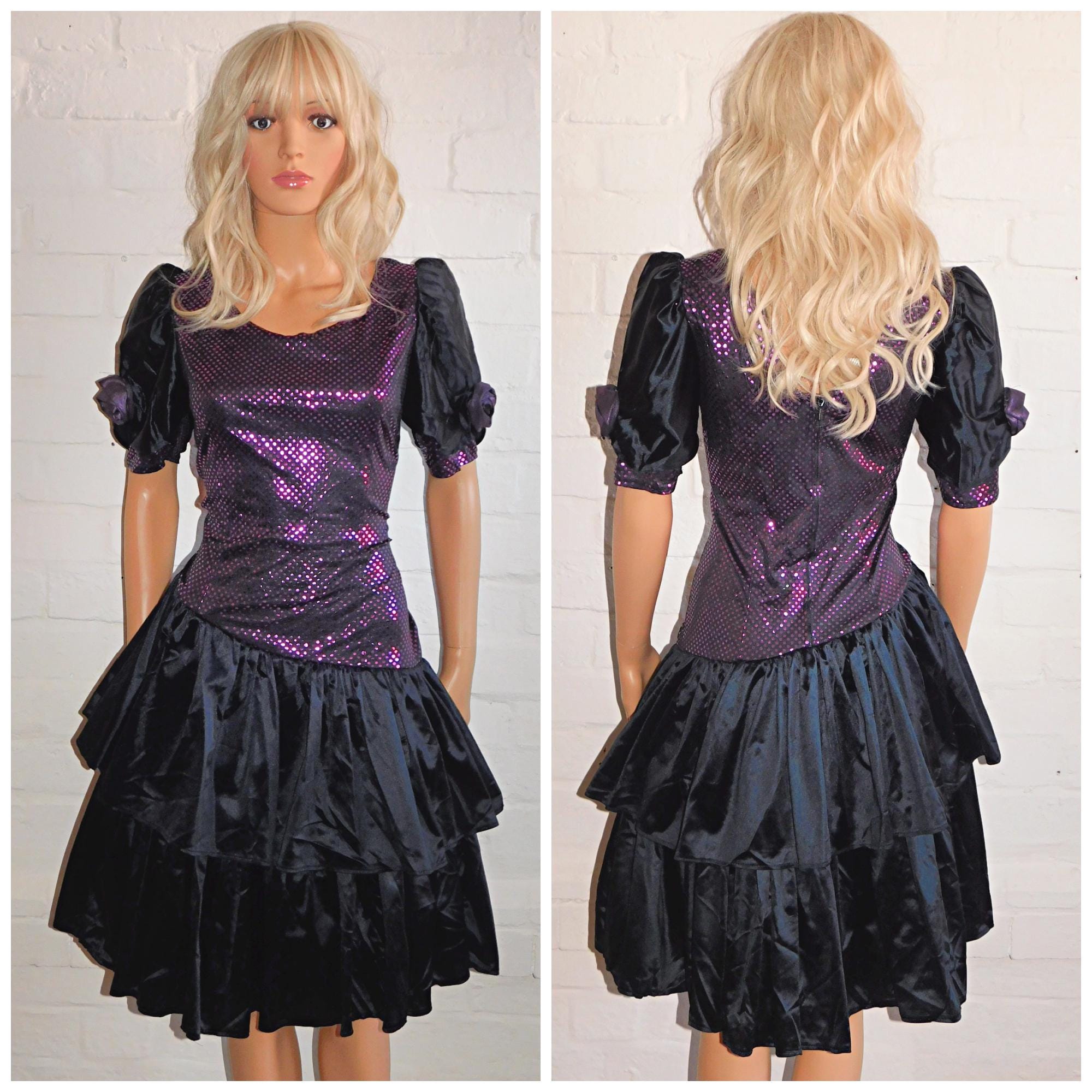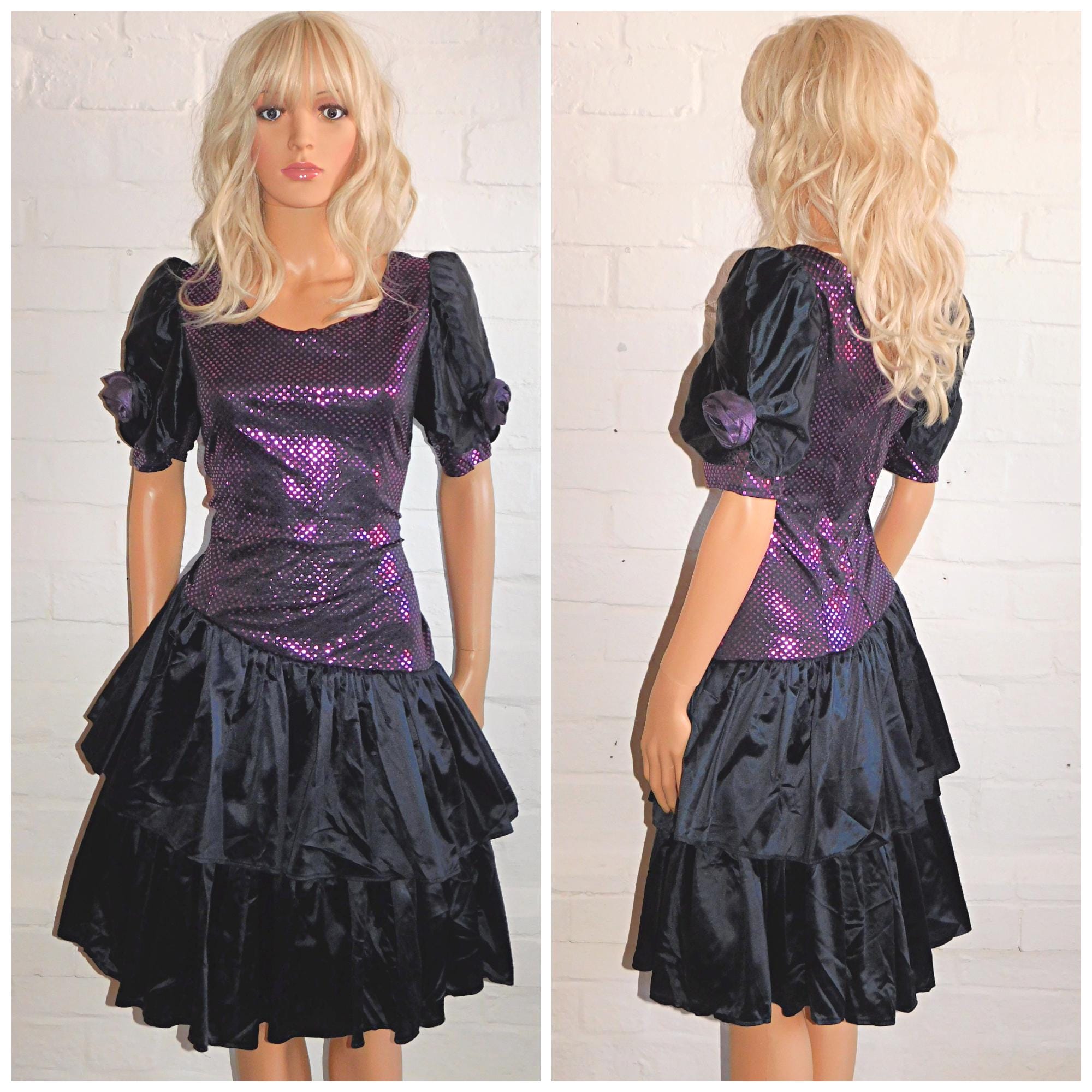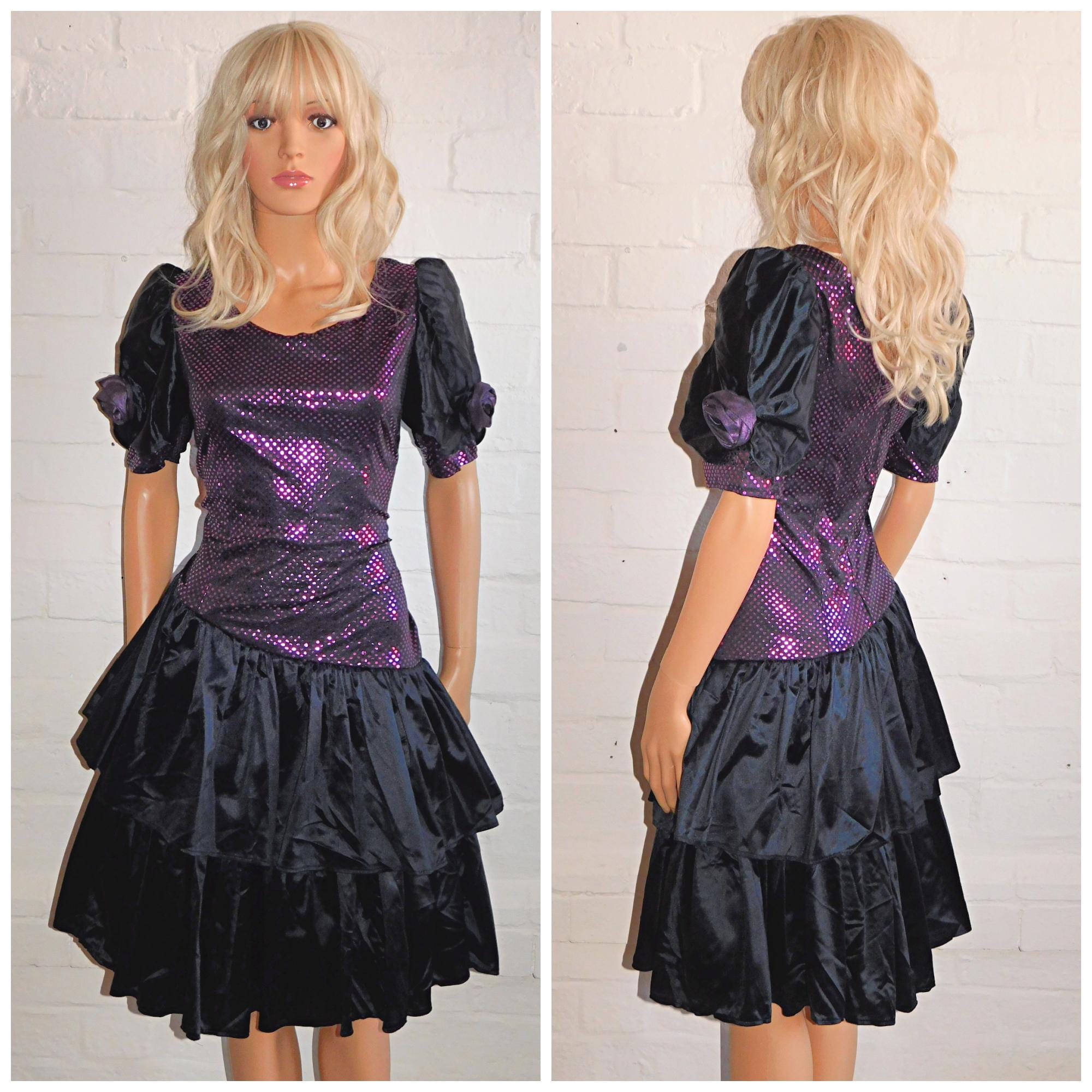 Vintage 80s Black METALLIC Pink Purple Dotty Drop Waist RARA Prom Party Dress 16 L 1980s Kitsch Cocktail Avant Garde Puff Slvd
