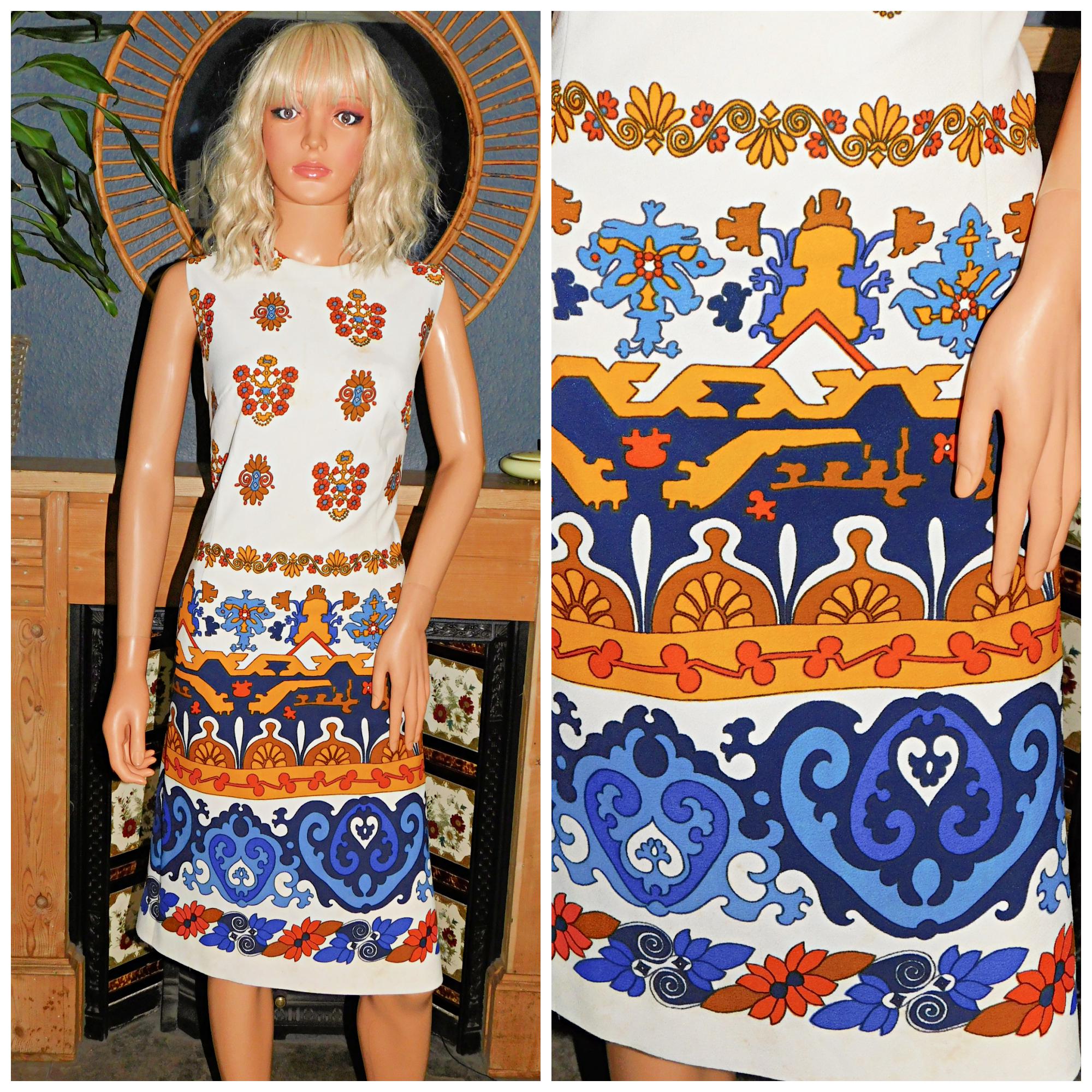 Vintage 60s 70s PSYCHEDELIC Day Dress 14 16 M L 1960s 1970s MOD Cream Yellow Navy