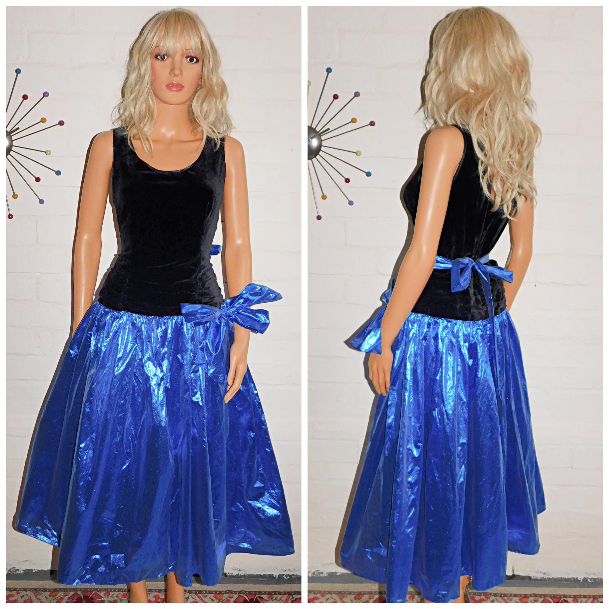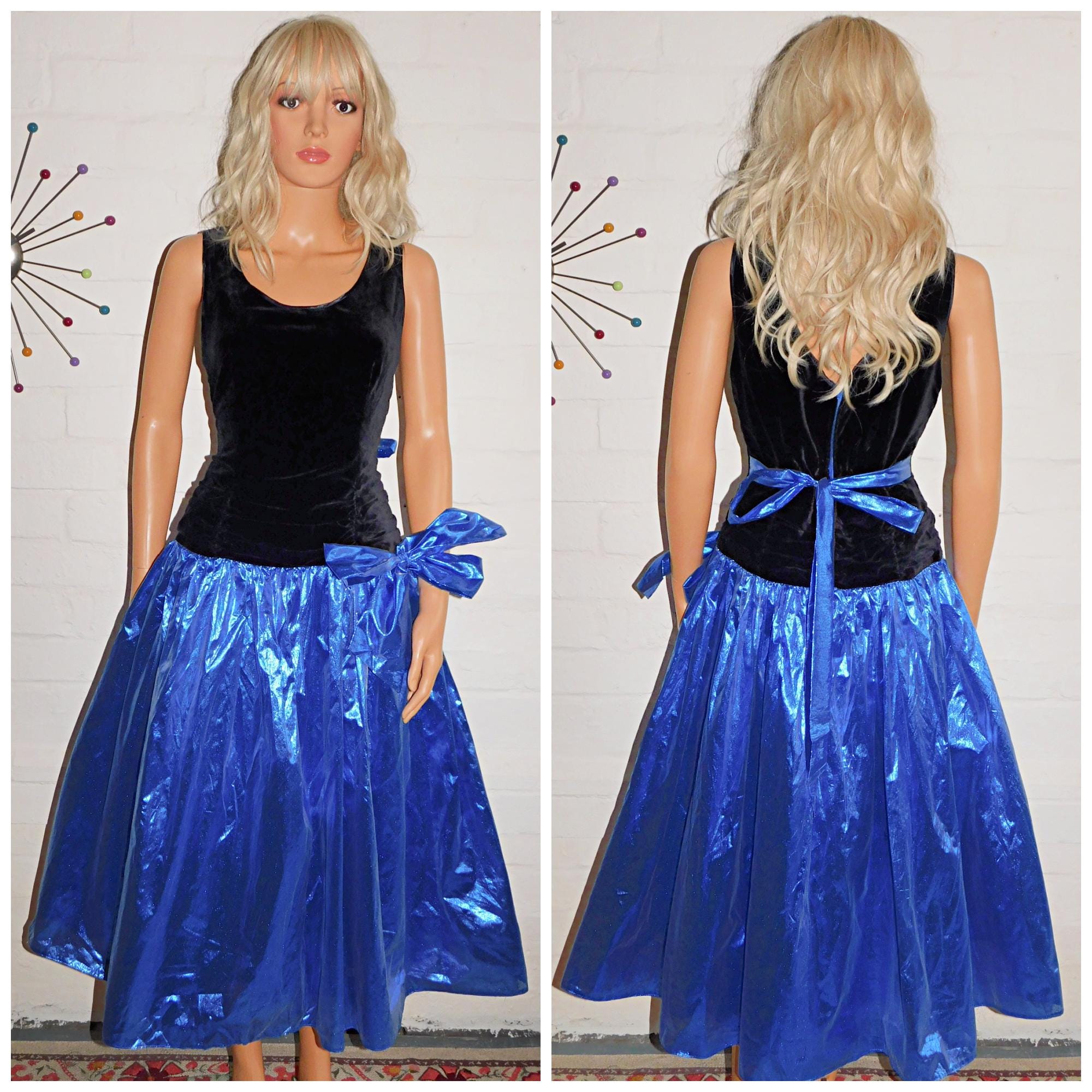 Vintage 80s METALLIC Blue Black BOW Prom Party Dress 10 S 1980s