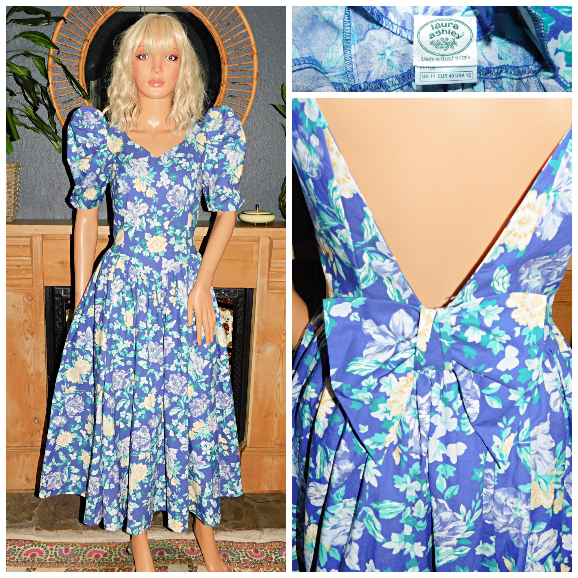Vintage 80s LAURA ASHLEY Blue Yellow BOW Back Floral Cotton Tea Dress 10 12 S M 1980s