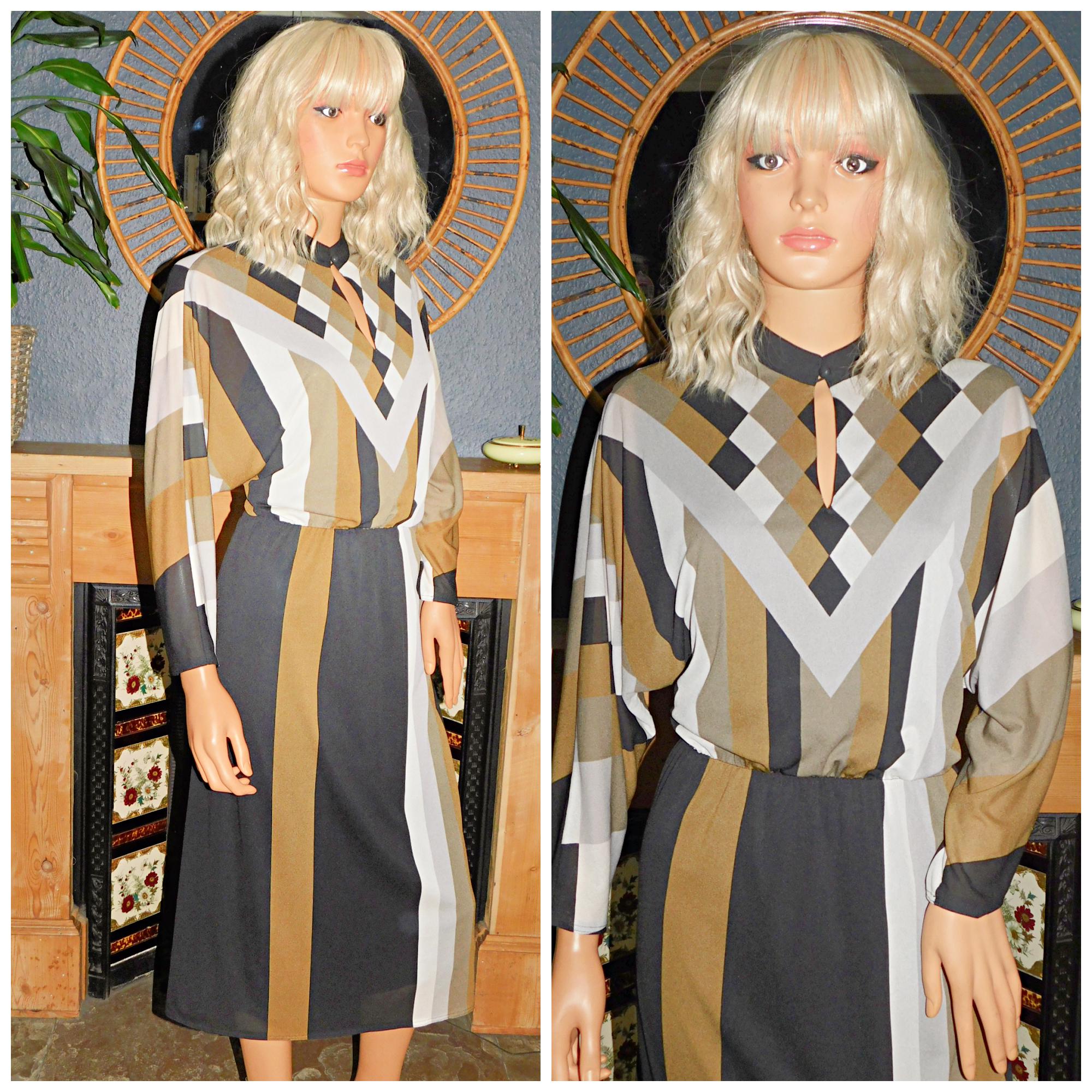 Classic Eighties Nu Wave day dress in a black/khaki/tan/grey geometric stripe