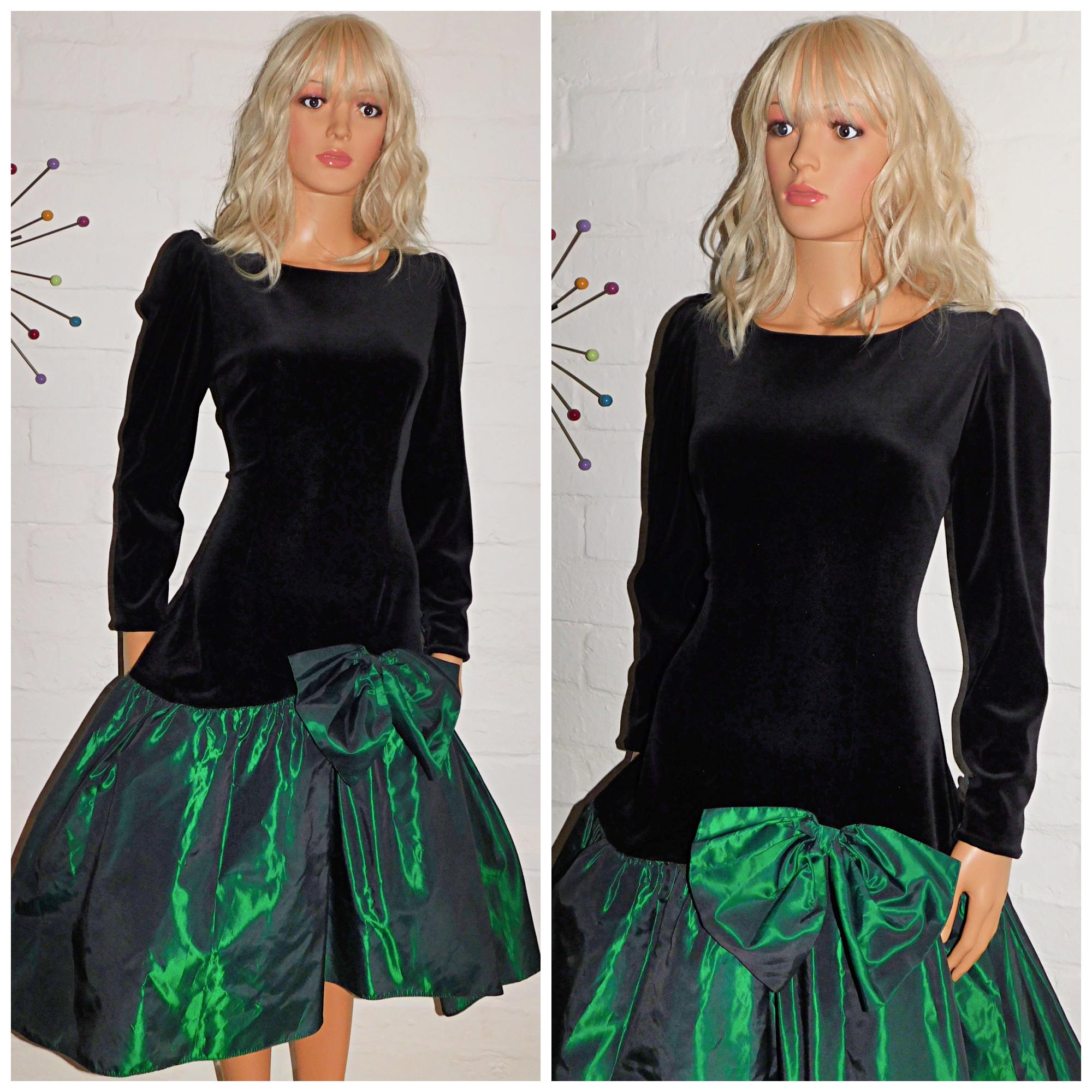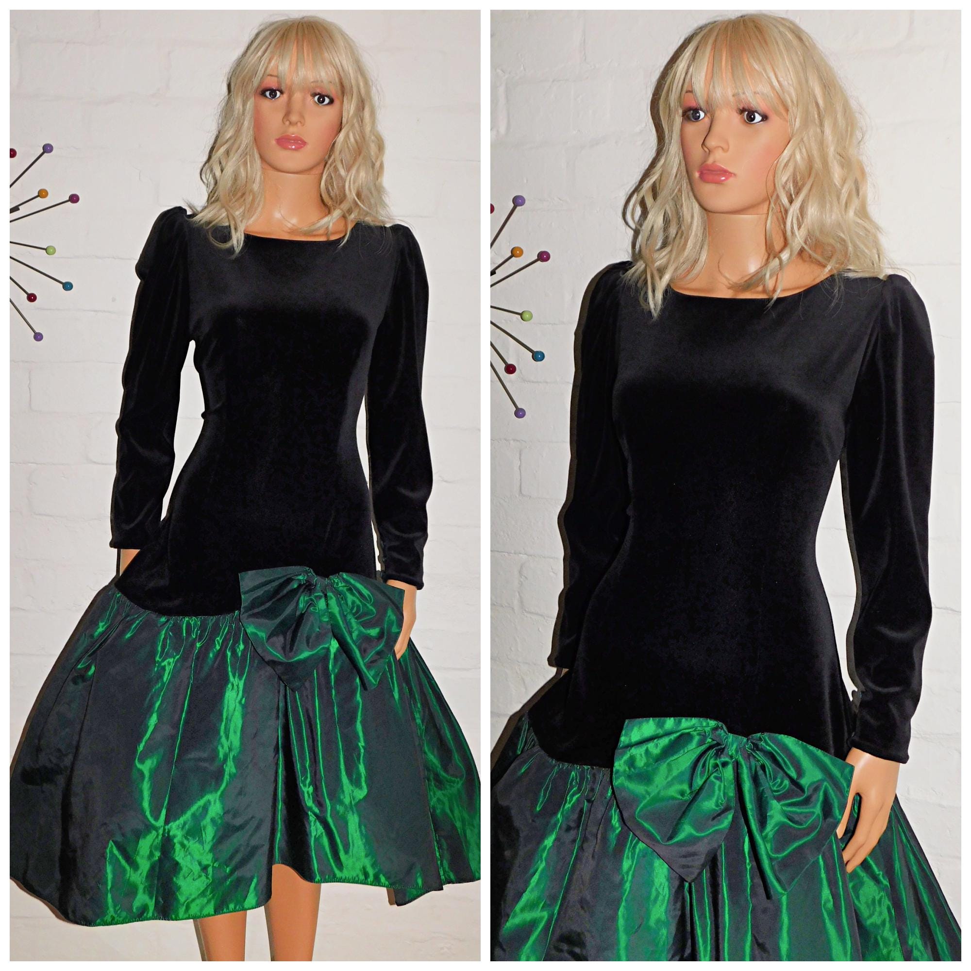 Vintage 80s Black Emerald Green BOW PROM Party Dress 14 16 M L 1980s Kitsch Cocktail Velvet