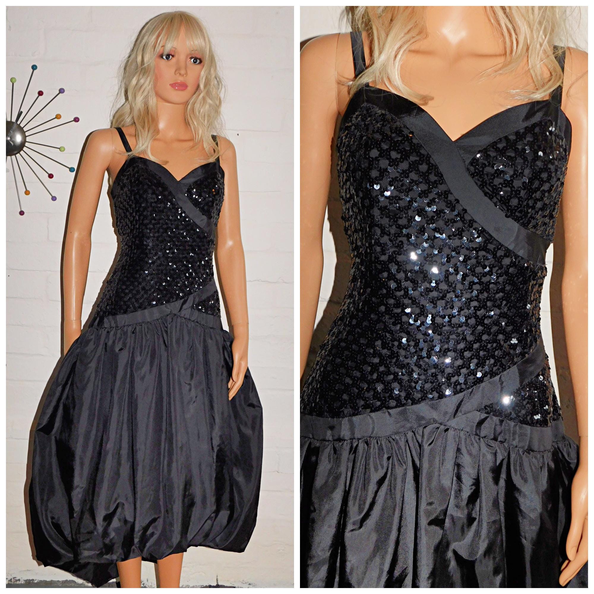 Vintage 1980s Black Sequin Drop Waist BUBBLE Hem Prom Party Dress 10 12 S M 80s KITSCH Puffball